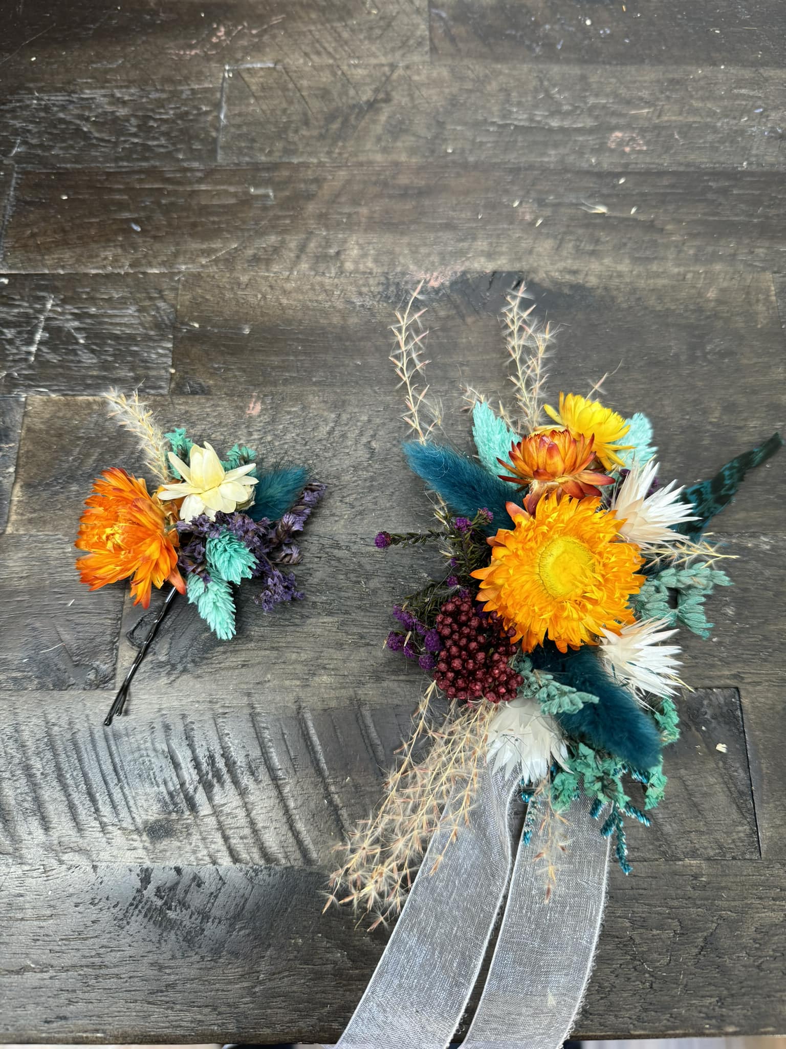 We strive to create every collection as close to the original as possible. These items are hand-crafted. Slight differences from the main photos will occur, as you are not purchasing the photographed items. Your collection is being made to order.. Flower design and fillers may vary due to availability of products.