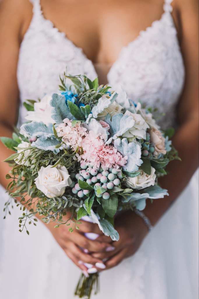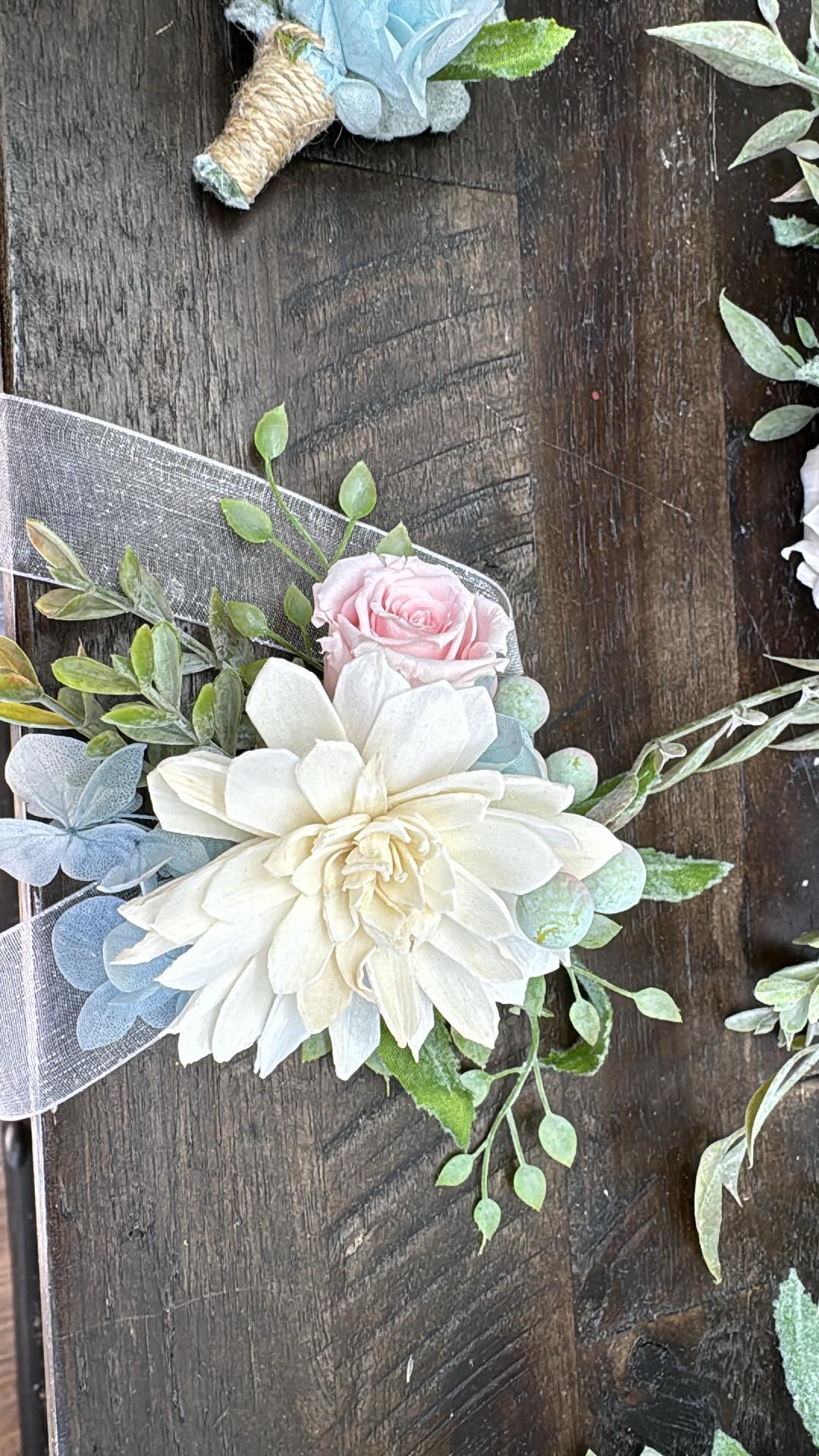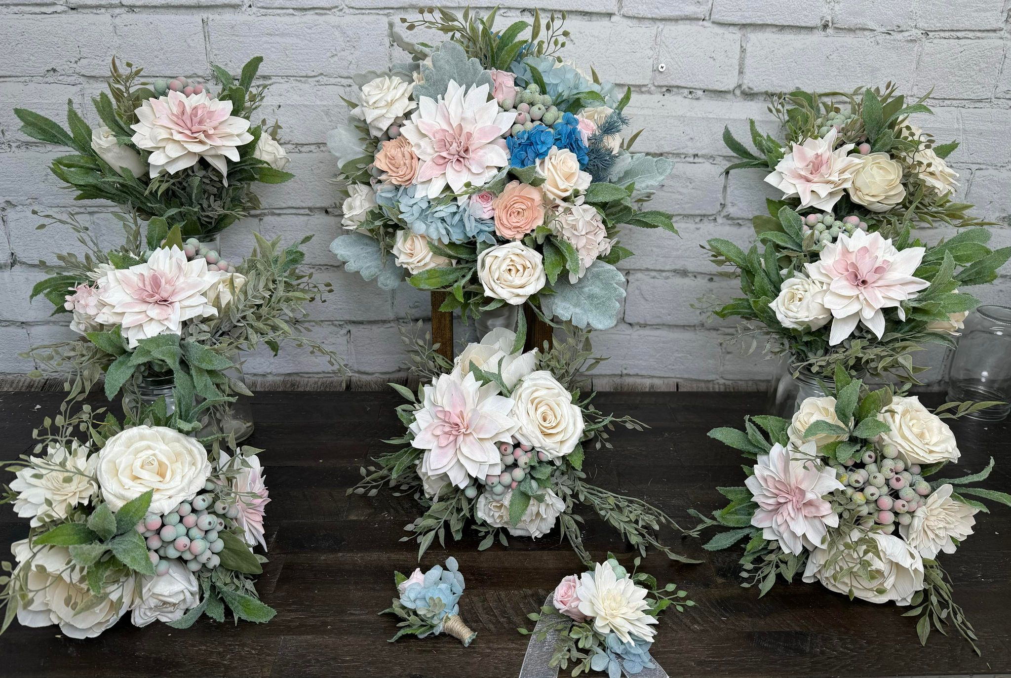 We strive to create every collection as close to the original as possible. These items are hand-crafted. Slight differences from the main photos will occur, as you are not purchasing the photographed items. Your collection is being made to order.. Flower design and fillers may vary due to availability of products.