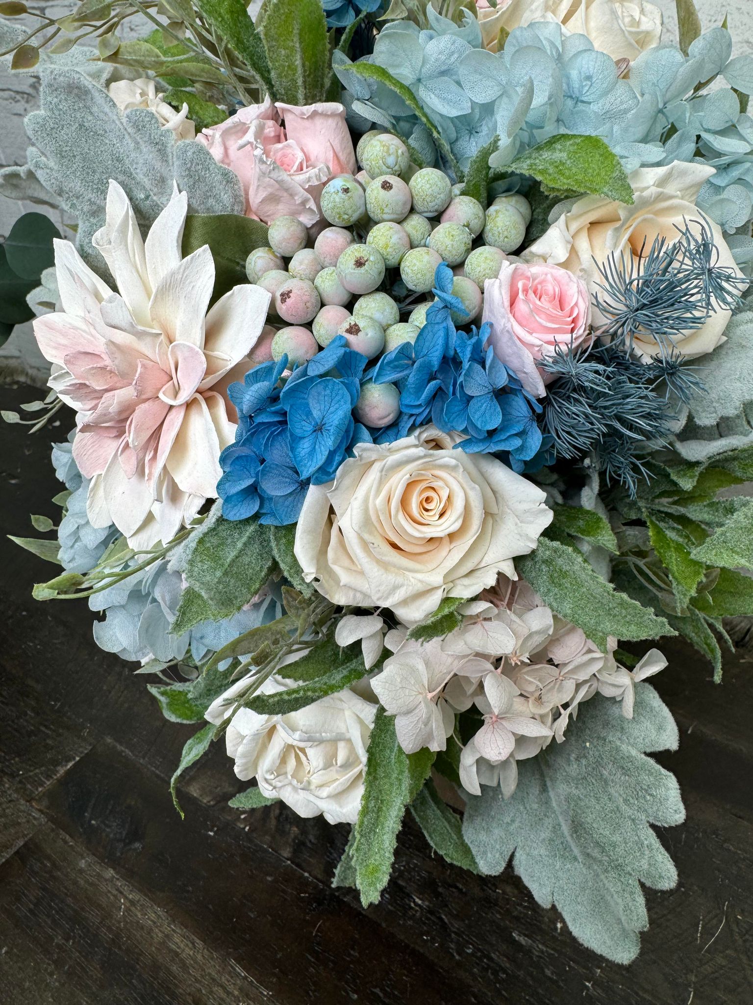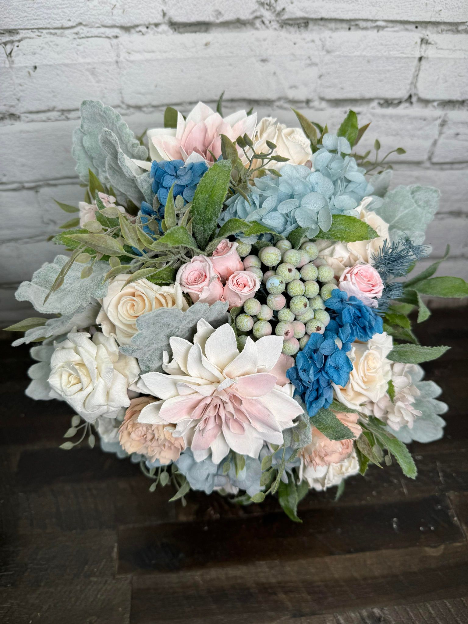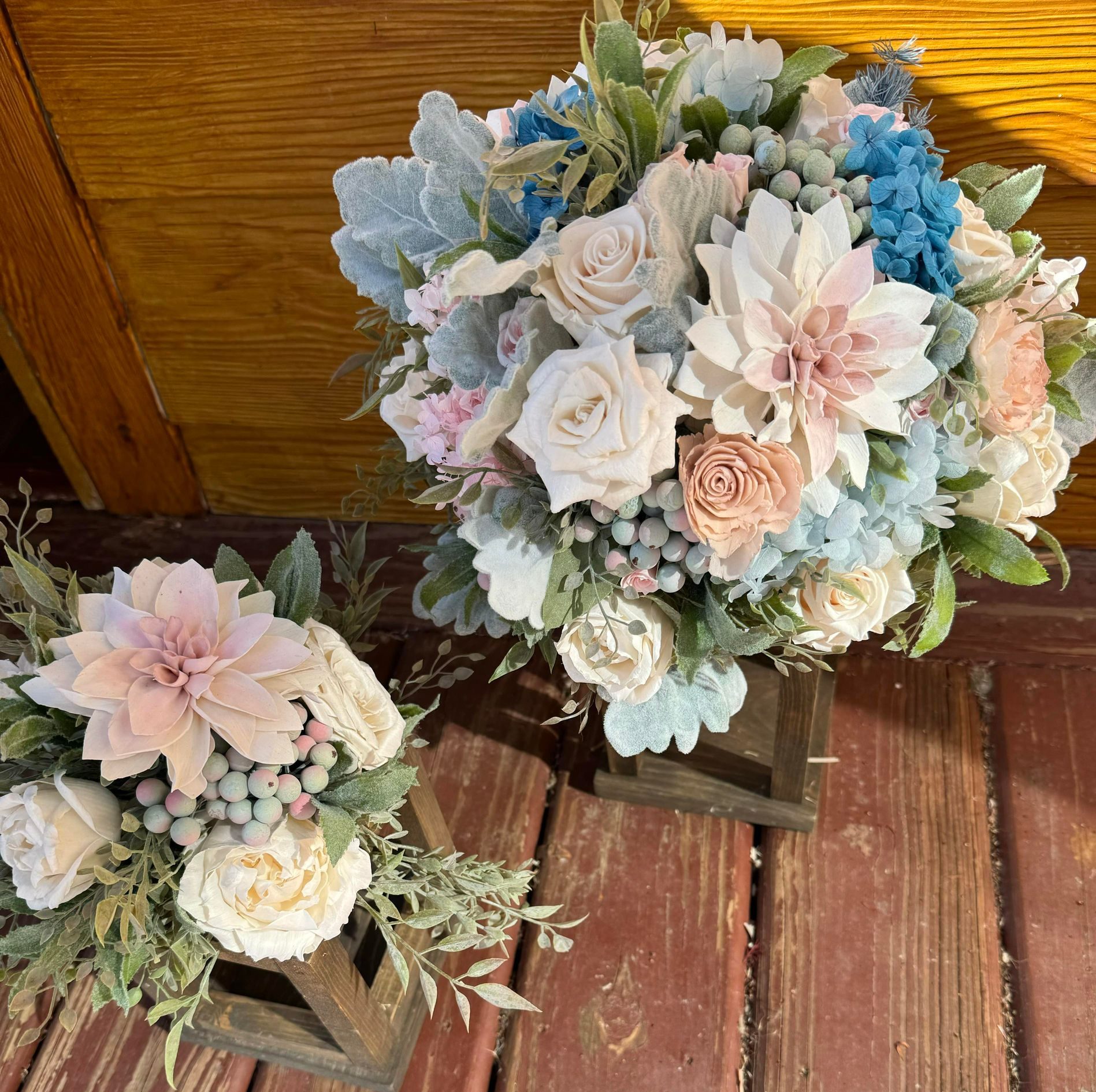 April Showers Collection:: April showers bring May flowers, and budding new collections! This set of hand dyed wood flowers is finished with real preserved hydrangeas, and fillers. Spring into your wedding with our "April Showers" Collection!