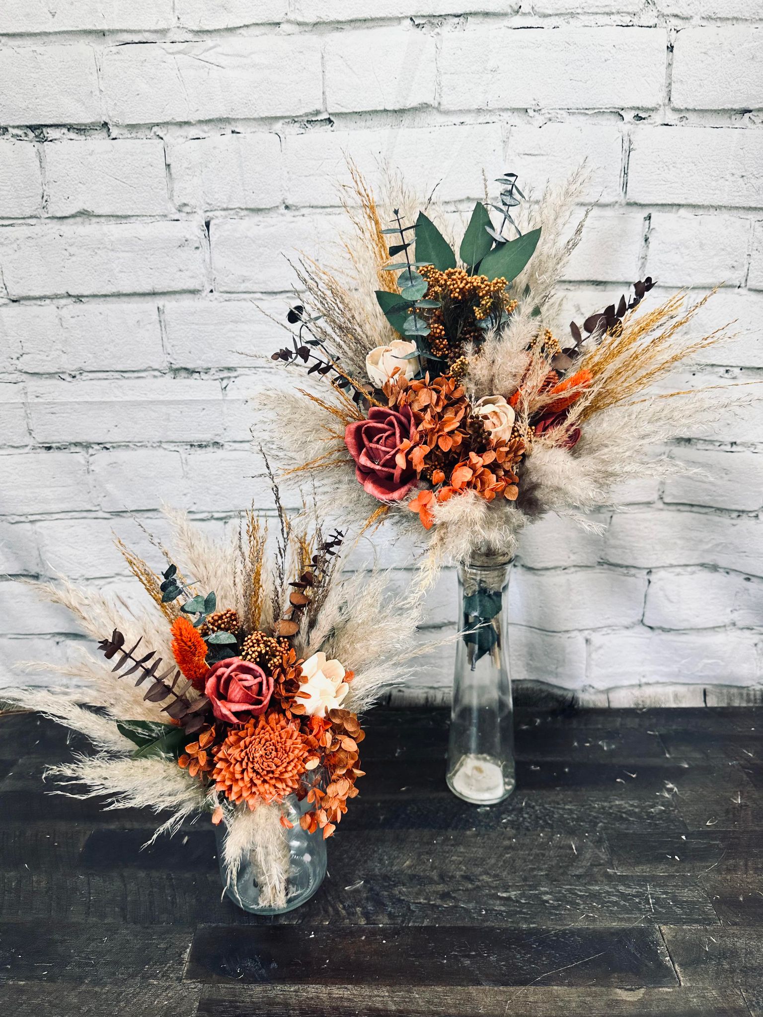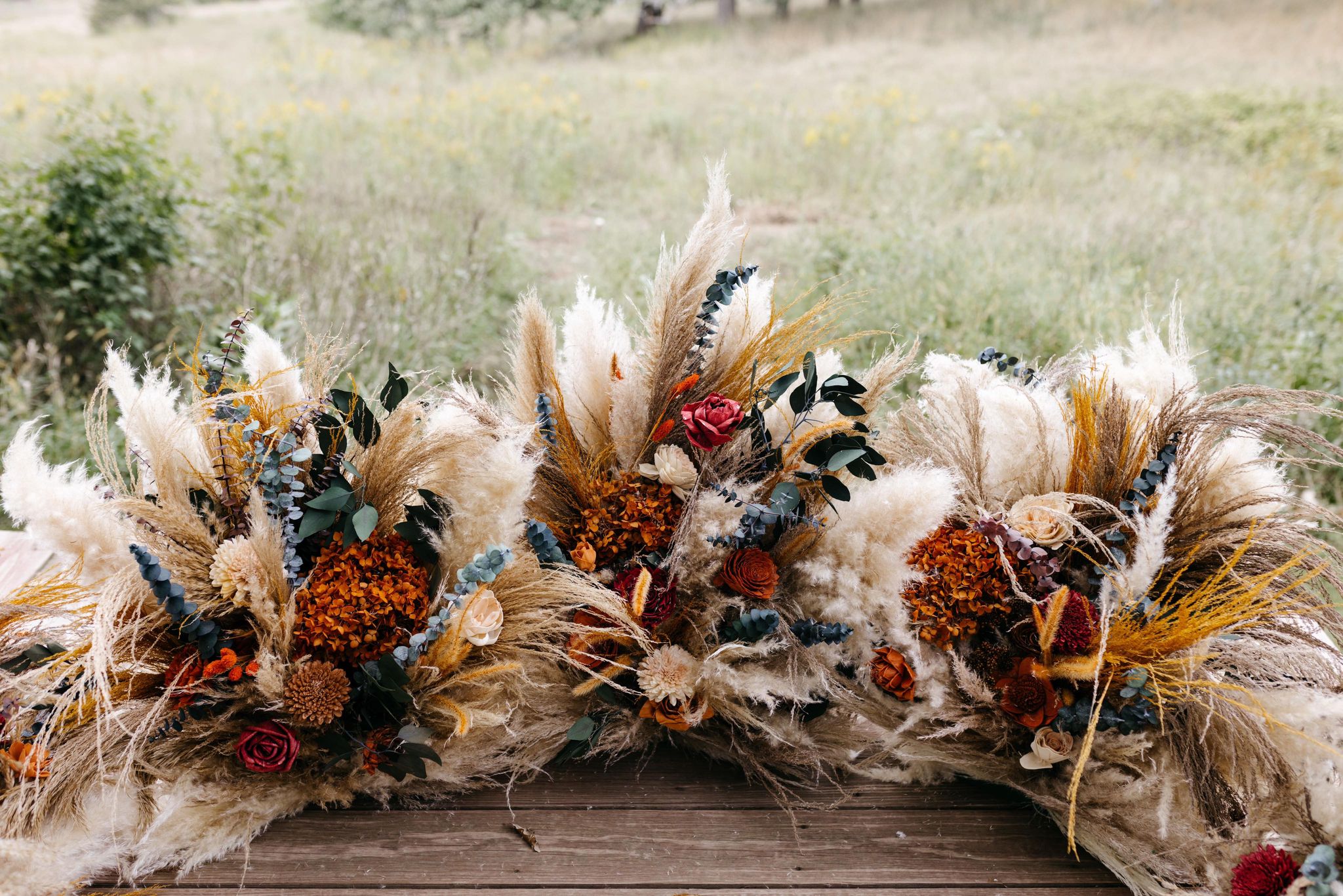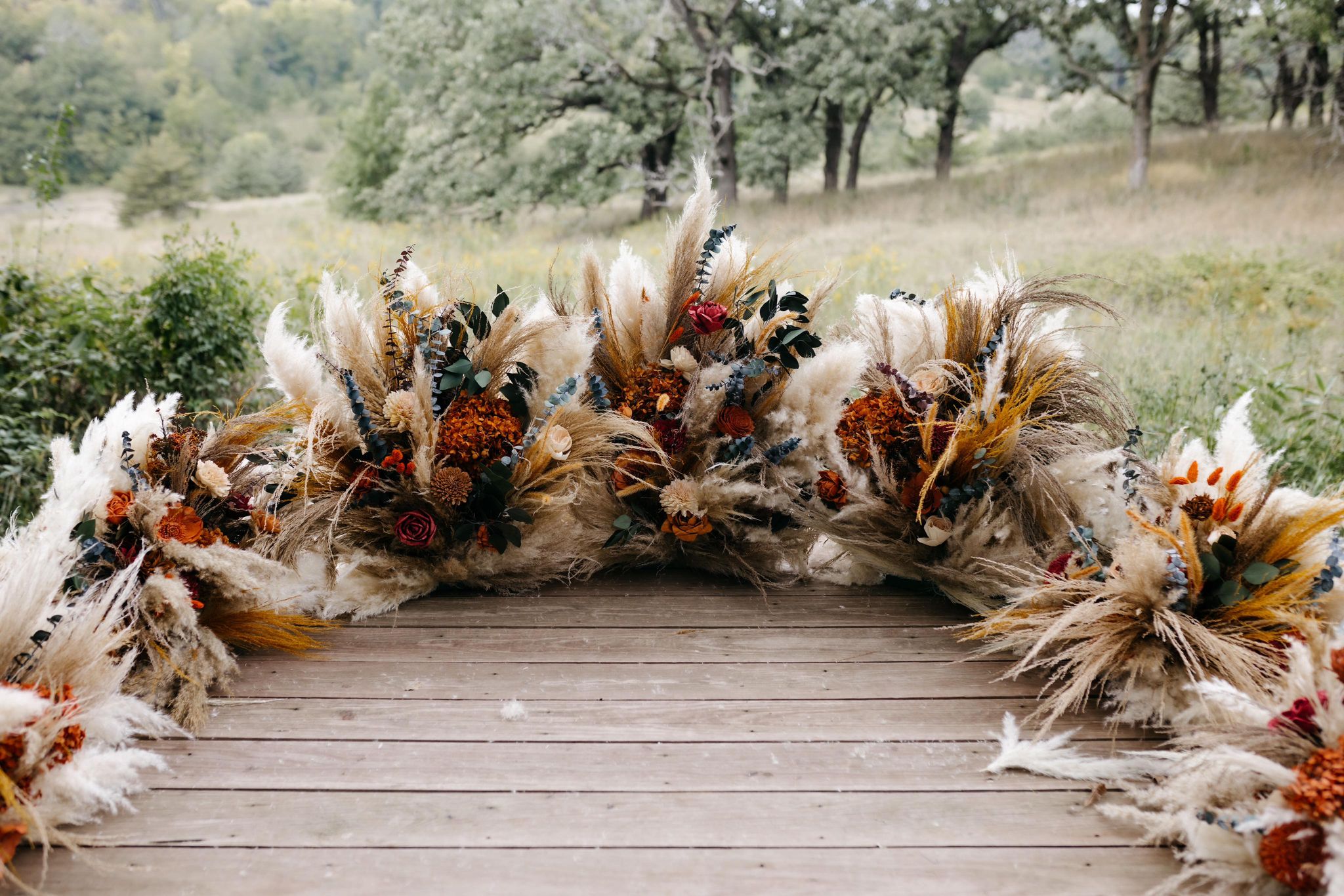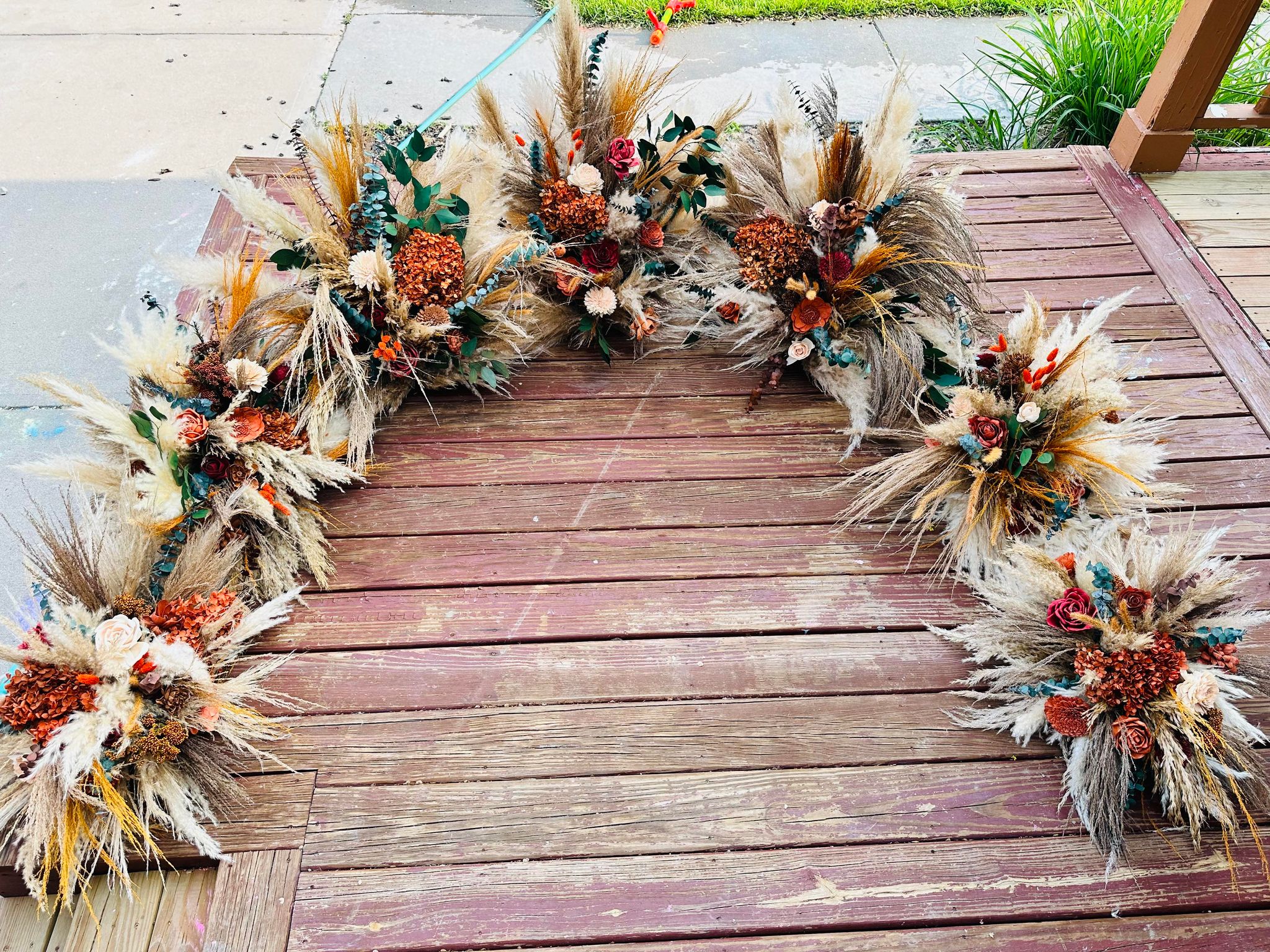 Arcadia Collection:: Stepping into your wedding venue, will be like walking into a new world! This array of hand dyed wood flowers are surrounded by all real preserved pampas, hydrangeas, spiral & silver dollar eucalyptus, and natural dried fillers. Let our Arcadia Collection make your special day, a magical one!