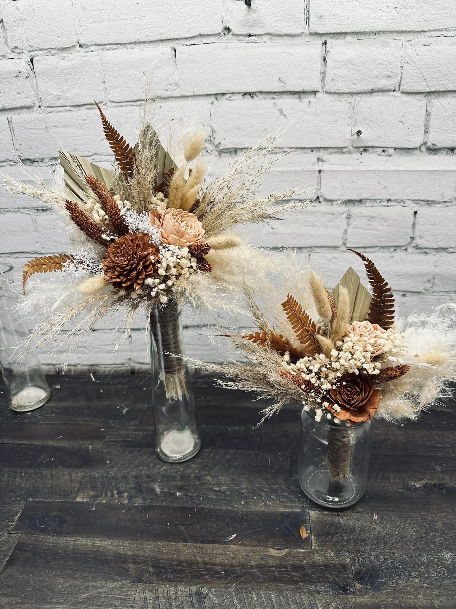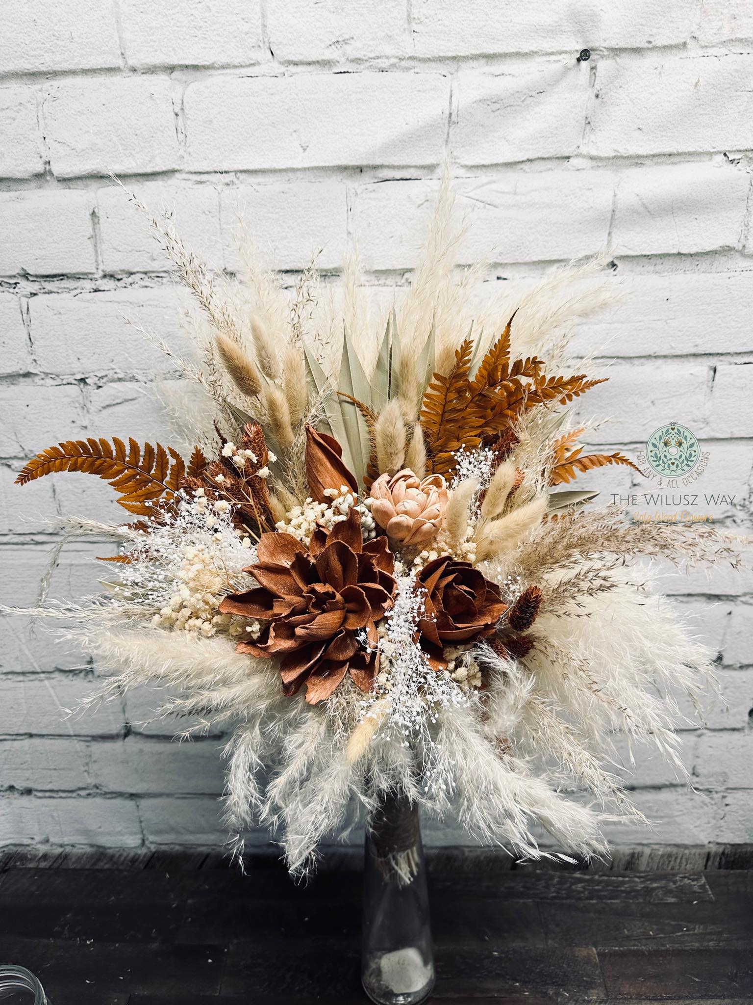 Autumn Breeze Collection:: Romance is in the air! This warm color palette of wood flowers is fluffed up with real preserved pampas, bunny tails, babies' breath, sun palms, ferns and natural dried fillers. Celebrate your special day in real fall style with our Autumn Breeze Collection.
