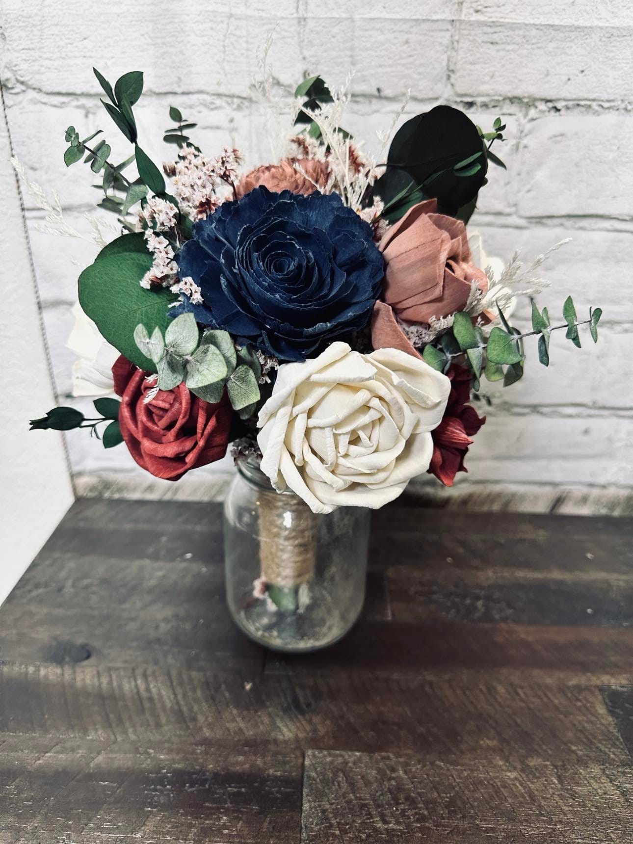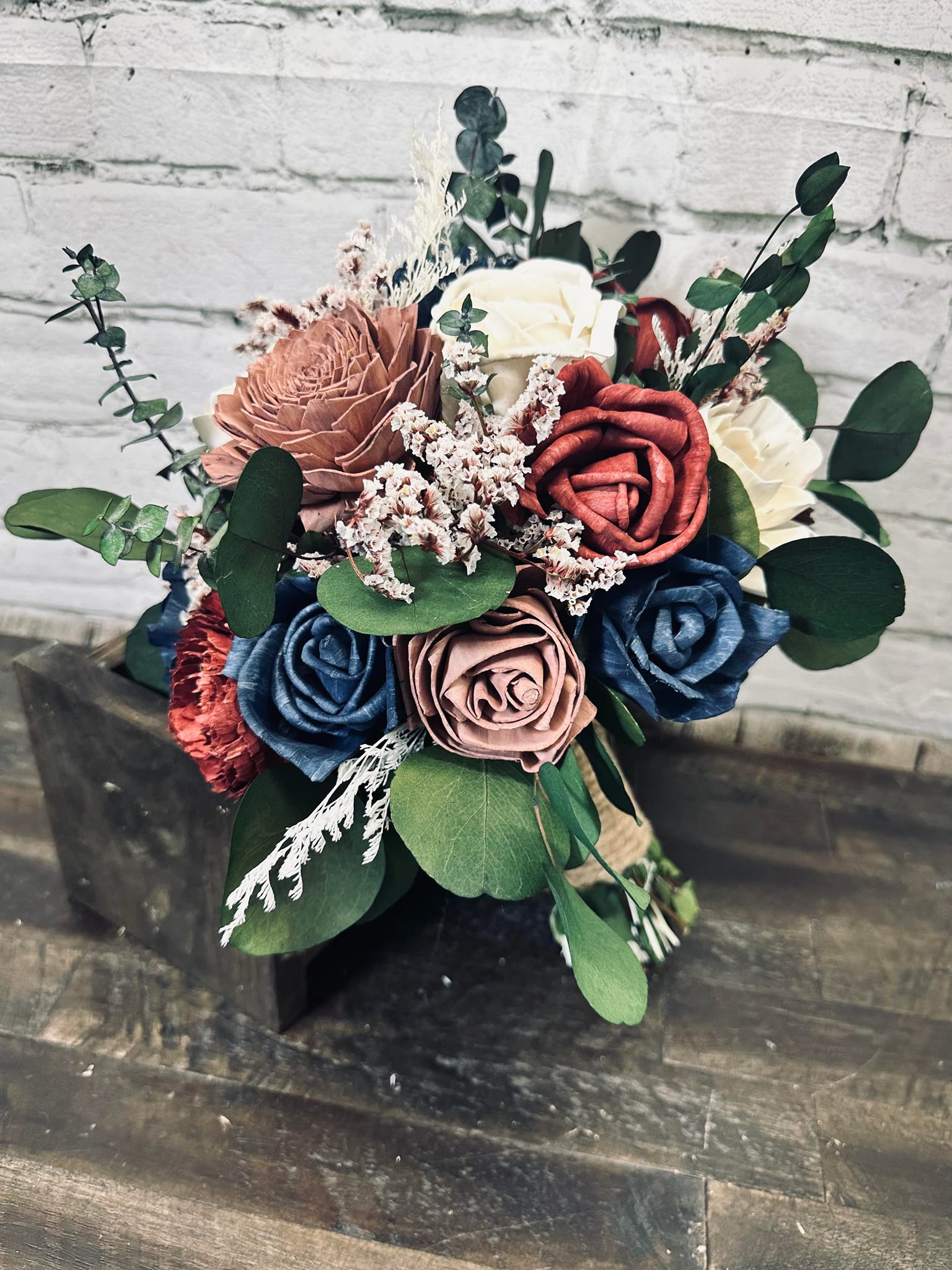 We strive to create every collection as close to the original as possible. These items are hand-crafted. Slight differences from the main photos will occur, as you are not purchasing the photographed items. Your collection is being made to order.. Flower design and fillers may vary due to availability of products.