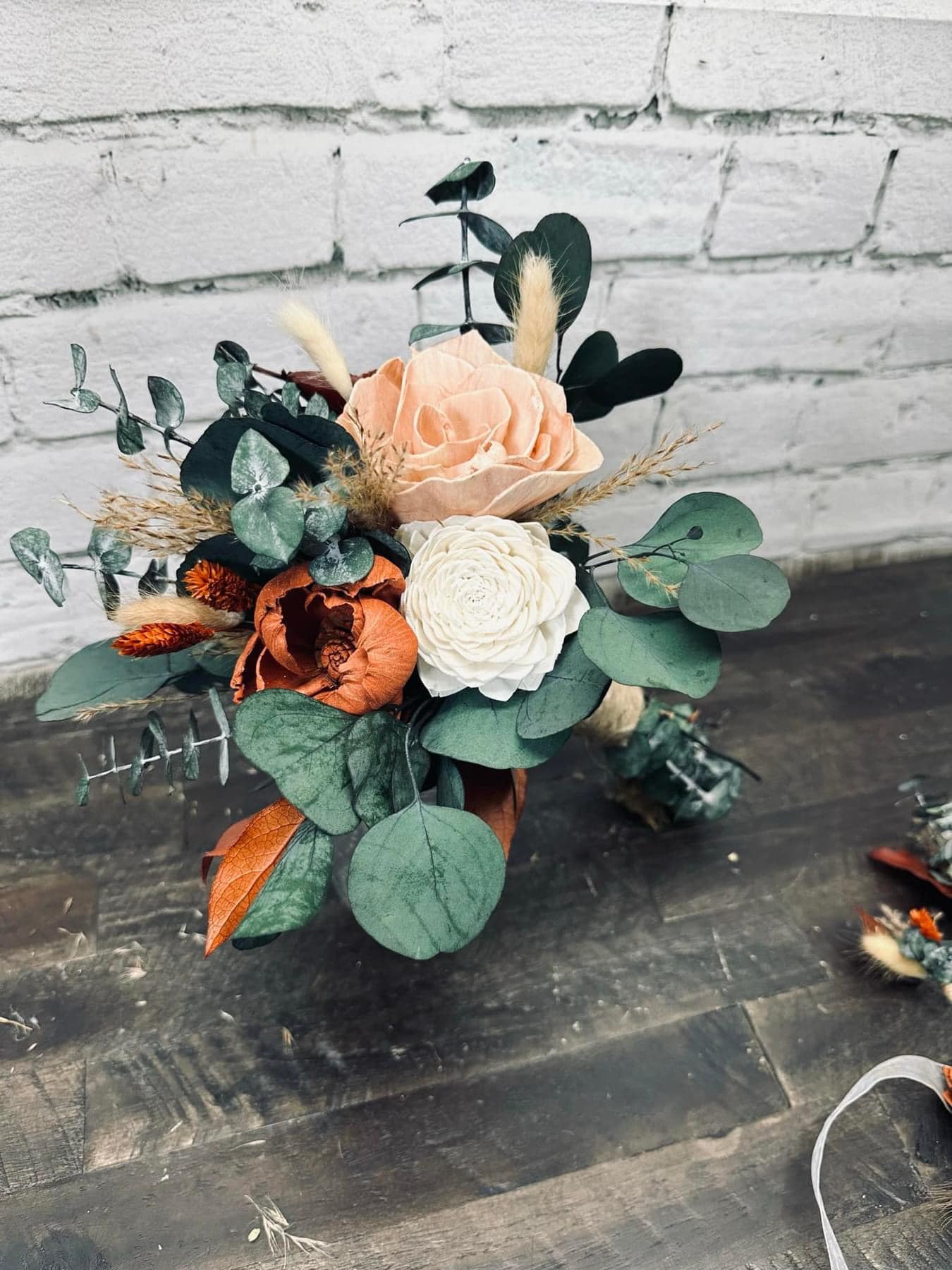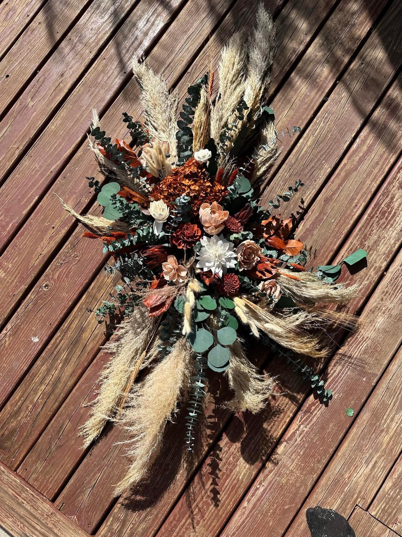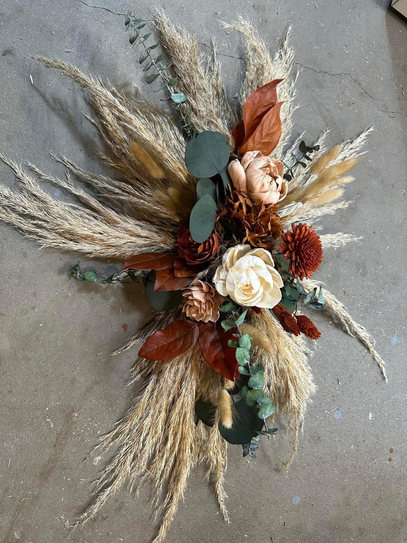 Shimmering Fall Collection:: A whole lotta warmth, with a soft terracotta accent, for a unique boho look! This collection of hand dyed wood flowers is finished with real preserved pampas, hydrangeas, spiral & silver dollar eucalyptus, bunny tails, salal, and a splash of natural dried fillers. Our Shimmering Fall Collection is a romantic set to give your style an edge above the rest!