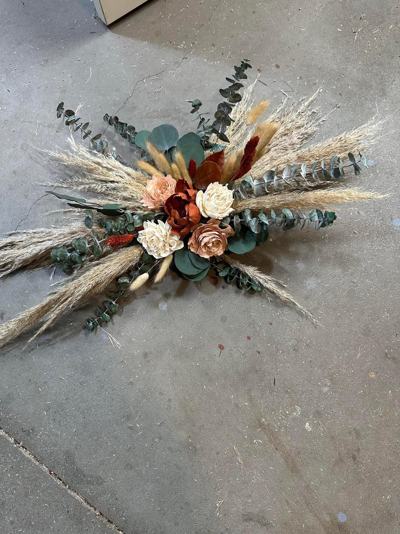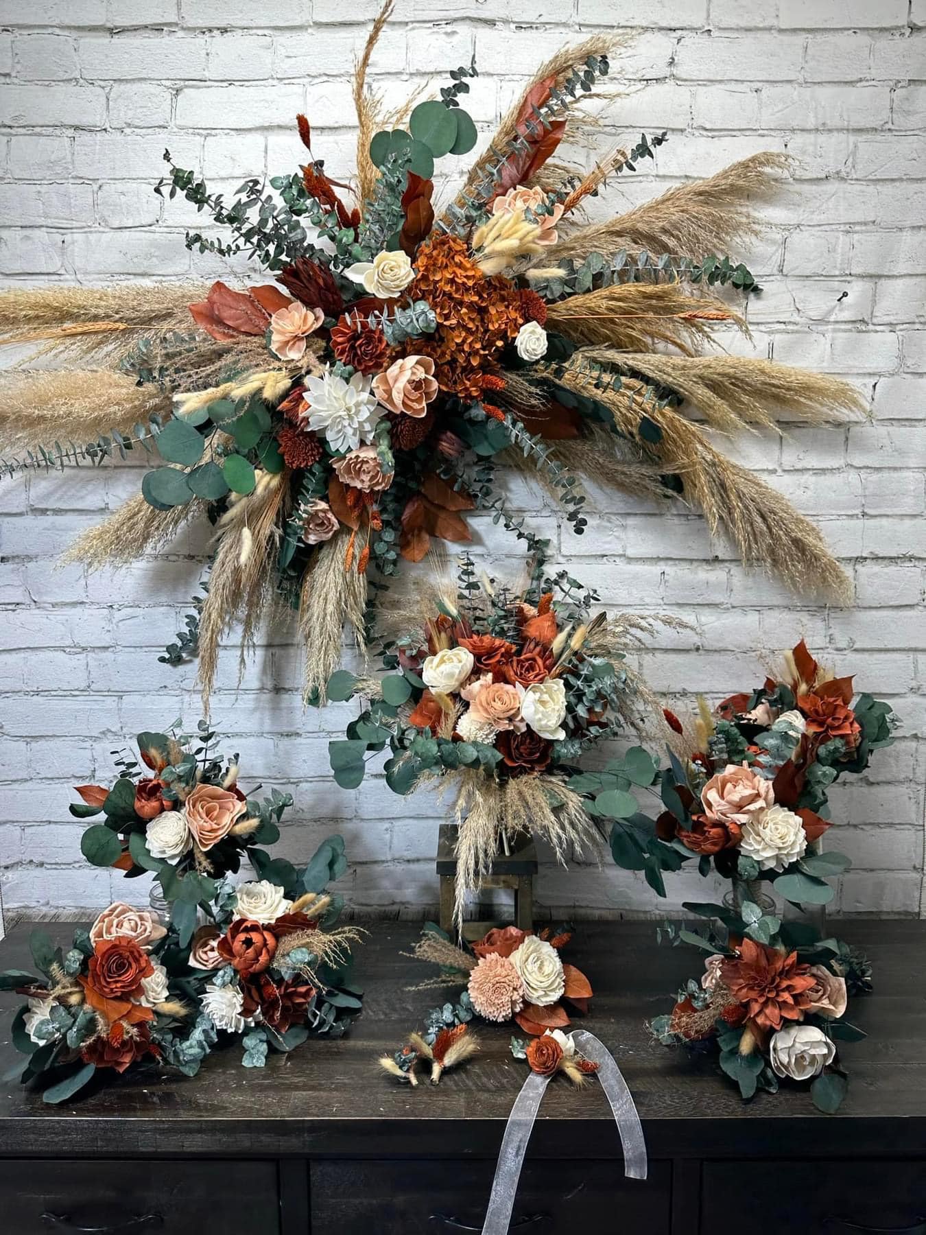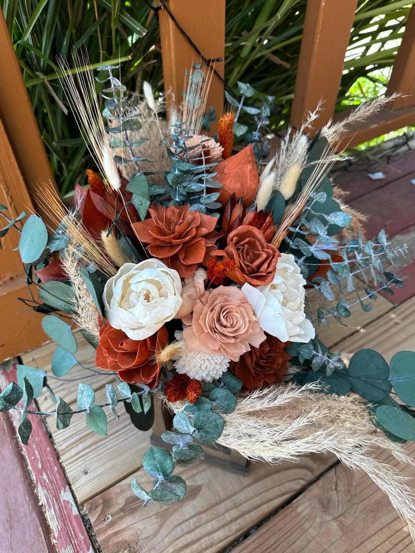 Shimmering Fall Collection:: A whole lotta warmth, with a soft terracotta accent, for a unique boho look! This collection of hand dyed wood flowers is finished with real preserved pampas, hydrangeas, spiral & silver dollar eucalyptus, bunny tails, salal, and a splash of natural dried fillers. Our Shimmering Fall Collection is a romantic set to give your style an edge above the rest!