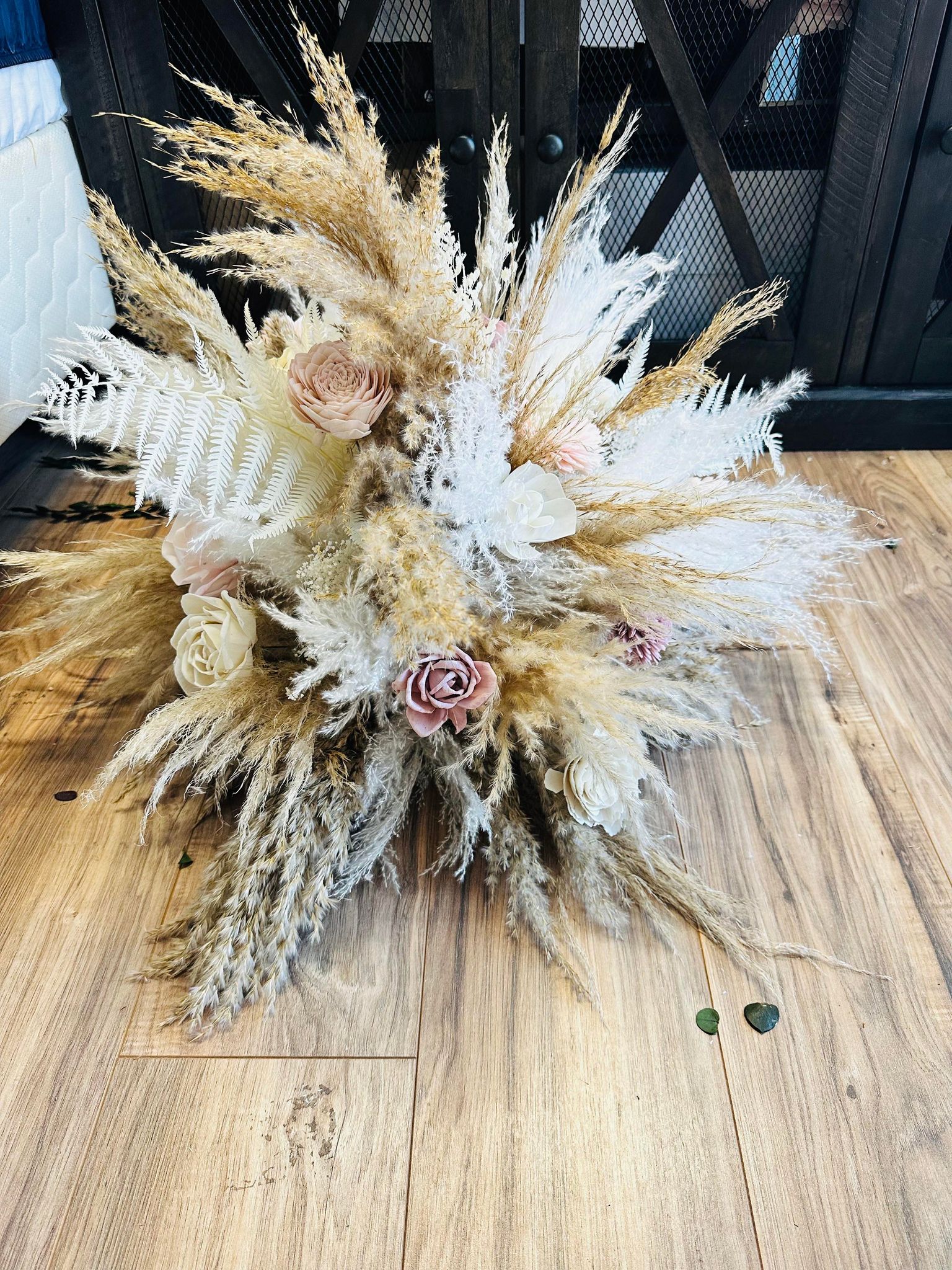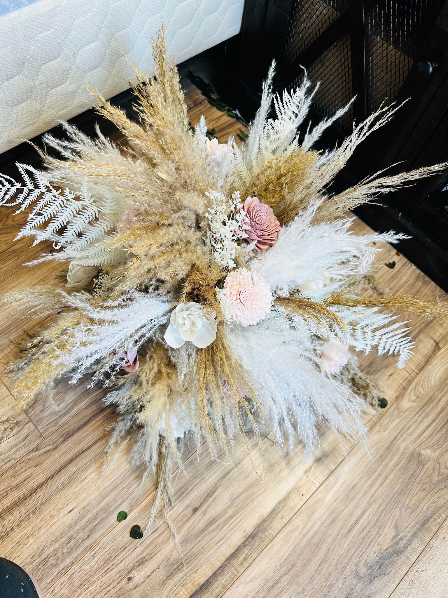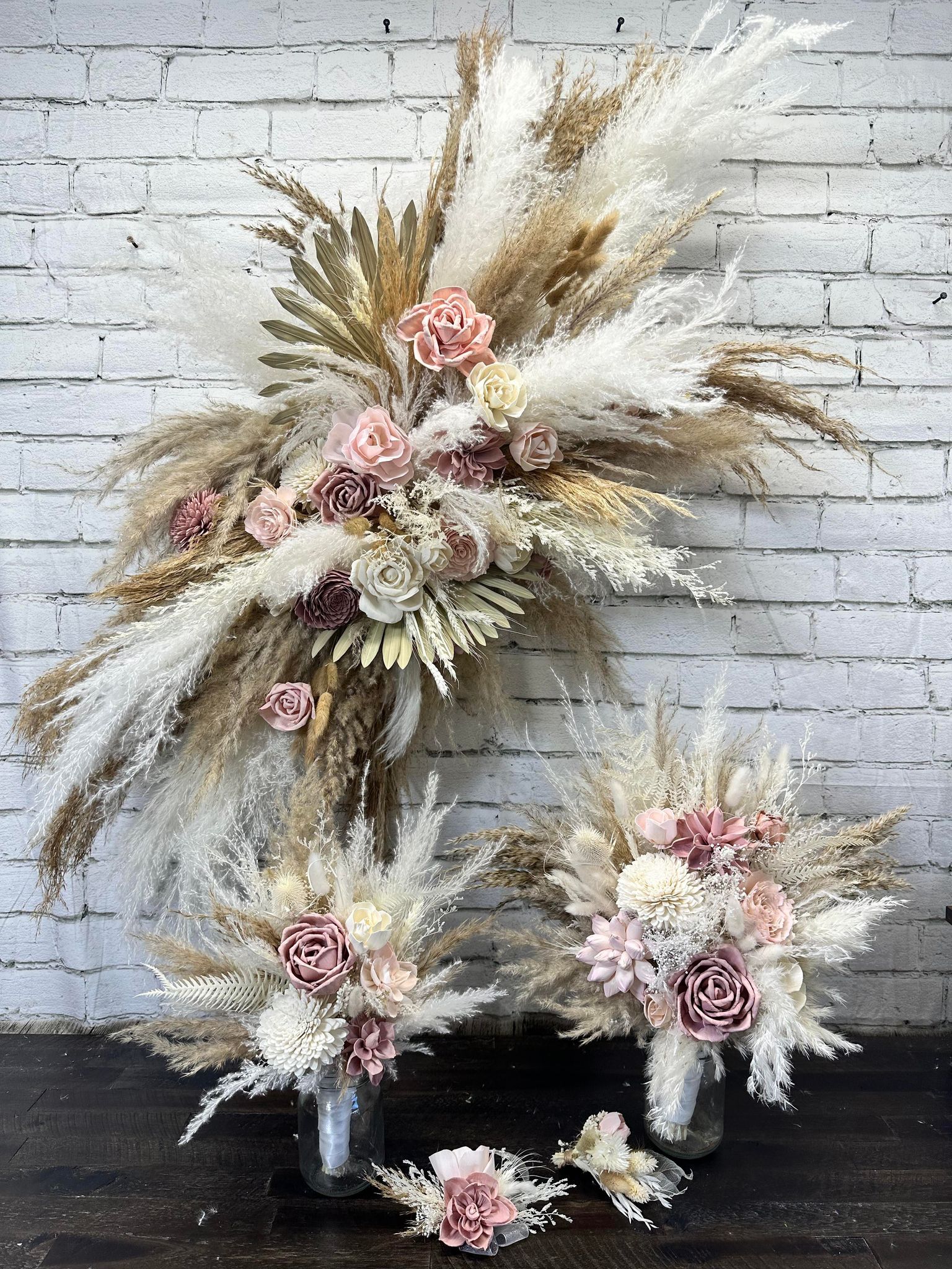 Blush Petals Collection:: Romantic boho is so in! With a soft color palette of wood flowers, surrounded by real preserved pampas, whisk, white ferns, and other natural dried fillers. Our Blush Petals Collection is the perfect set for your day of love!