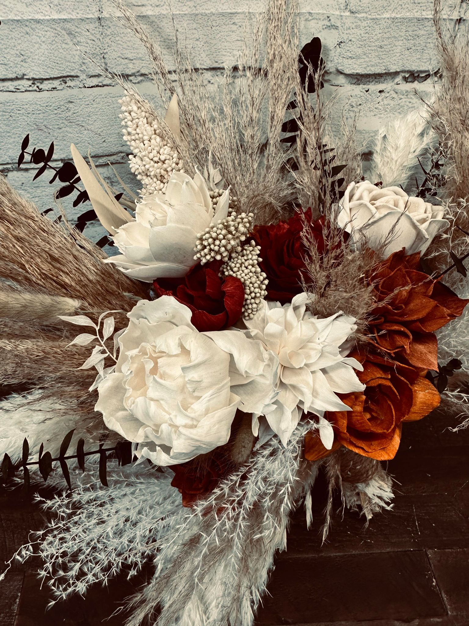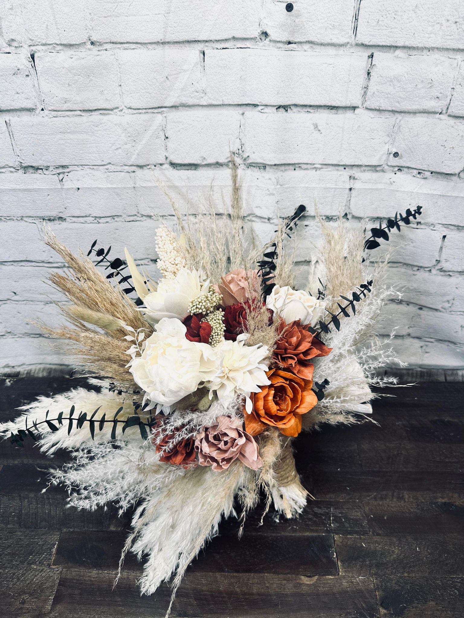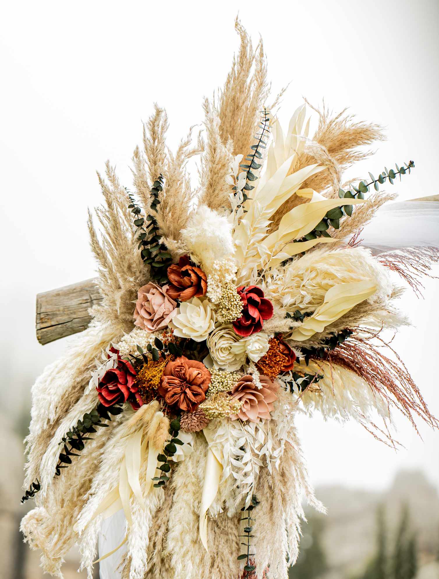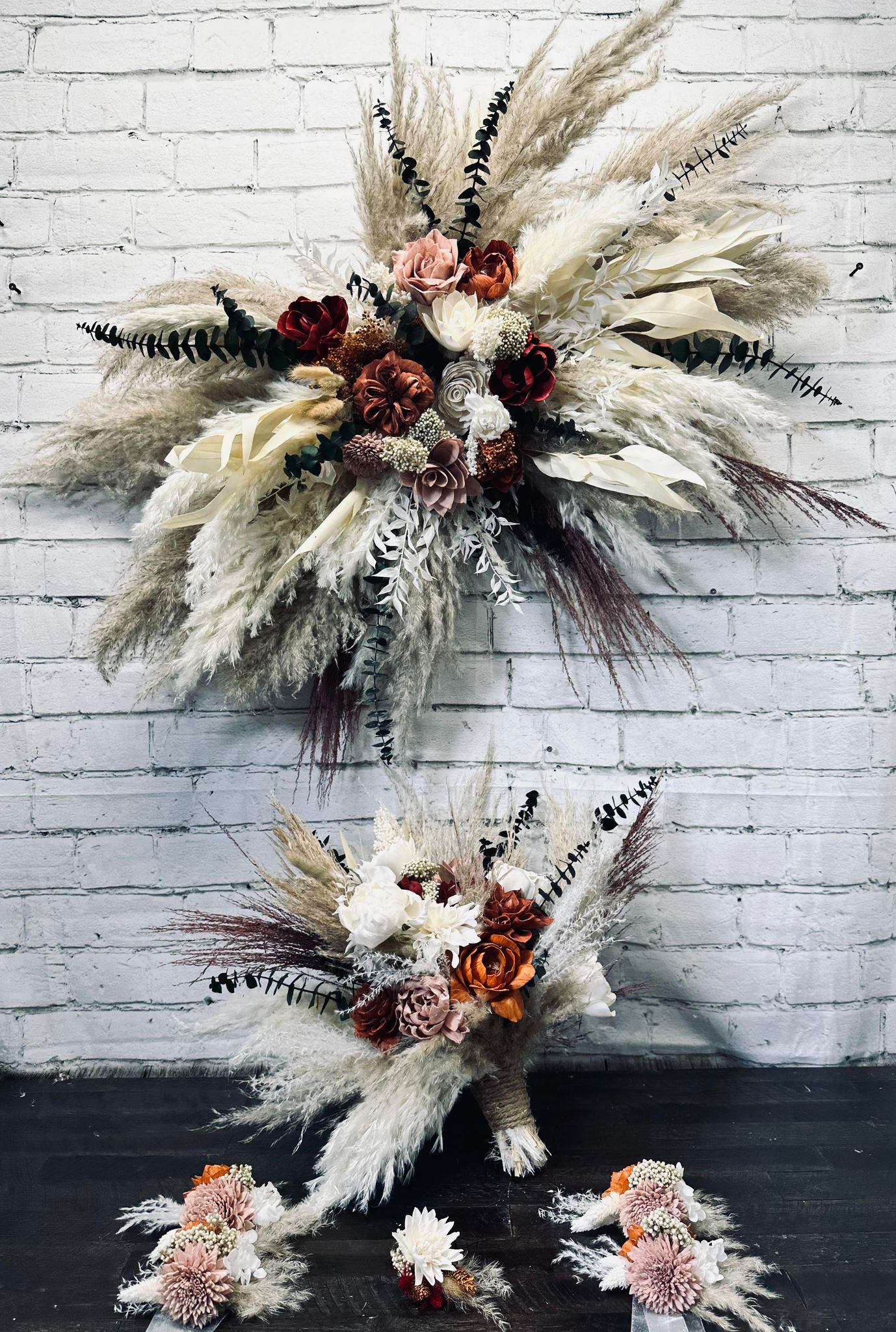 Boho Whisper Collection:: Rustic boho, with a romantic twist! This variety of hand dyed wood flowers are surrounded by real preserved pampas, spiral eucalyptus, ruscus, and natural dried fillers. Our Boho Whisper Collection is a perfect set to complete your wedding day vision!