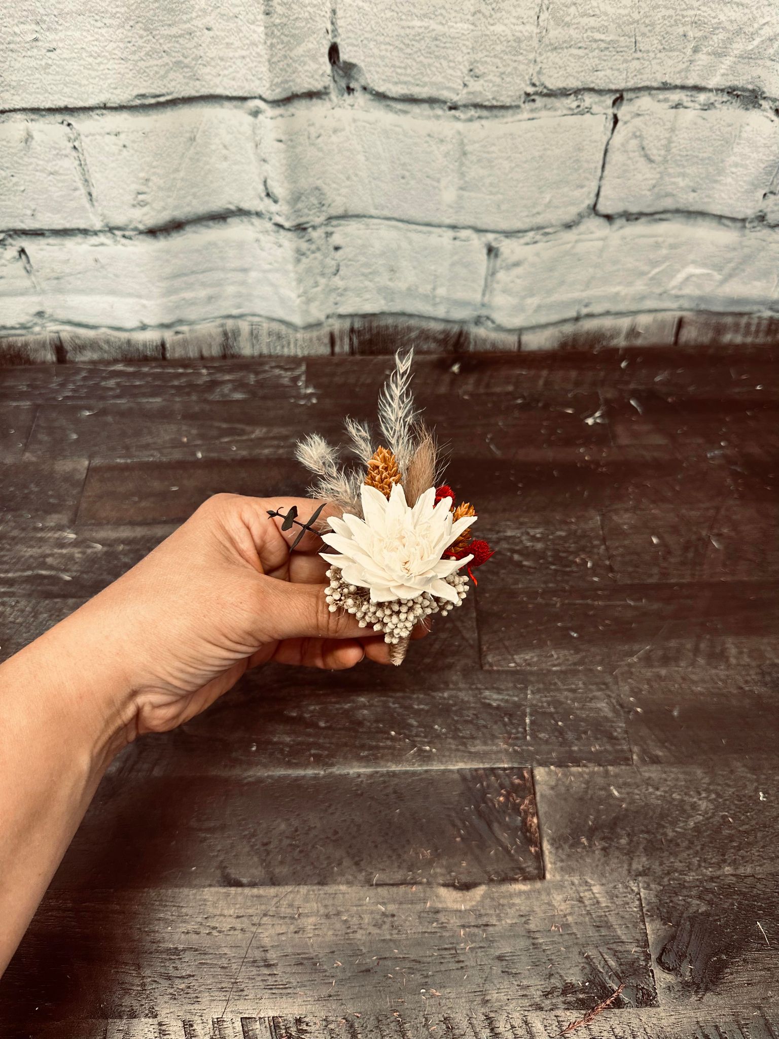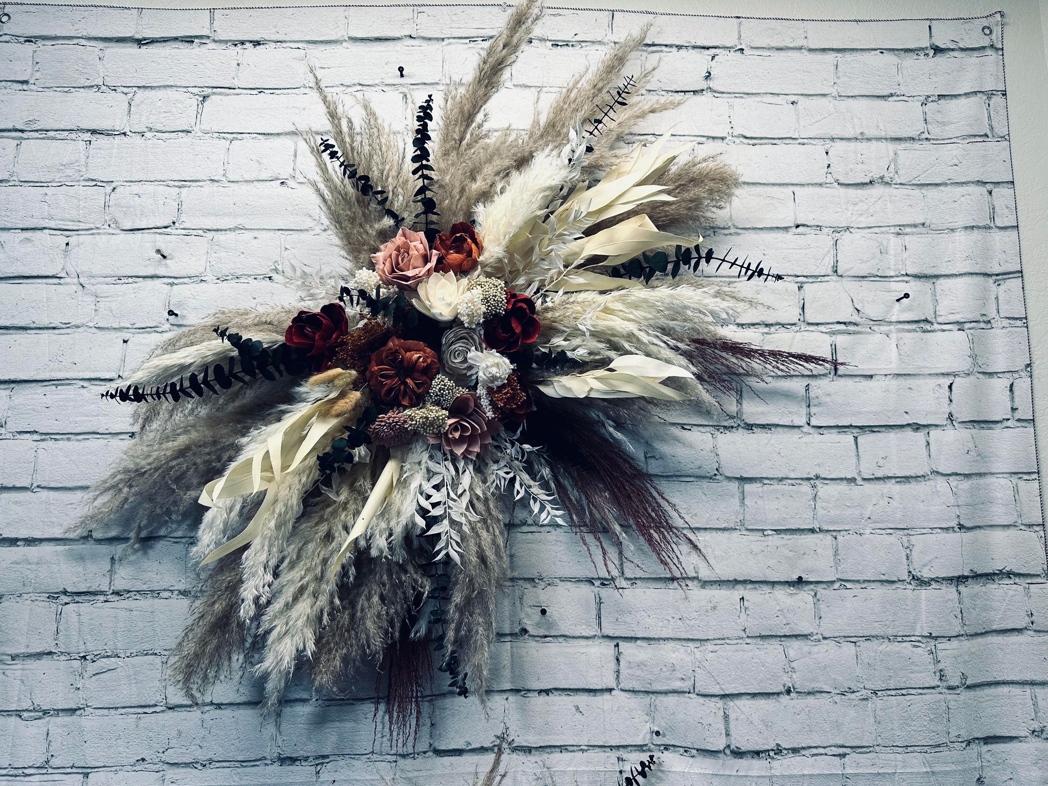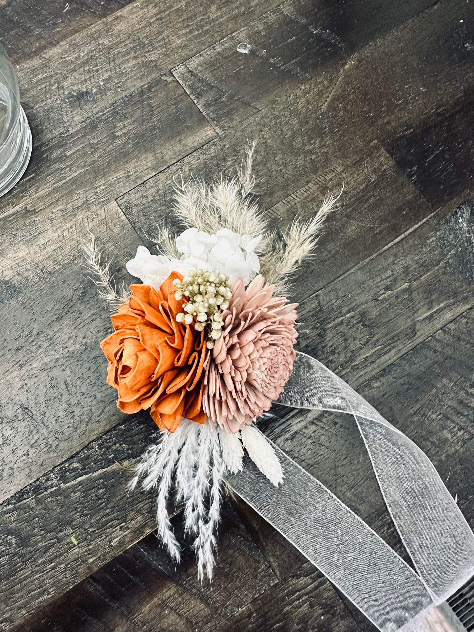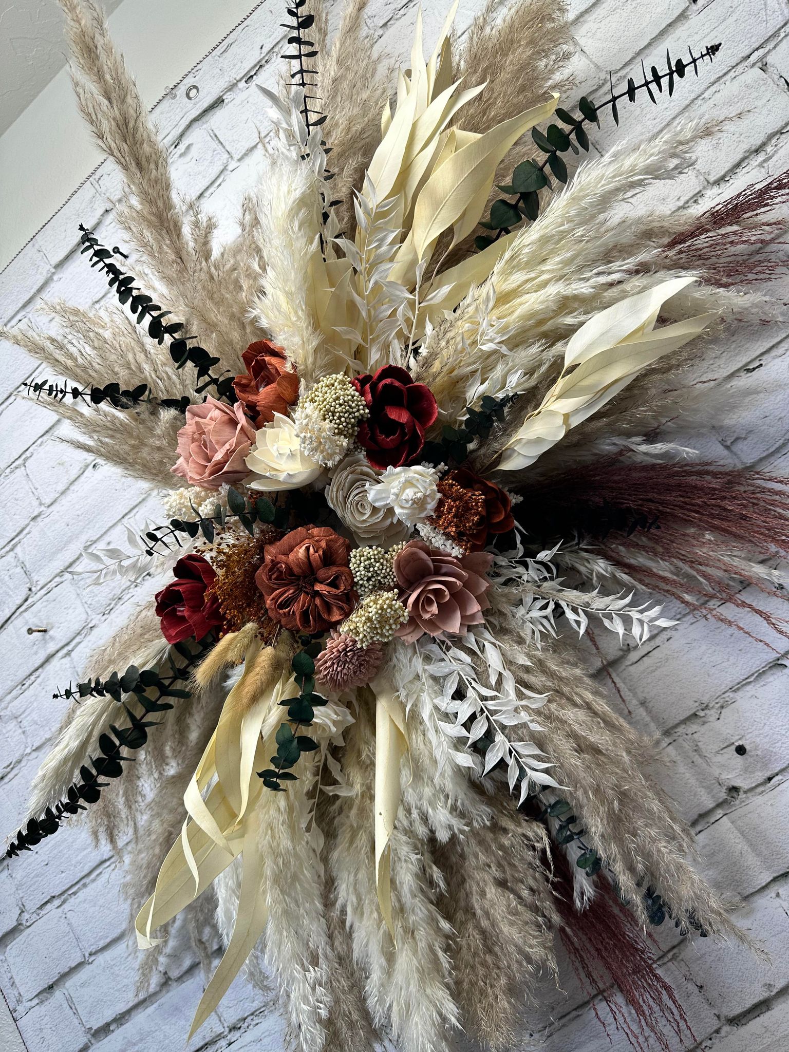 Boho Whisper Collection:: Rustic boho, with a romantic twist! This variety of hand dyed wood flowers are surrounded by real preserved pampas, spiral eucalyptus, ruscus, and natural dried fillers. Our Boho Whisper Collection is a perfect set to complete your wedding day vision!