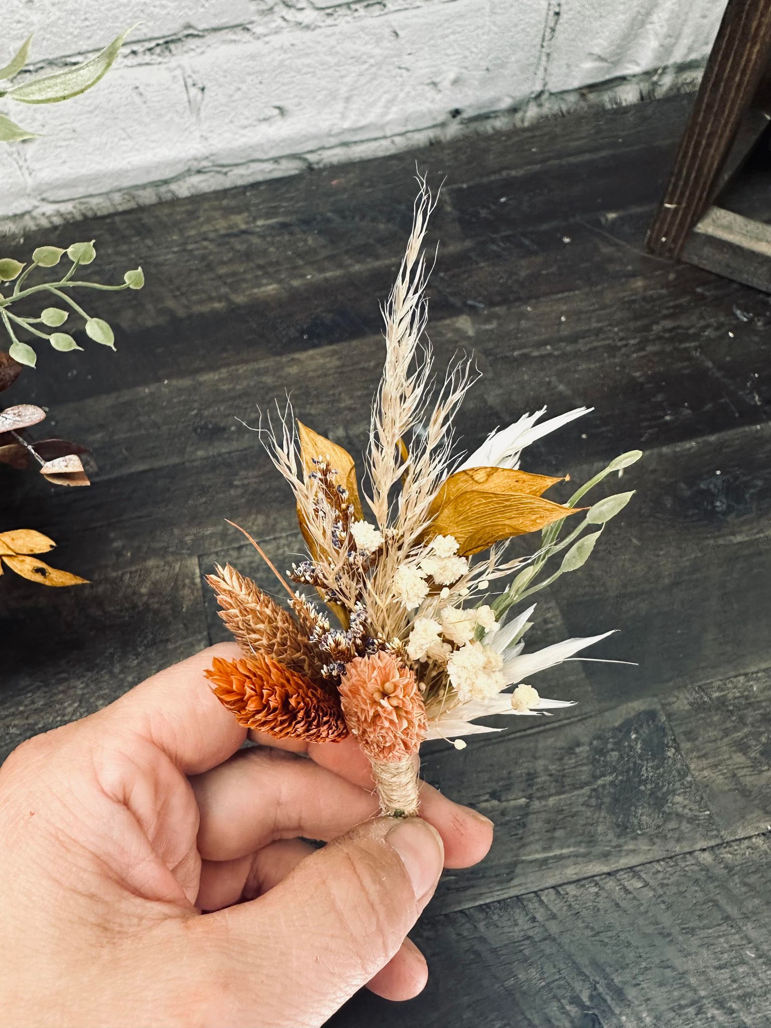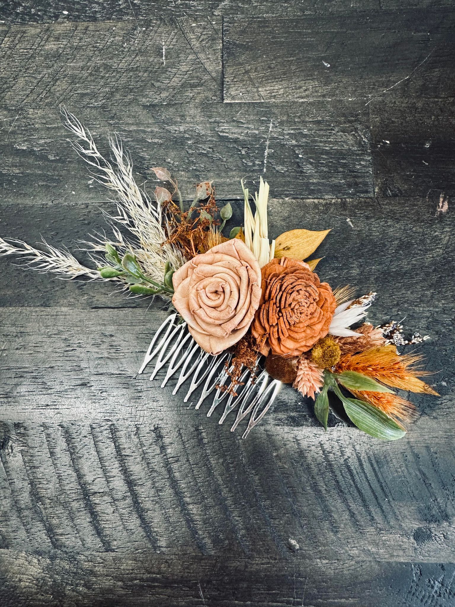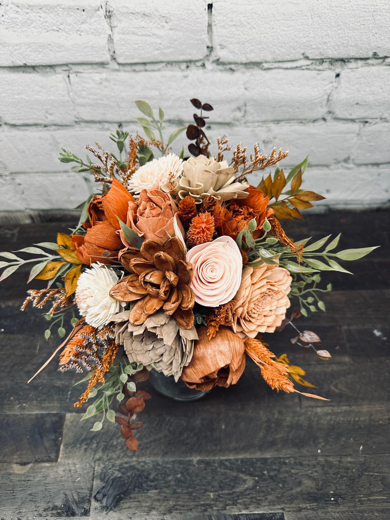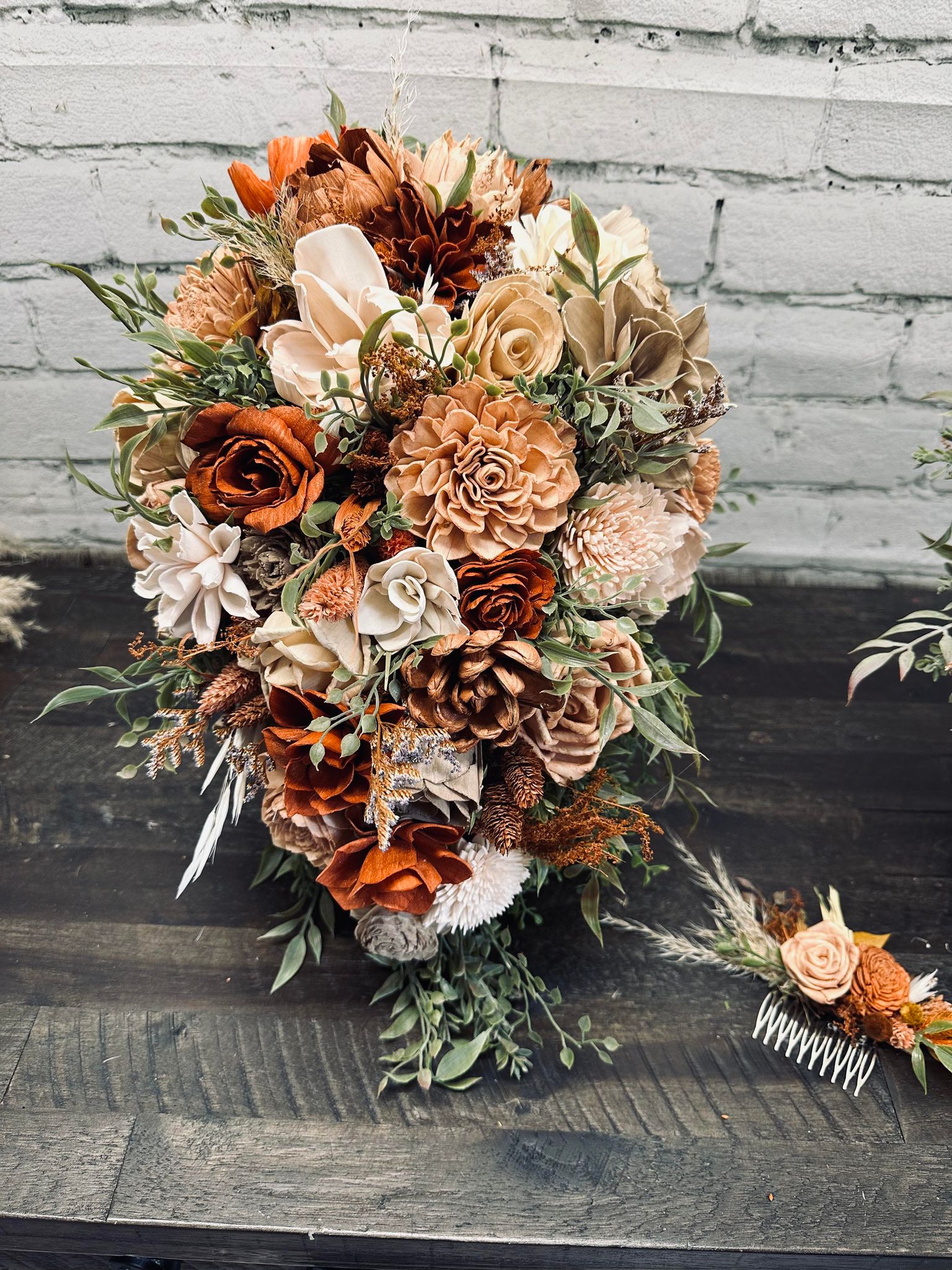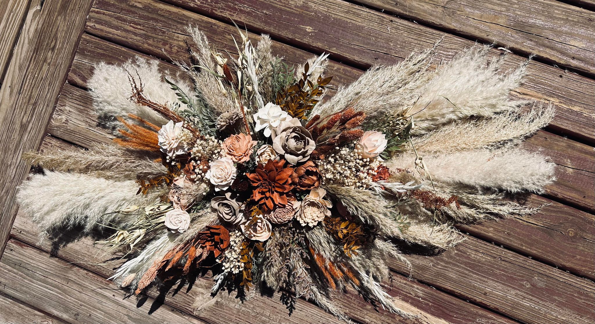 Cascading Fall Collection:: Warmth at your fingertips! This alluring set of wood flowers is finished with peeks real preserved pampas, , ruscus, babies breath, natural dried fillers, and other greenery. Our Cascading Fall Collection is the perfect bit of classic beauty with a pinch of rustic boho decor.