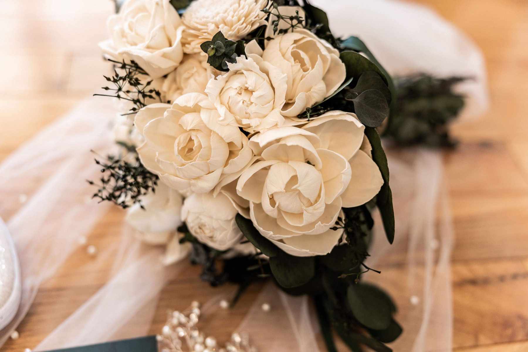 Classic Night Collection:: What a minimalists dream! A collection of wood flowers, surrounded by real preserved spiral, silver dollar, willow and seeded eucalyptus. Our Classic Night Collection is all you need to make your wedding day simply classical.