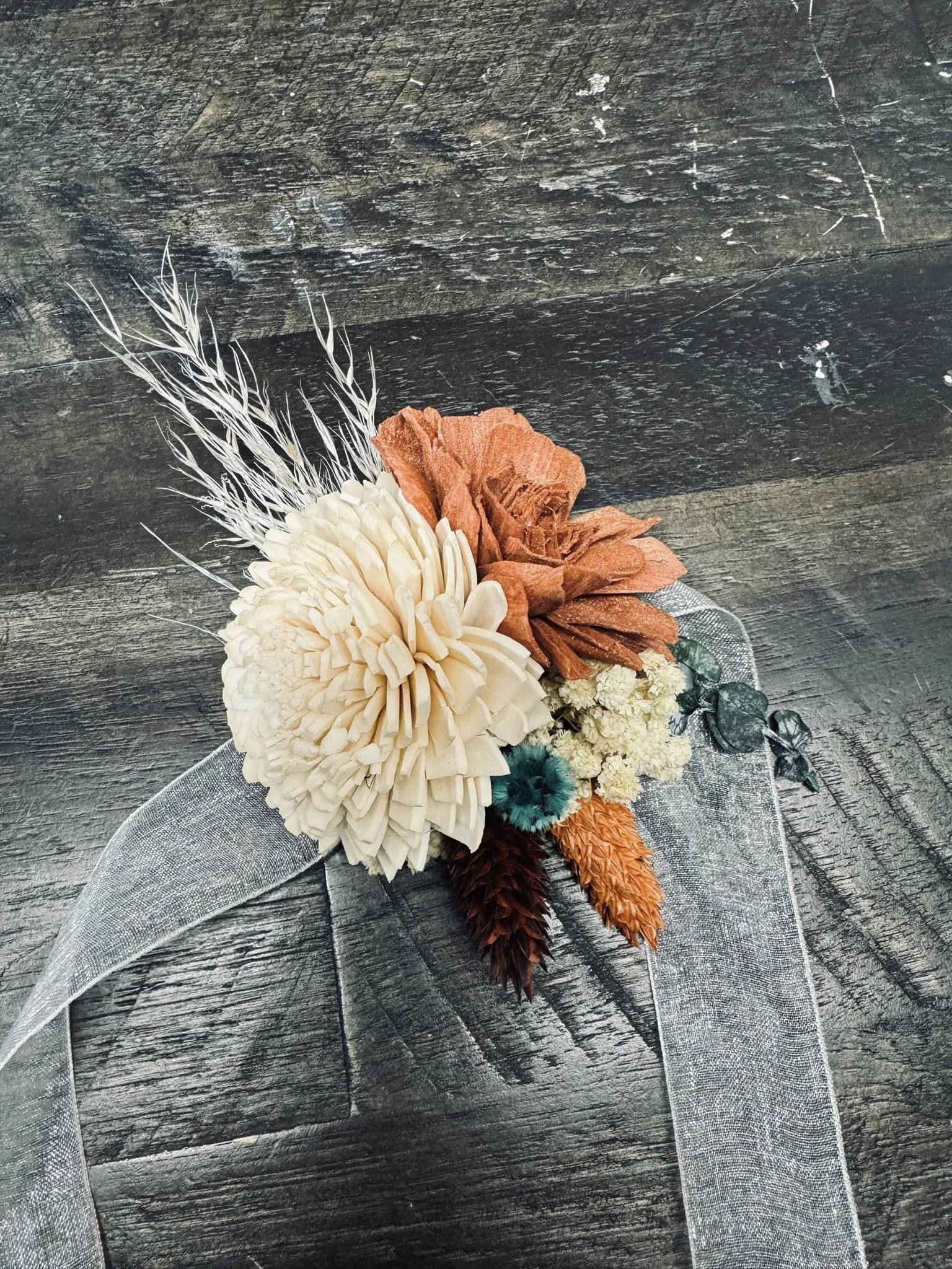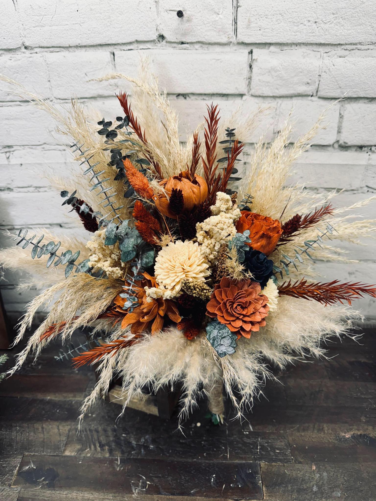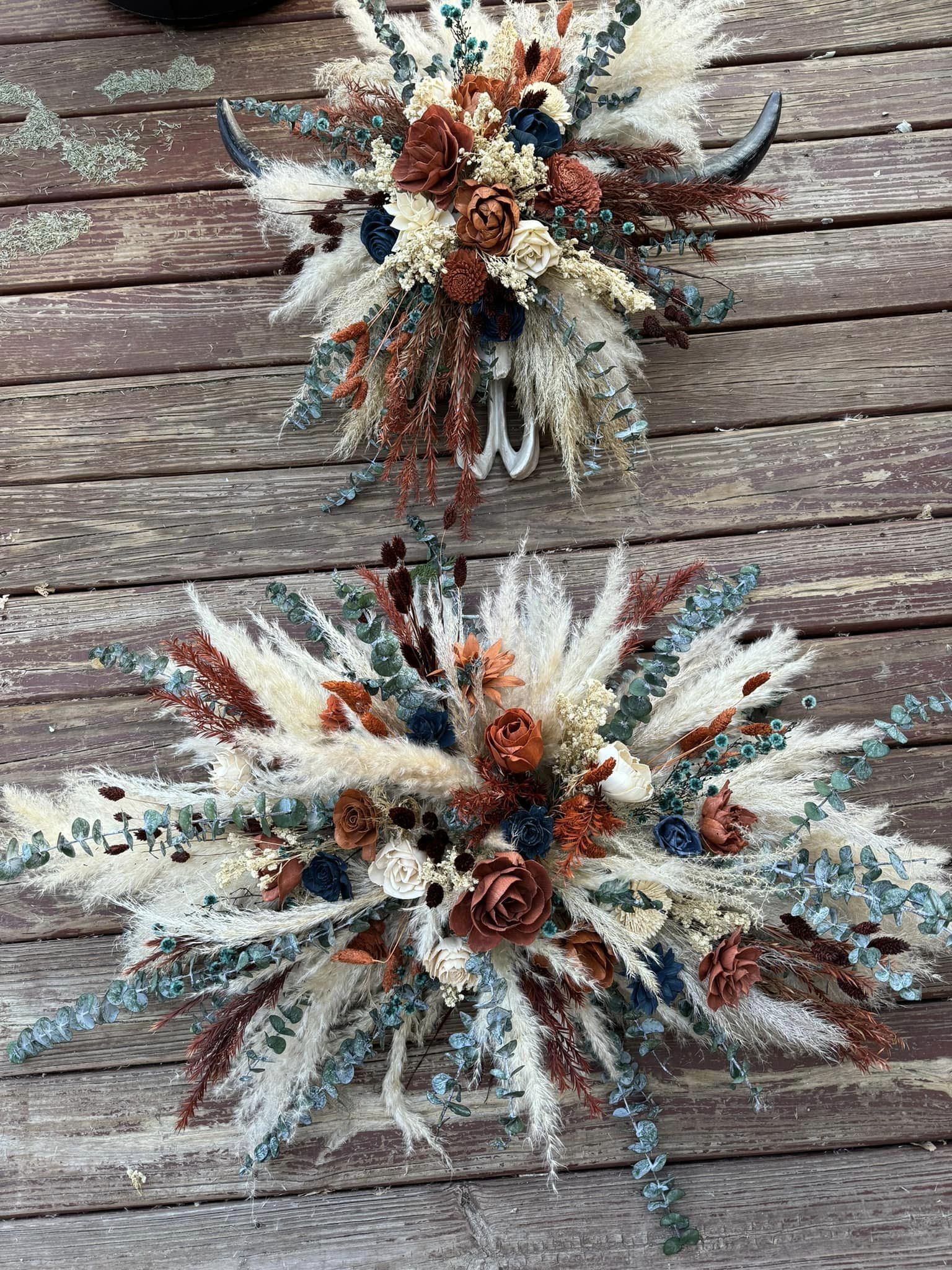 Country Soulmates Collection:: A heart-warming theme, for the wedding of the year! This collection of hand dyed wood flowers is surrounded by real preserved pampas, spiral eucalyptus, babies' breath, and other natural dried fillers. Our Country Soulmates Collection is sure to complete your perfect day with it's warm colors and soft appeal!
