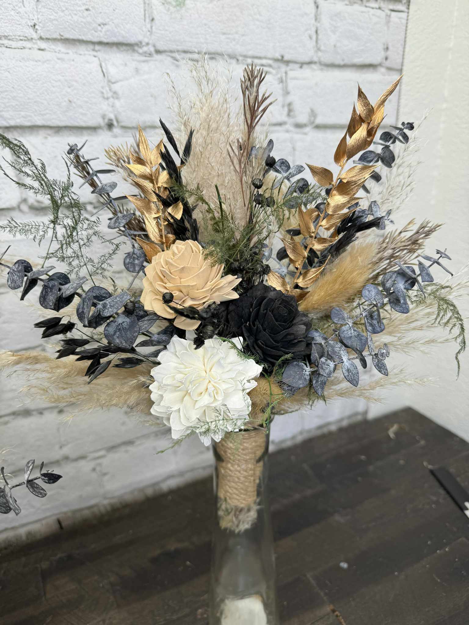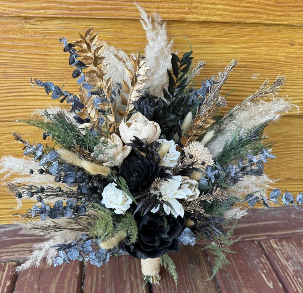 Daughter of Zeus Collection:: Everyone has a dark side, princess or not! This array of hand dyed wood flowers are finished with all real preserved pampas, ferns, spiral eucalyptus, ruscus, bunny tails, and natural dried fillers. Every goddess deserves to SHINE, just like our "Daughter of Zeus" Collection!