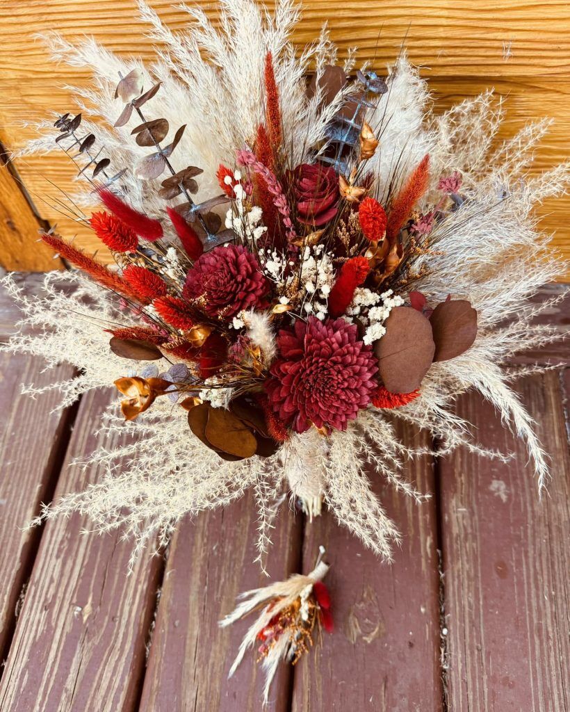 Desert Fiesta Collection:: Bright, fun, and ready to DANCE! Our hand dyed wood flowers are finished with real preserved pampas, spiral & silver dollar eucalyptus, bunny tails, babies breath, and natural dried fillers. Our "Desert Fiesta" Collection levels up your wedding day style, and warms up every guest in attendance.