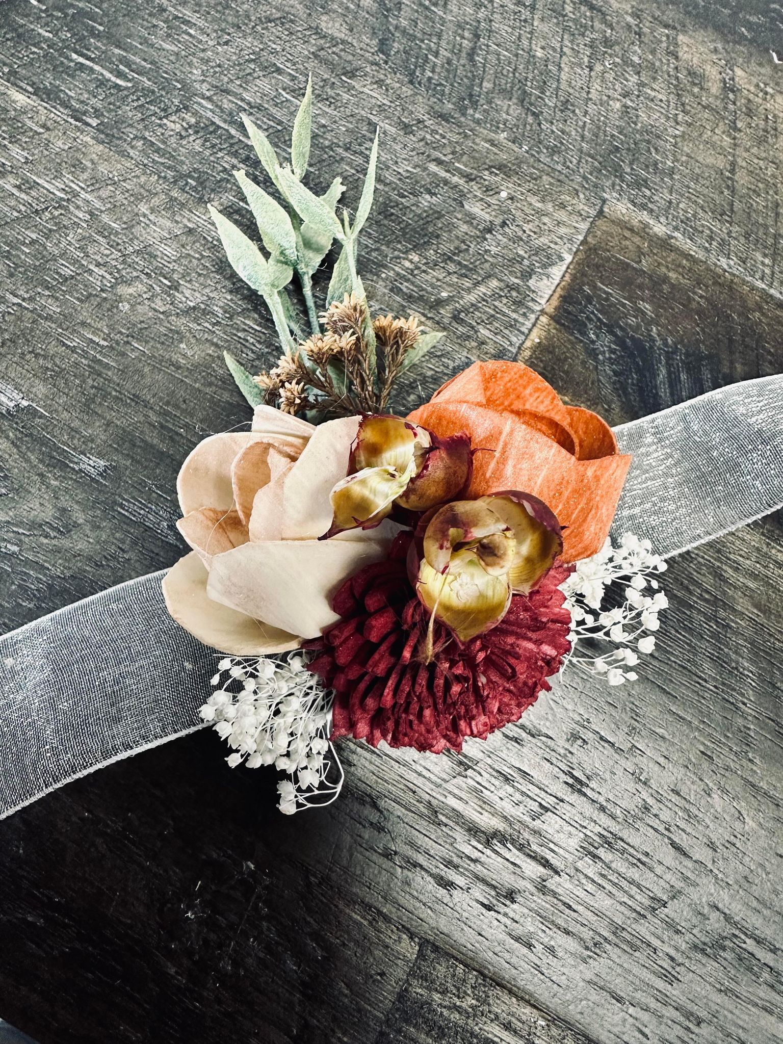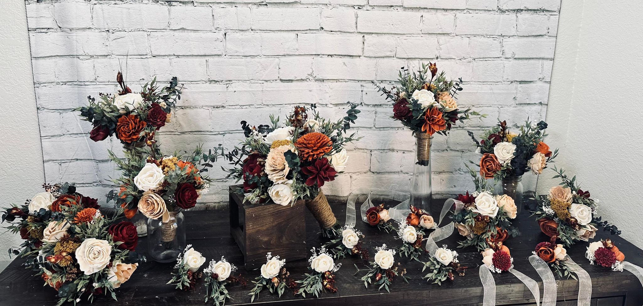 We strive to create every collection as close to the original as possible. These items are hand-crafted. Slight differences from the main photos will occur, as you are not purchasing the photographed items. Your collection is being made to order.. Flower design and fillers may vary due to availability of products.