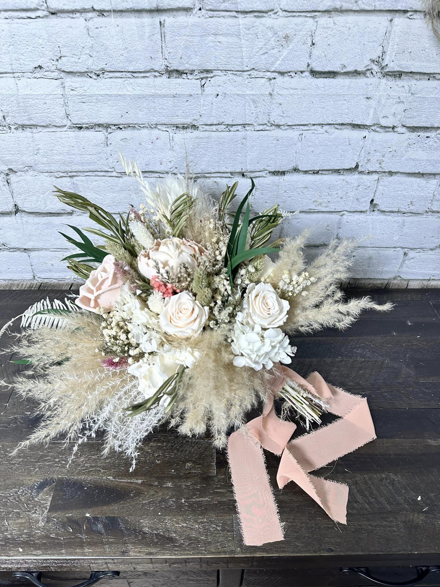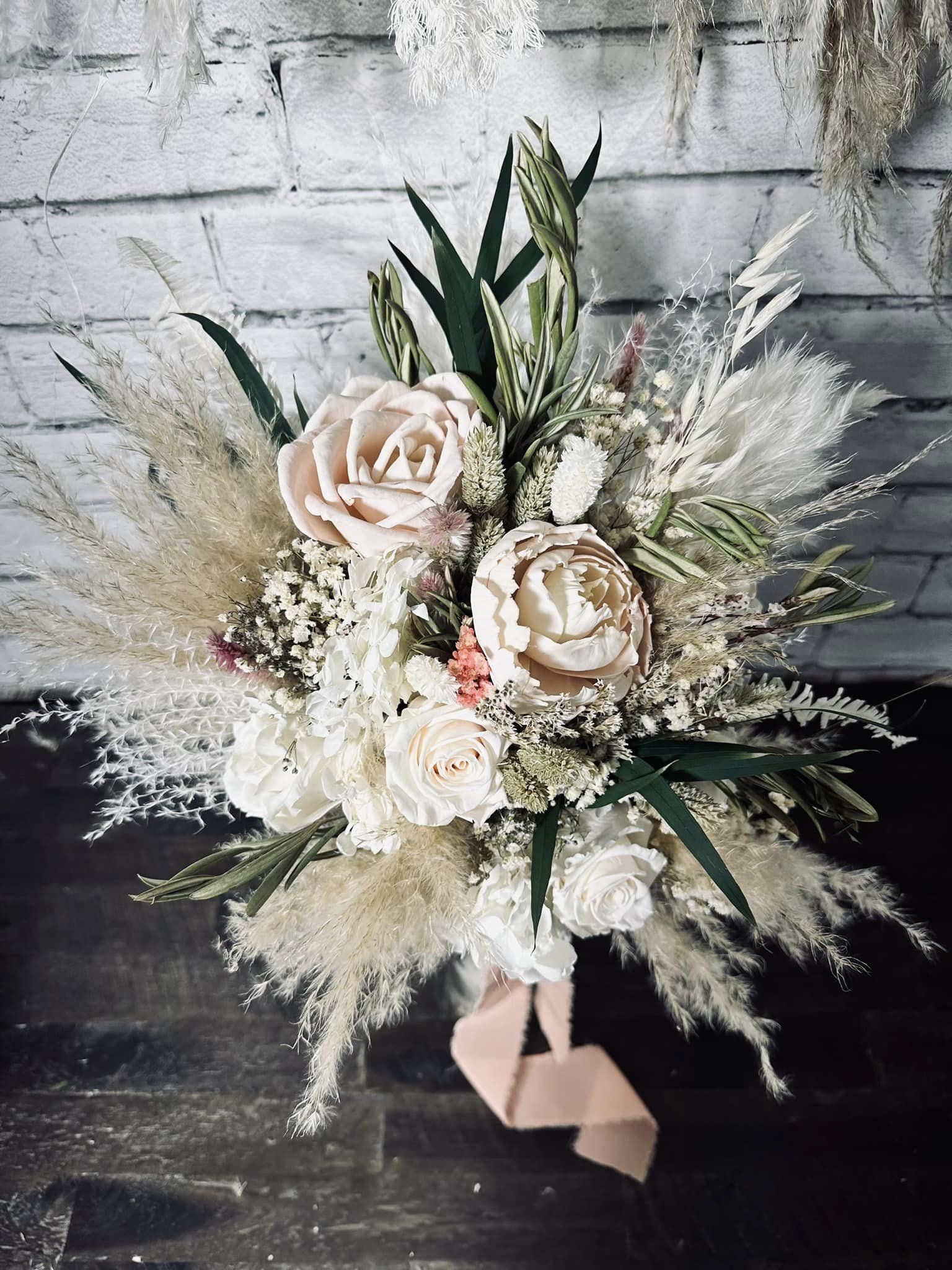 Eternal Love Collection:: Graceful, elegant, and simplistic. This soft collection of sola wood flowers is completed with real preserved pampas, willow eucalyptus, babies breath, hydrangeas, and natural dried fillers. Our Eternal Love Collection is the perfect set for a classic bride.