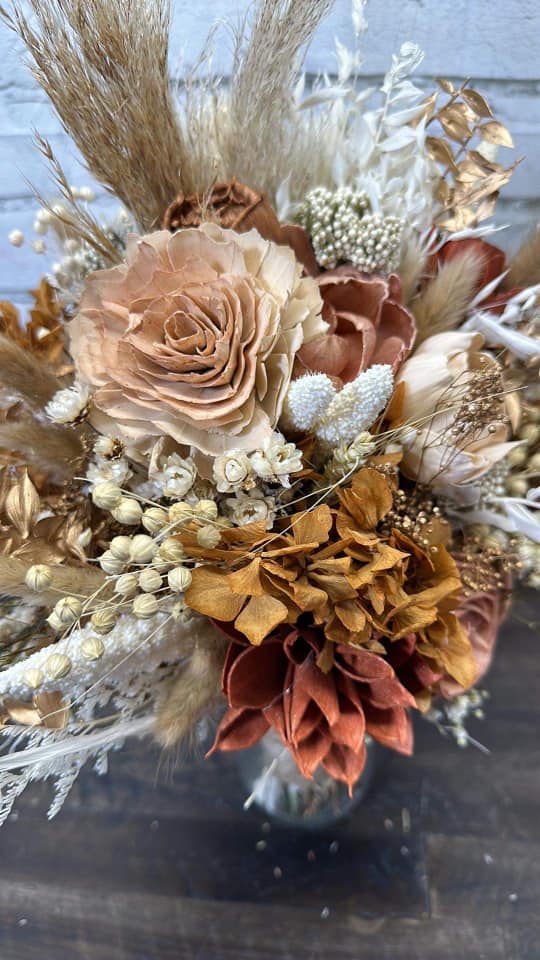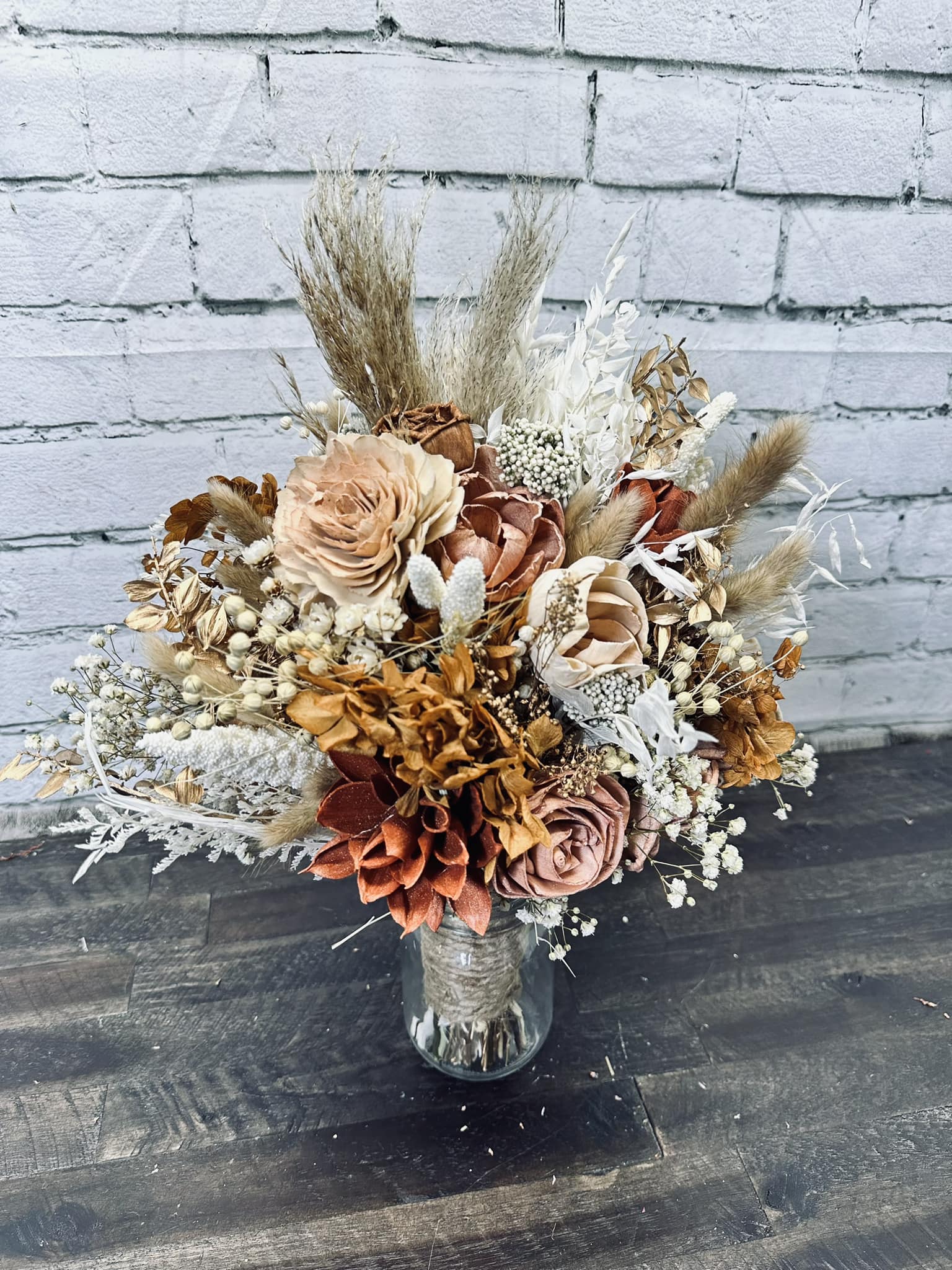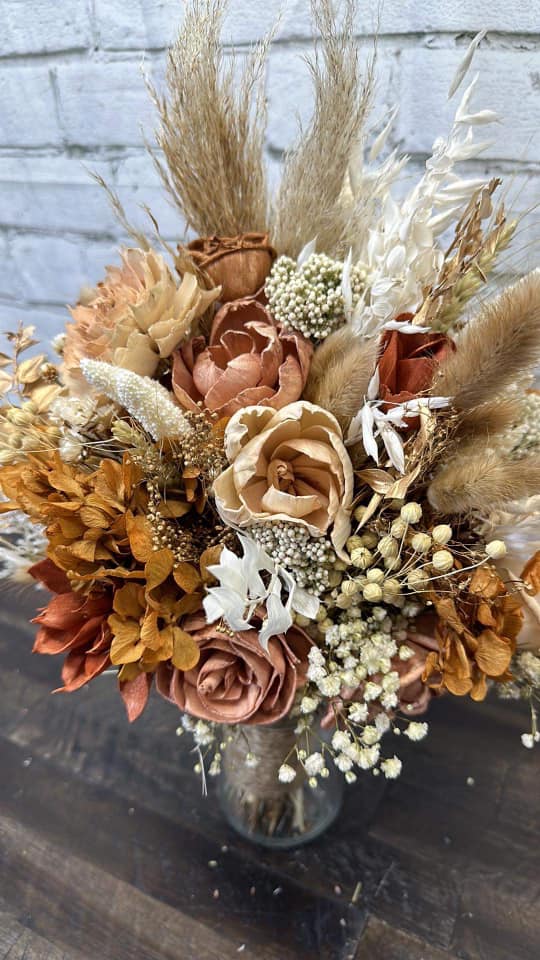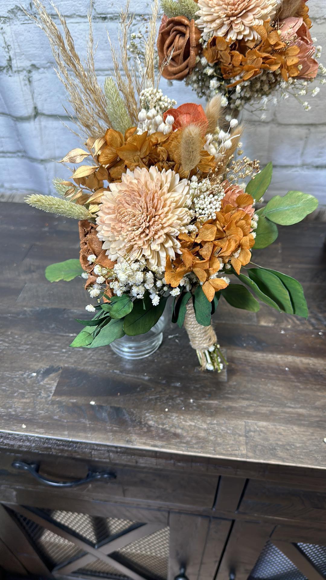 Fall's Last Breath Collection:: Close your eyes, take a deep breath, ahh! Here it is! The set you've been looking for! A soft variety of hand dyed wood flowers, finished with real preserved silver dollar eucalyptus, hydrangeas, pampas, babies breath, bunny tails, and natural dried fillers, Our Fall's Last Breath Collection will leave your entire wedding breathless!