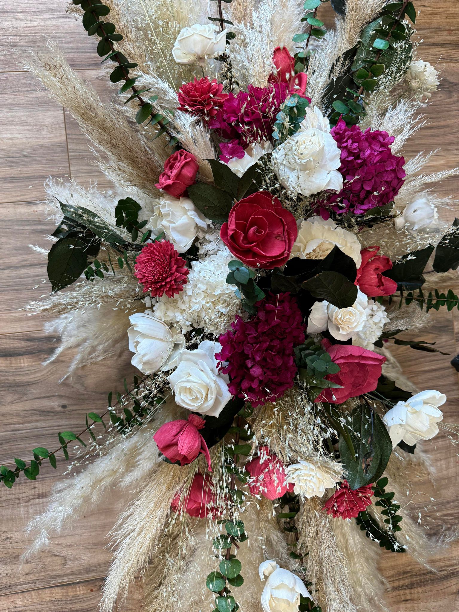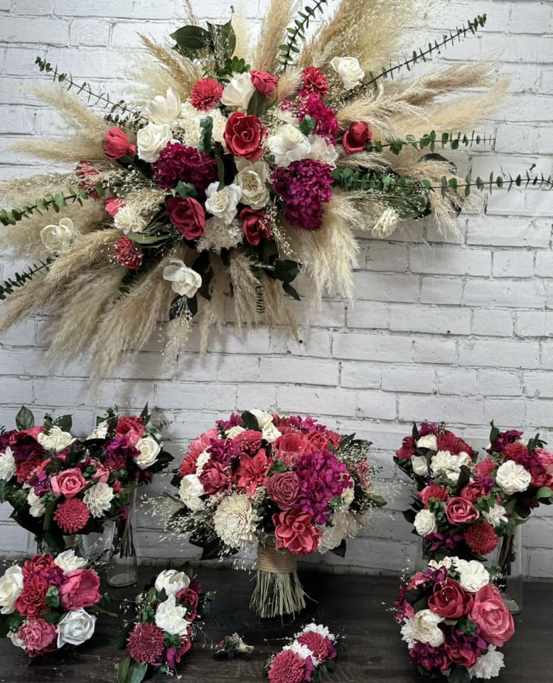 Flirty Girls Collection:: All the girls like to party!! This fun set of hand dyed wood flowers are paired with real preserved pampas, spiral eucalyptus, salal, babies breath, hydrangeas, and natural dried fillers. Our "Flirty Girls" Collection is the perfect set to show off your fun, vibrant, girly style!