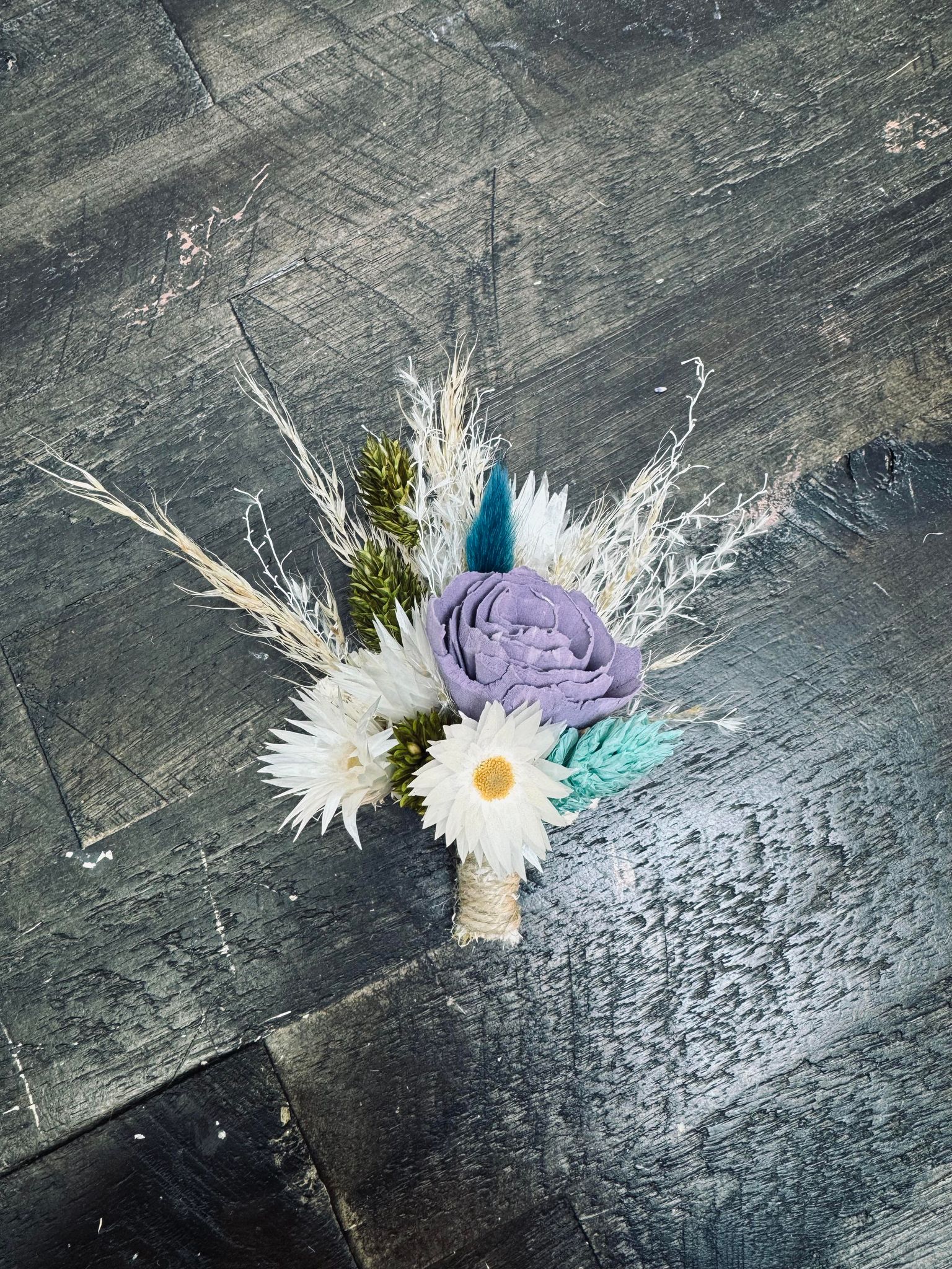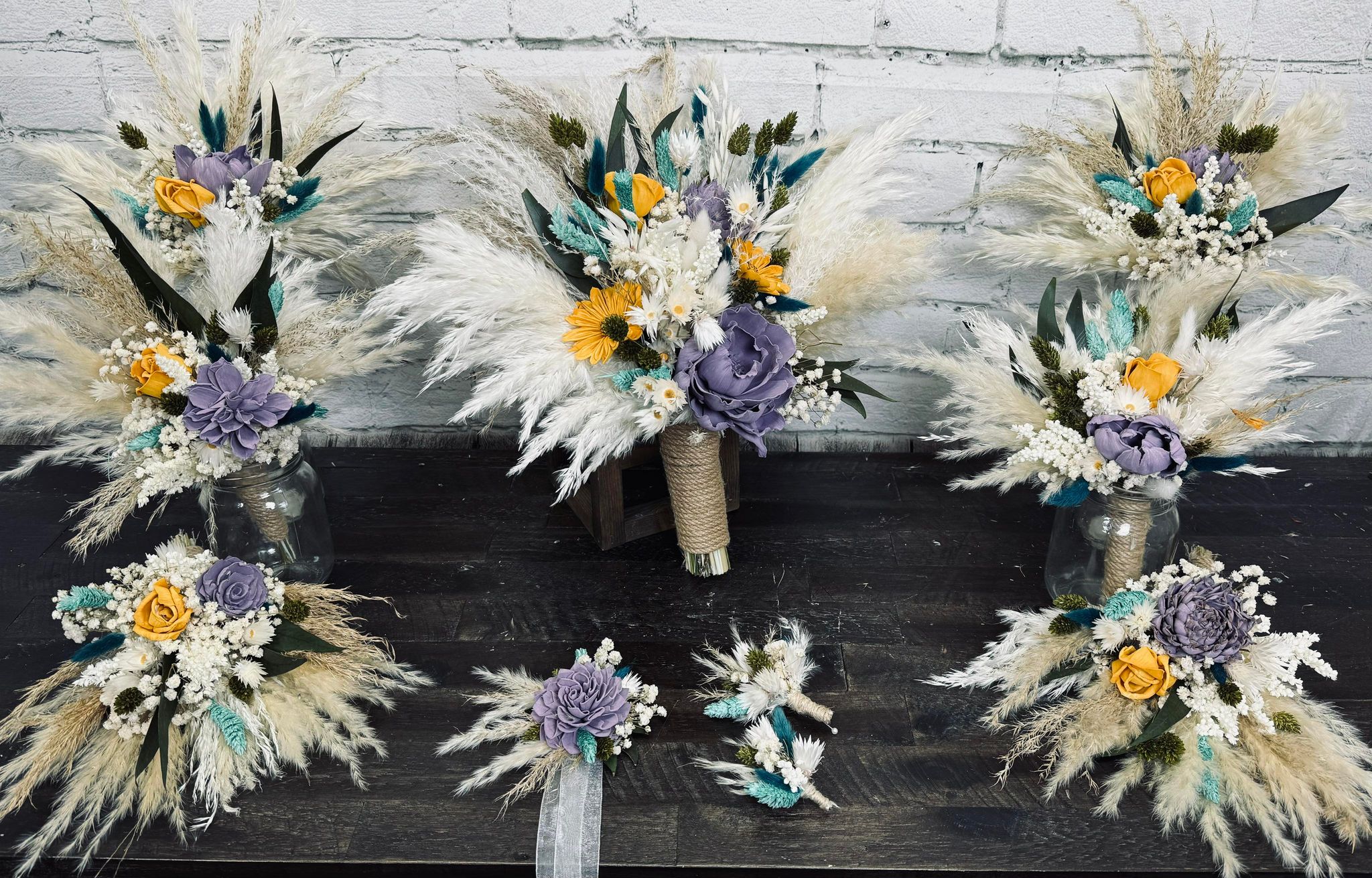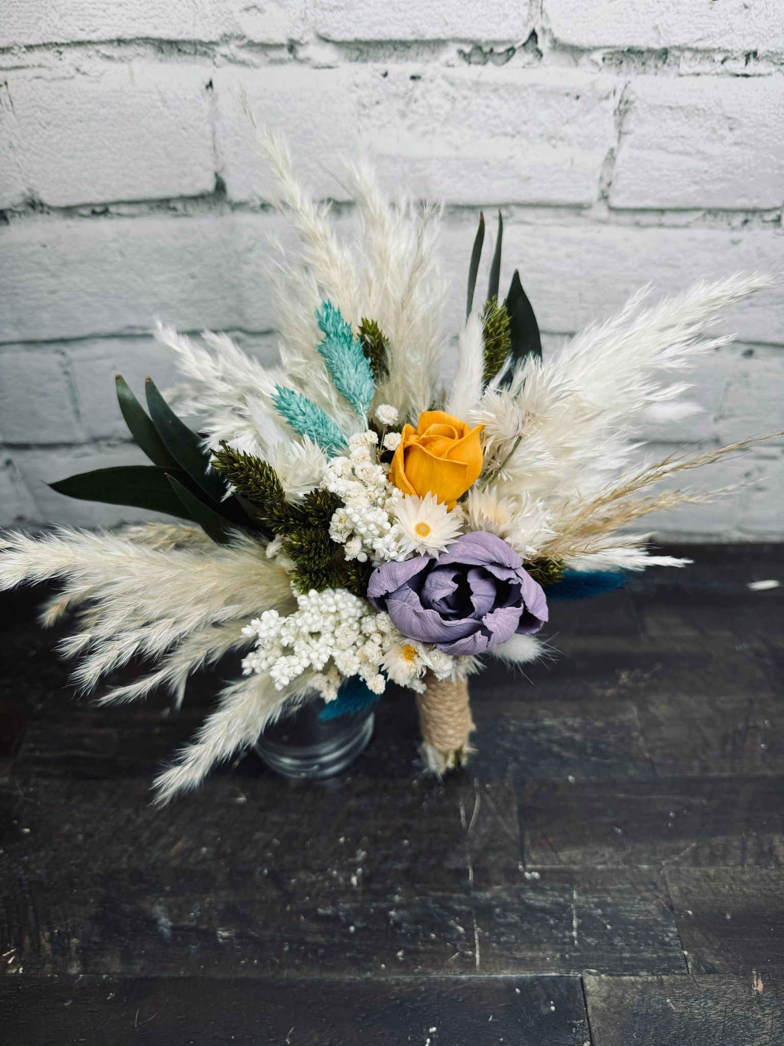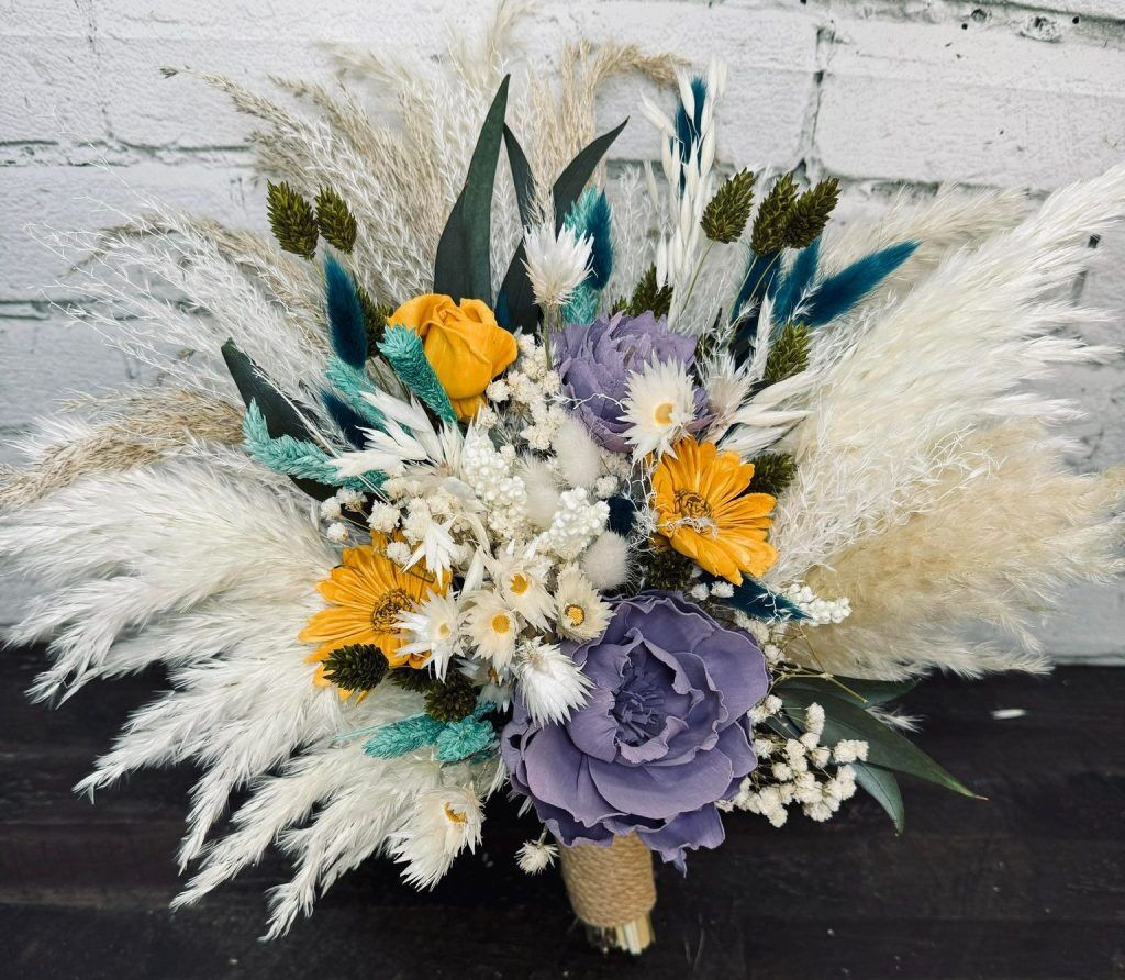 Florentina Collection:: Fresh spring mornings, captured in a bouquet! This sweet collection of hand dyed wood flowers includes daisies and sunflowers, and are finished with real preserved pampas, babies breath, willow eucalyptus, bunny tails, and natural dried fillers. Spring your way down the aisle with our Florentina Collection!