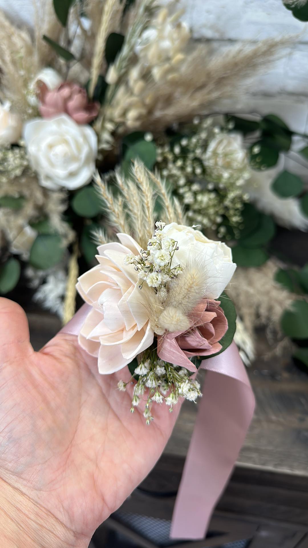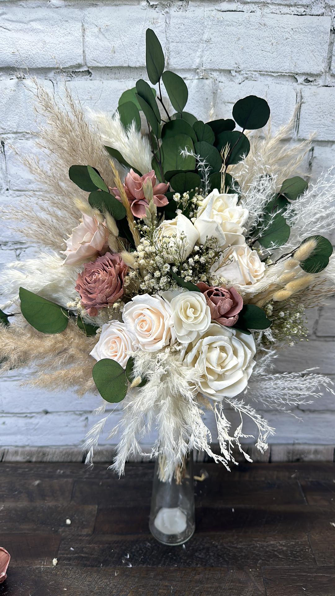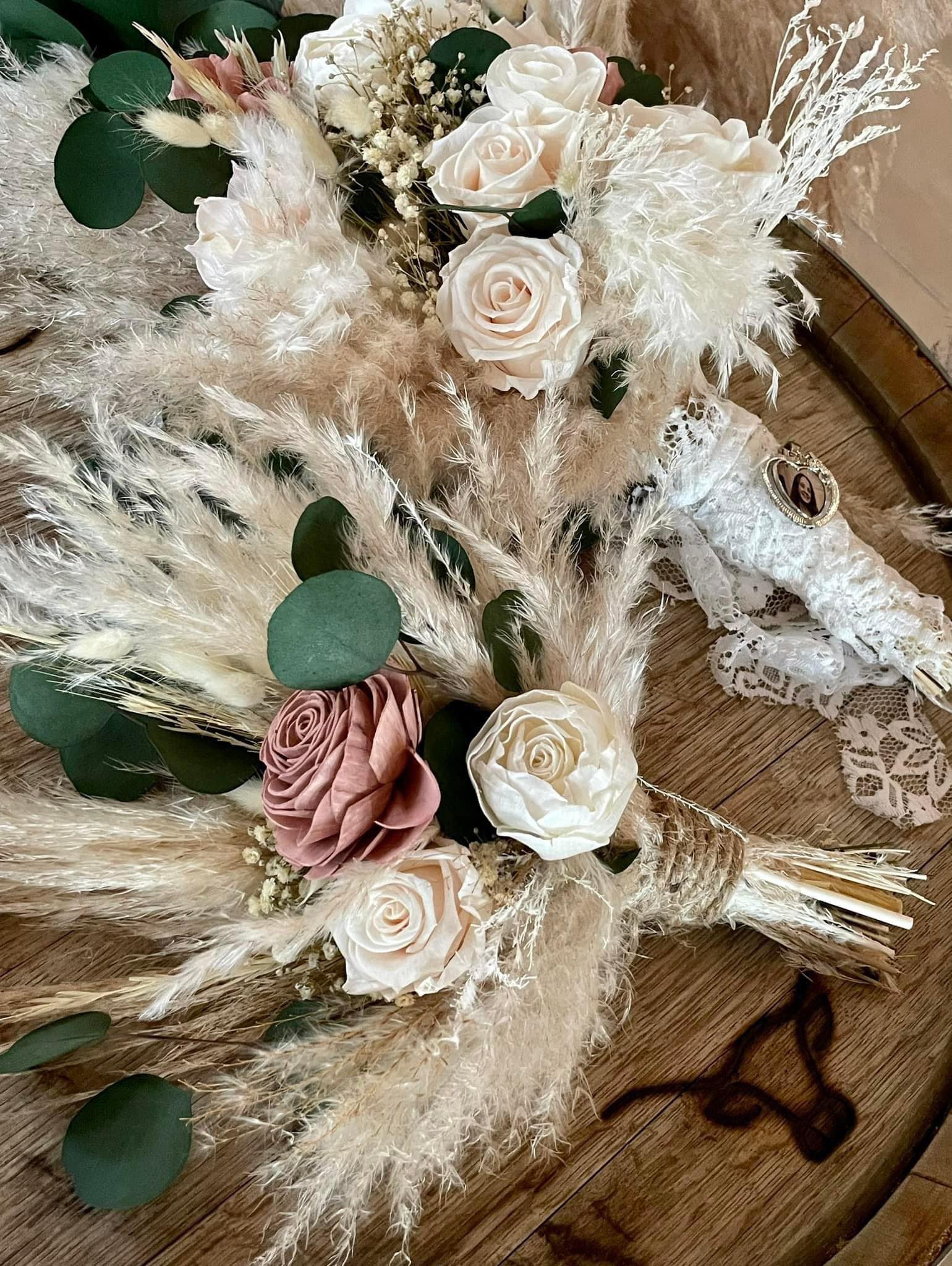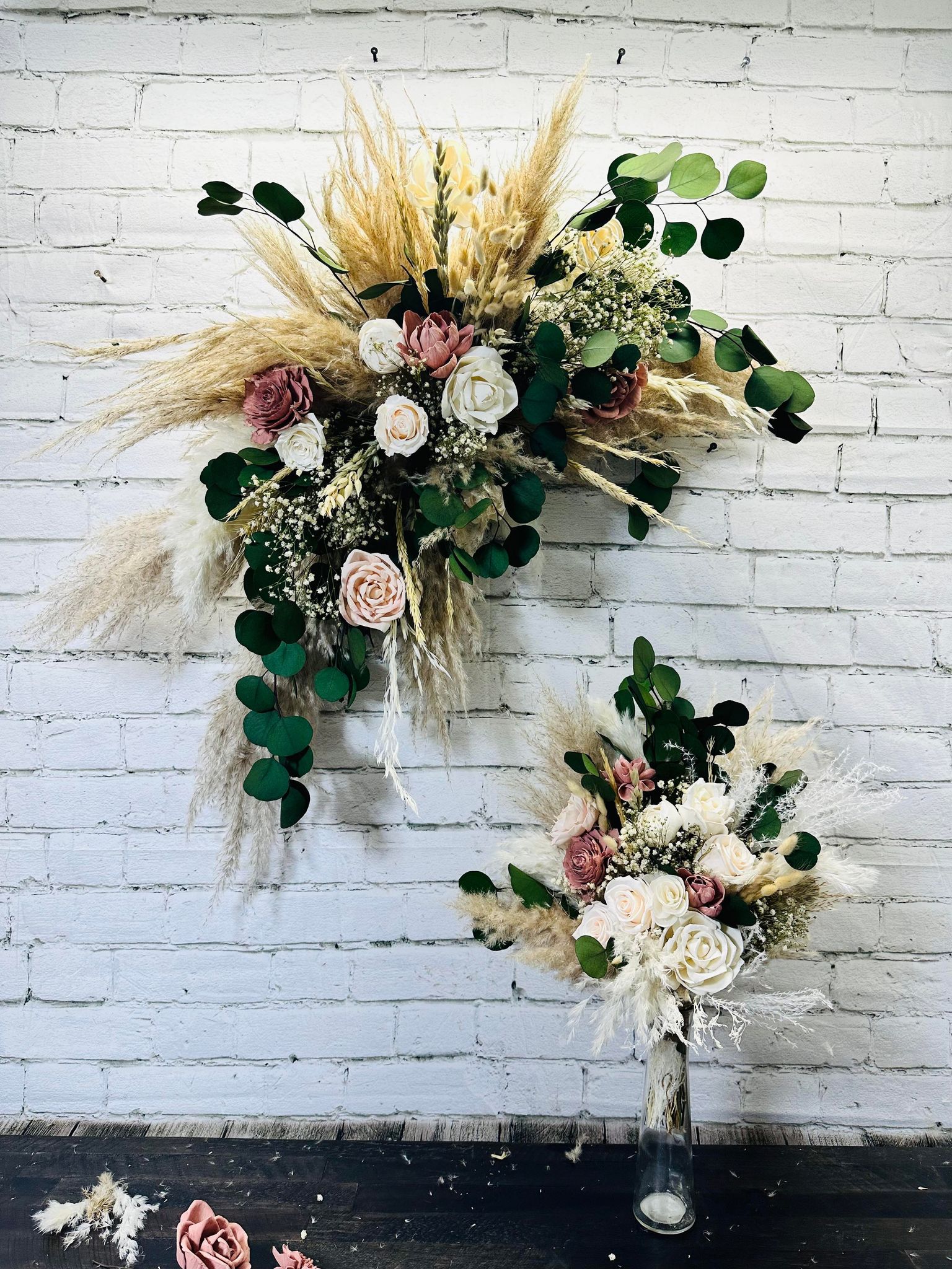 Forever Dreaming Collection:: This romantic boho set is perfect for a soft color theme wedding! With hand dyed wood flowers, set is finished with real preserved pampas, eucalyptus, bunny tails, babies breath, and natural dried fillers. Our Forever Dreaming Collection will keep you and your guests on cloud 9 all weekend long.
