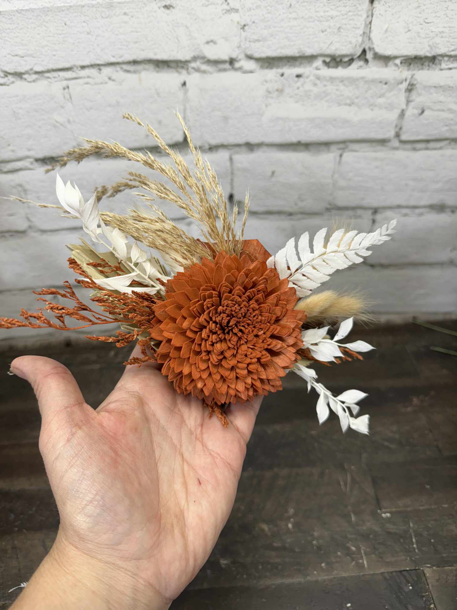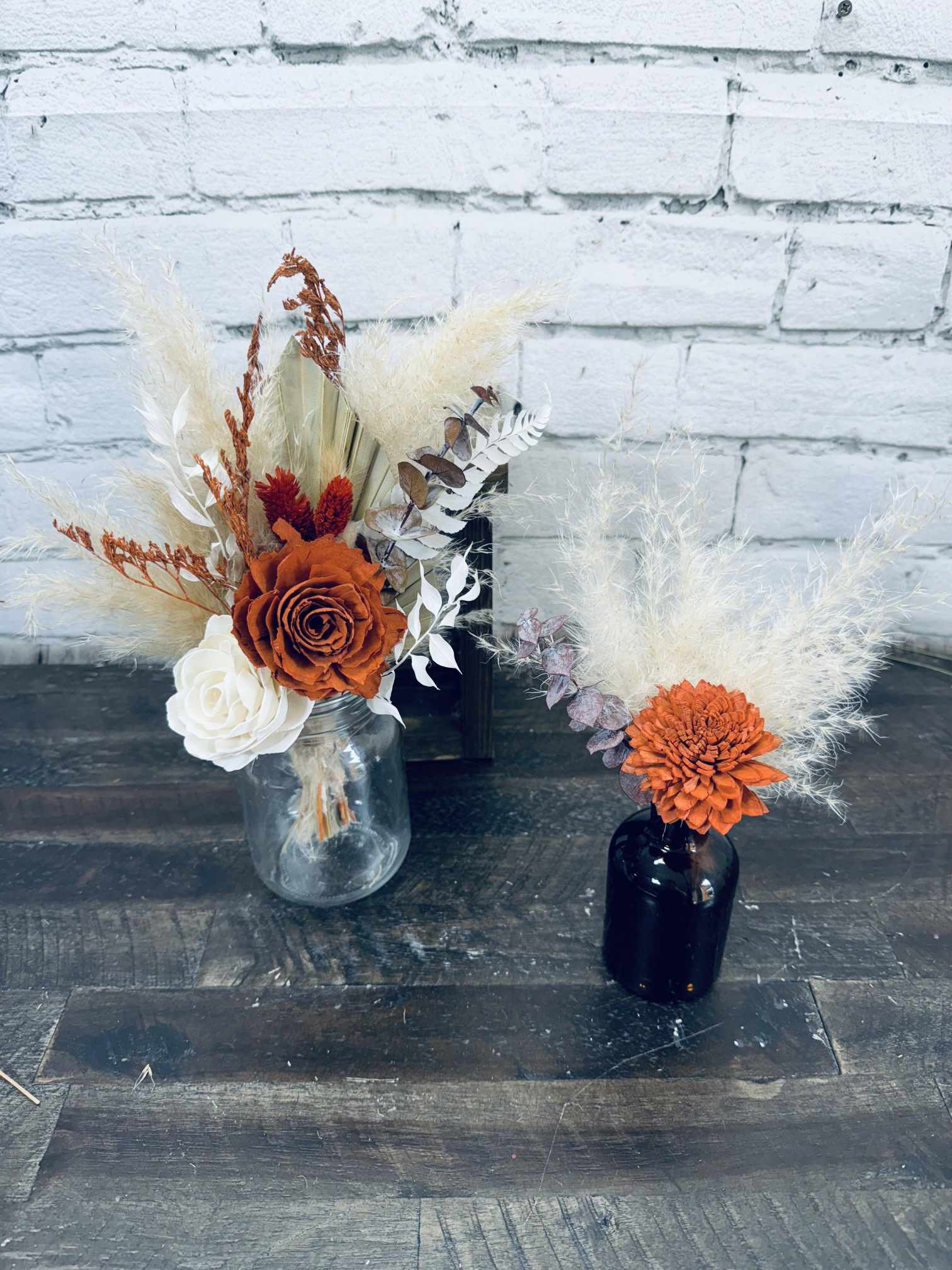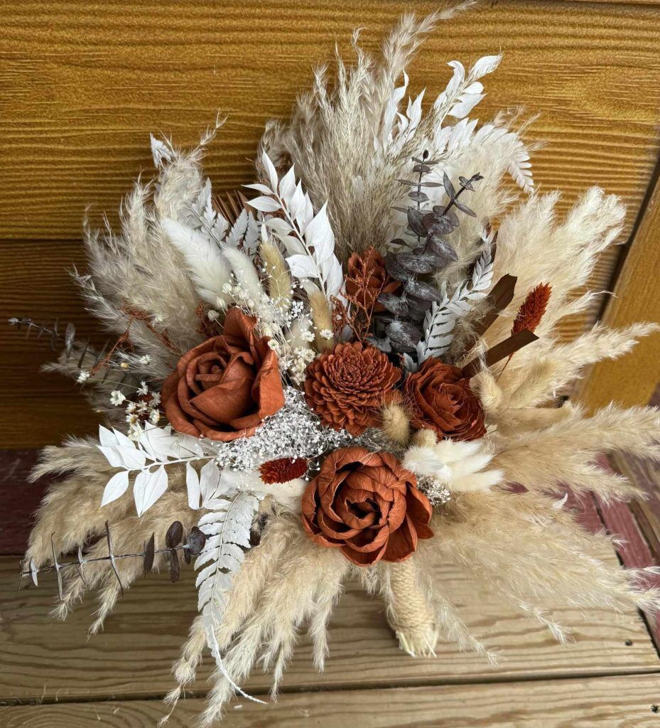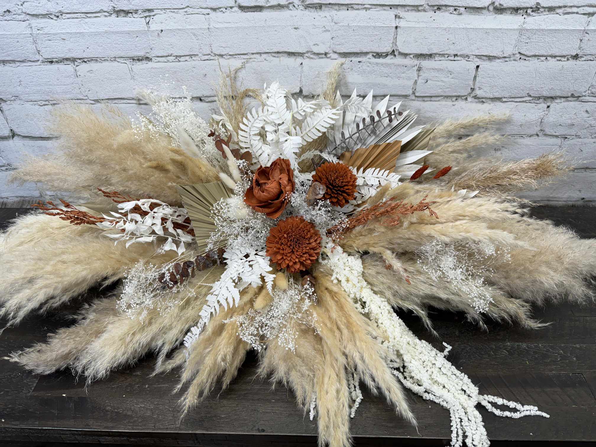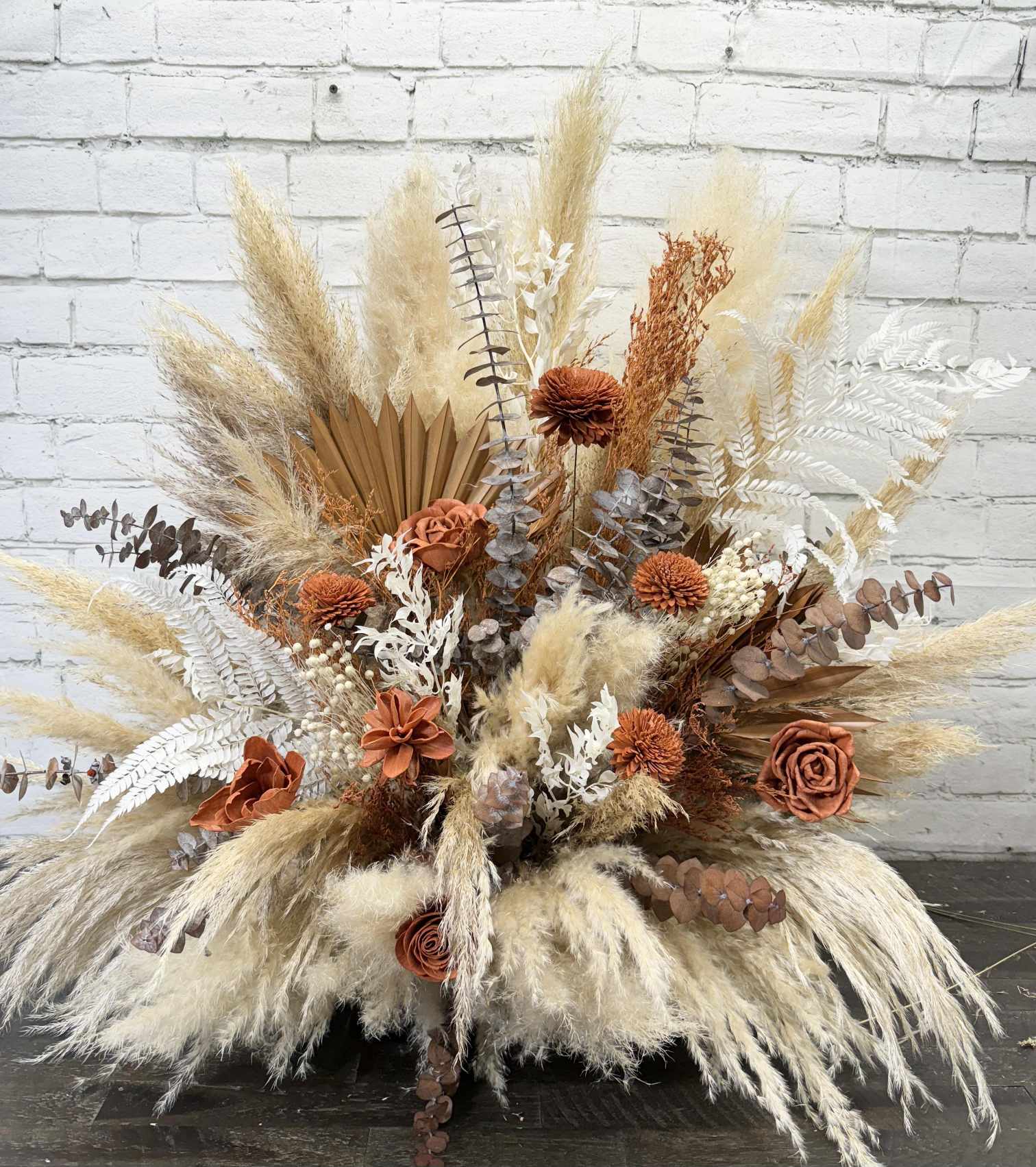 Foxy Lady Collection:: Strut your stuff like the fox you are! Our hand dyed wood flowers are surrounded by all real preserved pampas, spiral eucalyptus, ruscus, sum palms & spears, babies breath, bunny tails, and natural dried fillers. Our "Foxy Lady" Collection will boost your confidence, and have all your guests swooning!