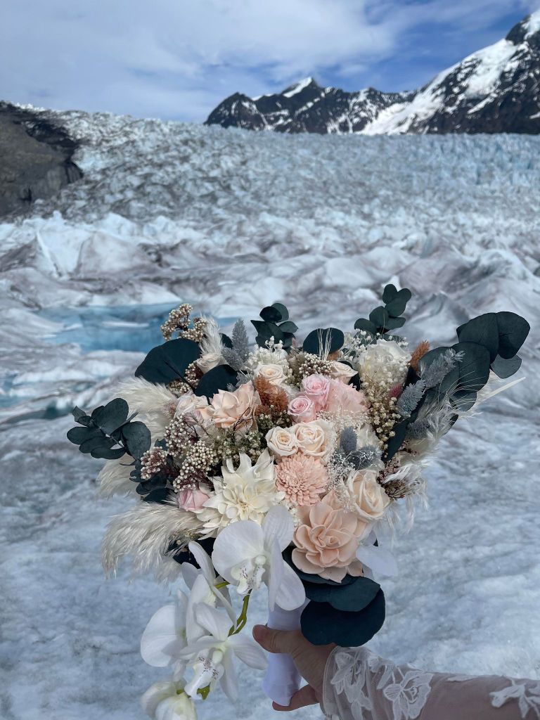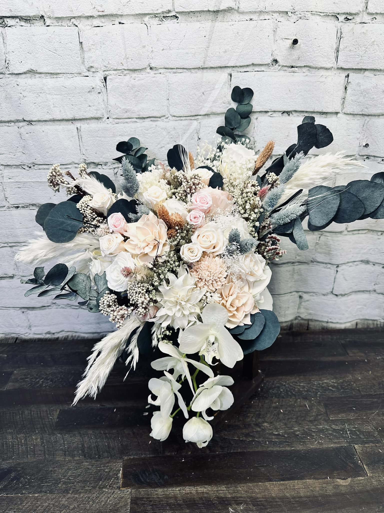 Glacier Dreams Collection:: Cool, calm, and collected is exactly how you will feel with this neutral style bouquet. A variety of soft colored wood flowers and real preserved silver dollar and spiral eucalyptus, pampas, babies breath, bunny tails, and natural dried fillers. Make your Glacier Dreams come true and walk down the aisle with this dreamy collection!