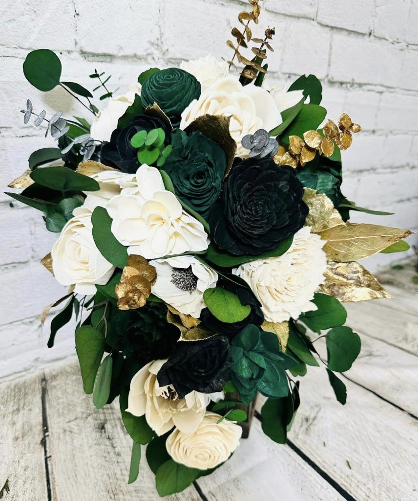 Green Goddess Collection:: Survey says...Go Green! and we agree! This set features emerald green and white wood flowers, with real preserved spiral and silver dollar eucalyptus and salal (some gold for that goddess pop!) So don't just go with the flow, go with our Green Goddess Collection for your very special day!