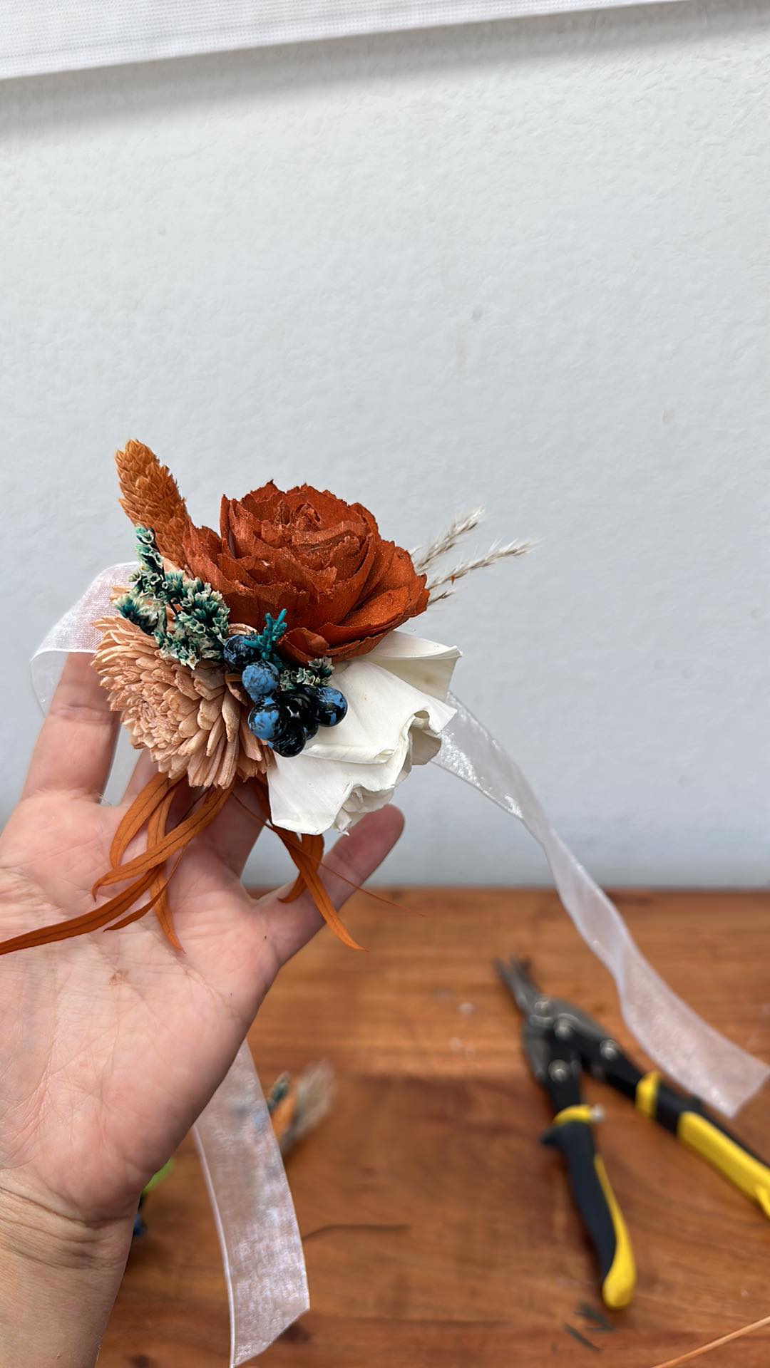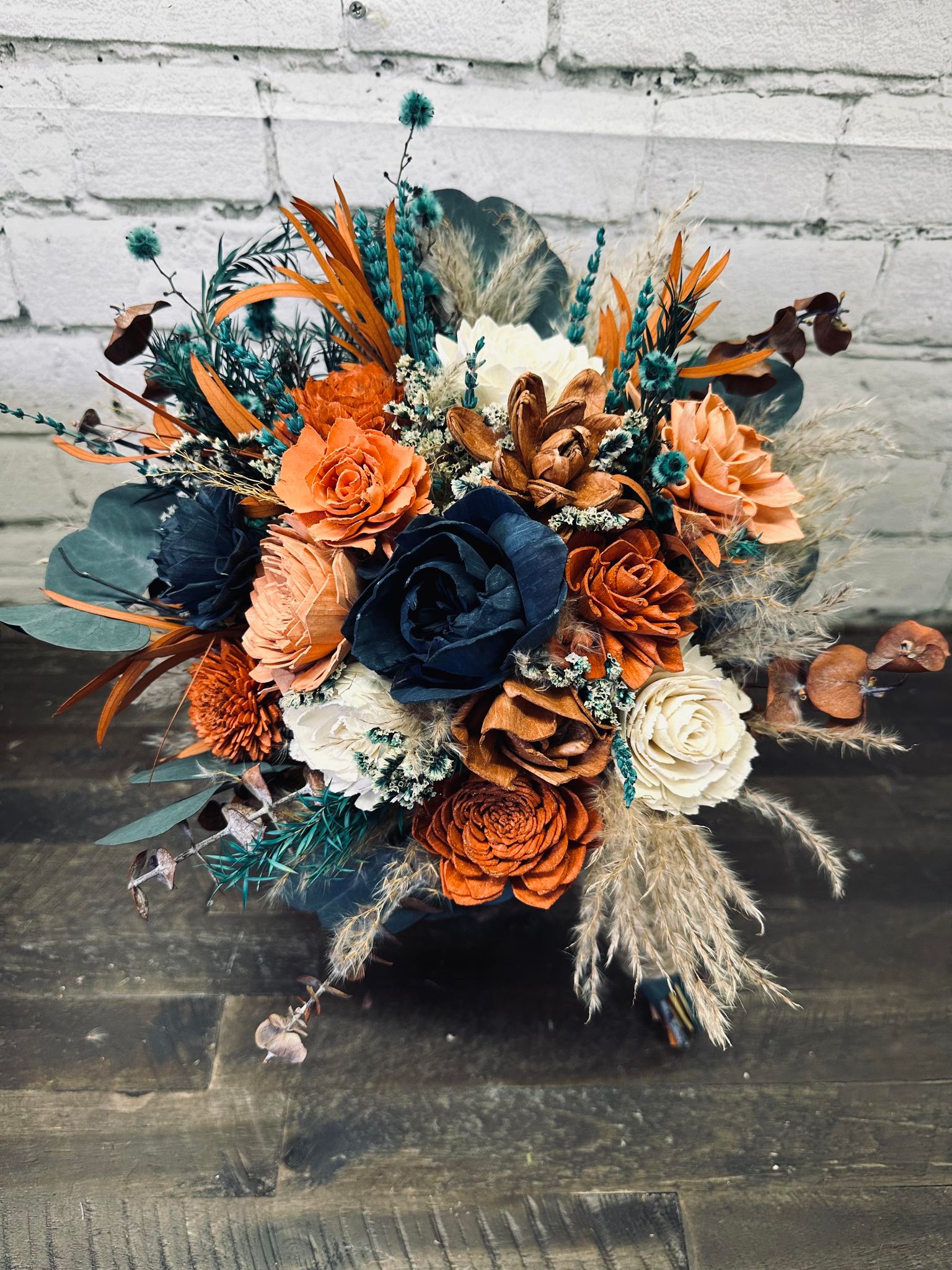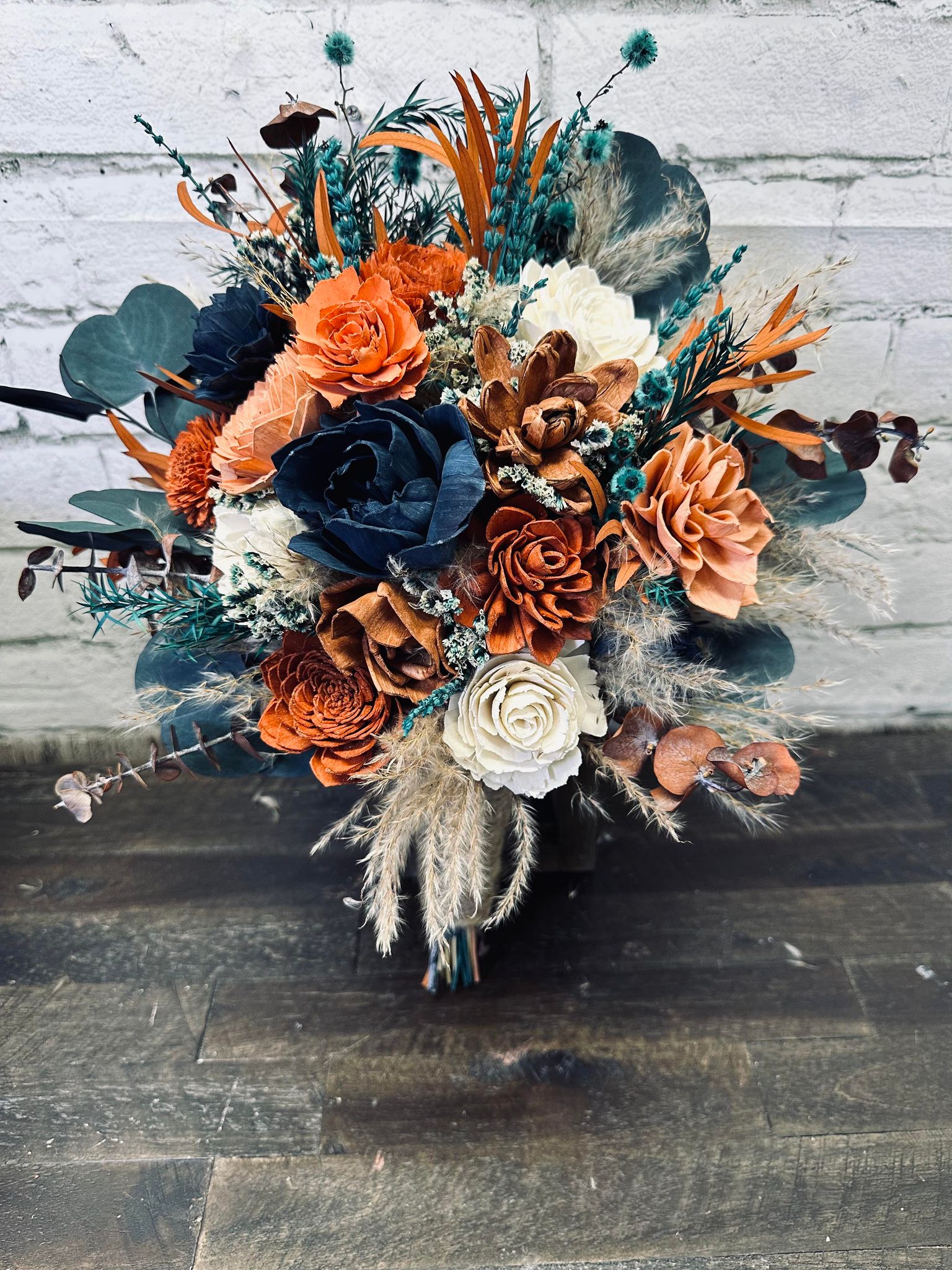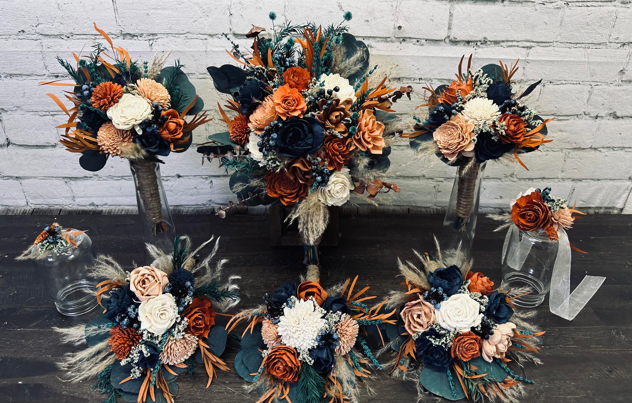 Harvesting Love Collection:: Inspired by a walk though a field full of flowers, full of fall colors for the harvest! A variety of wood flowers hand dyed, with a splash of real preserved pampas, eucalyptus, and other greenery fillers. Send warm loving vibes to the hearts of everyone at your wedding with our Harvesting Love Collection!