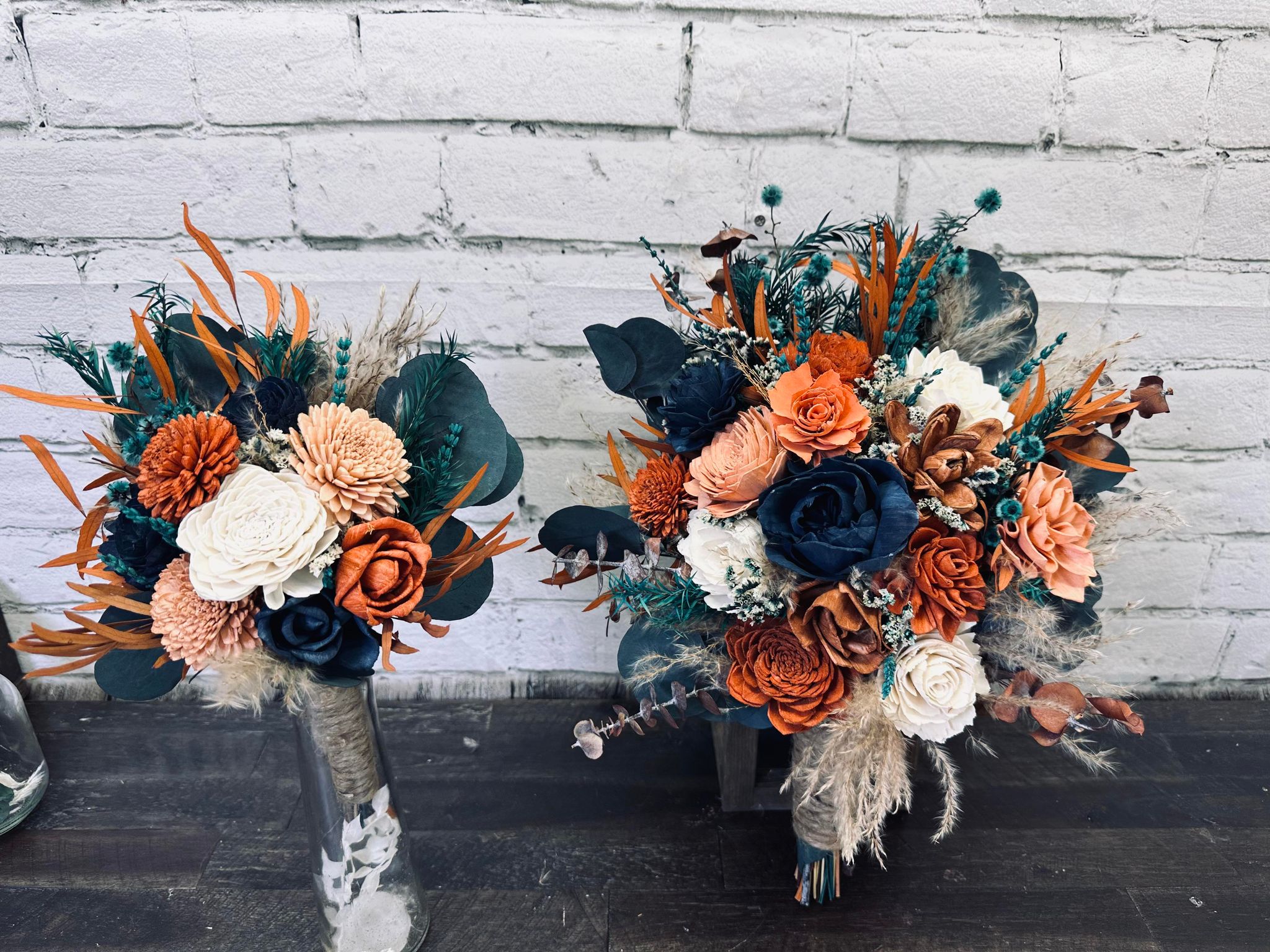 We strive to create every collection as close to the original as possible. These items are hand-crafted. Slight differences from the main photos will occur, as you are not purchasing the photographed items. Your collection is being made to order.. Flower design and fillers may vary due to availability of products.