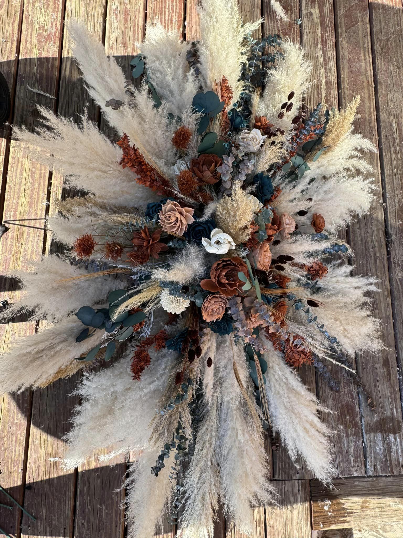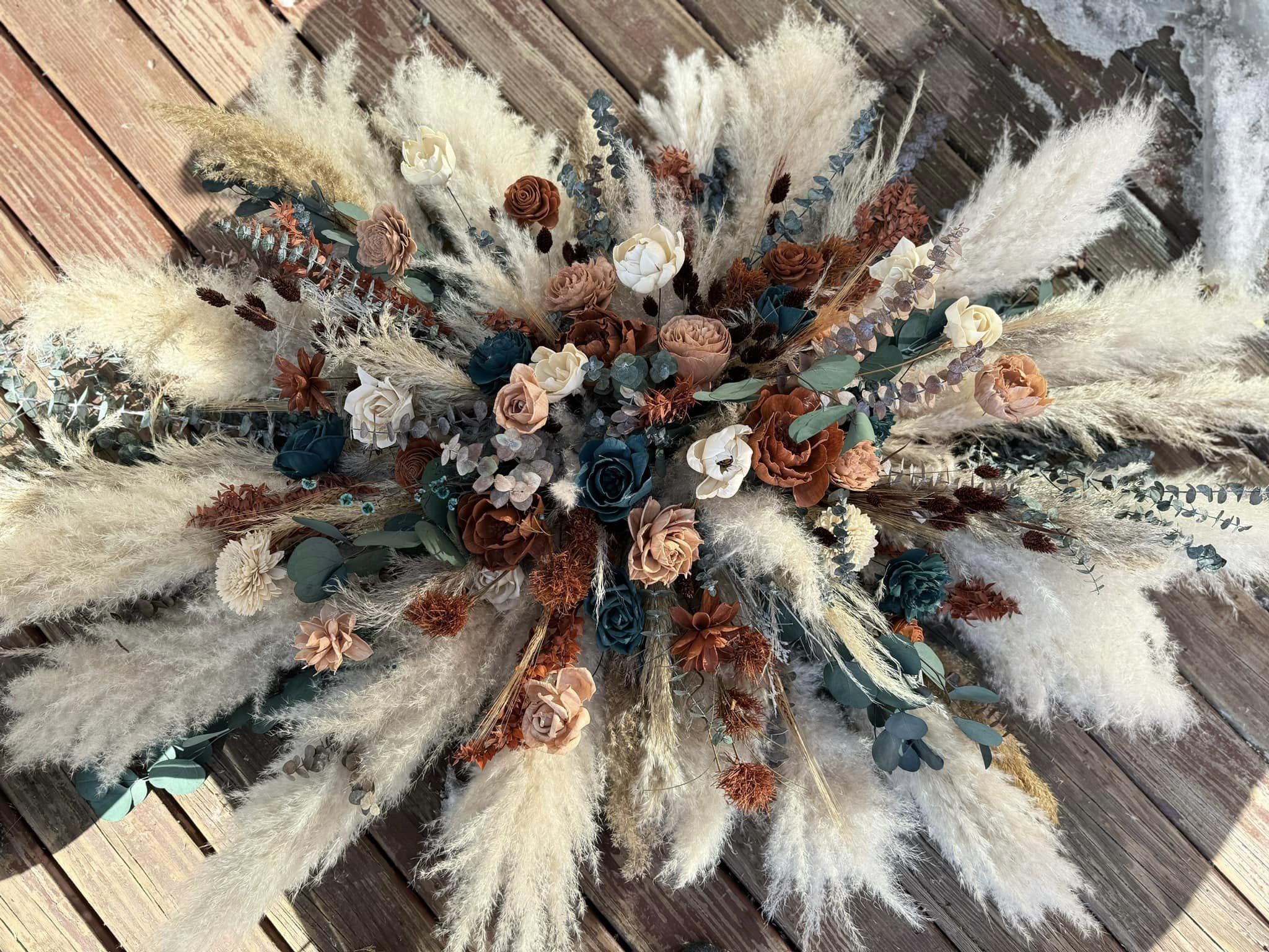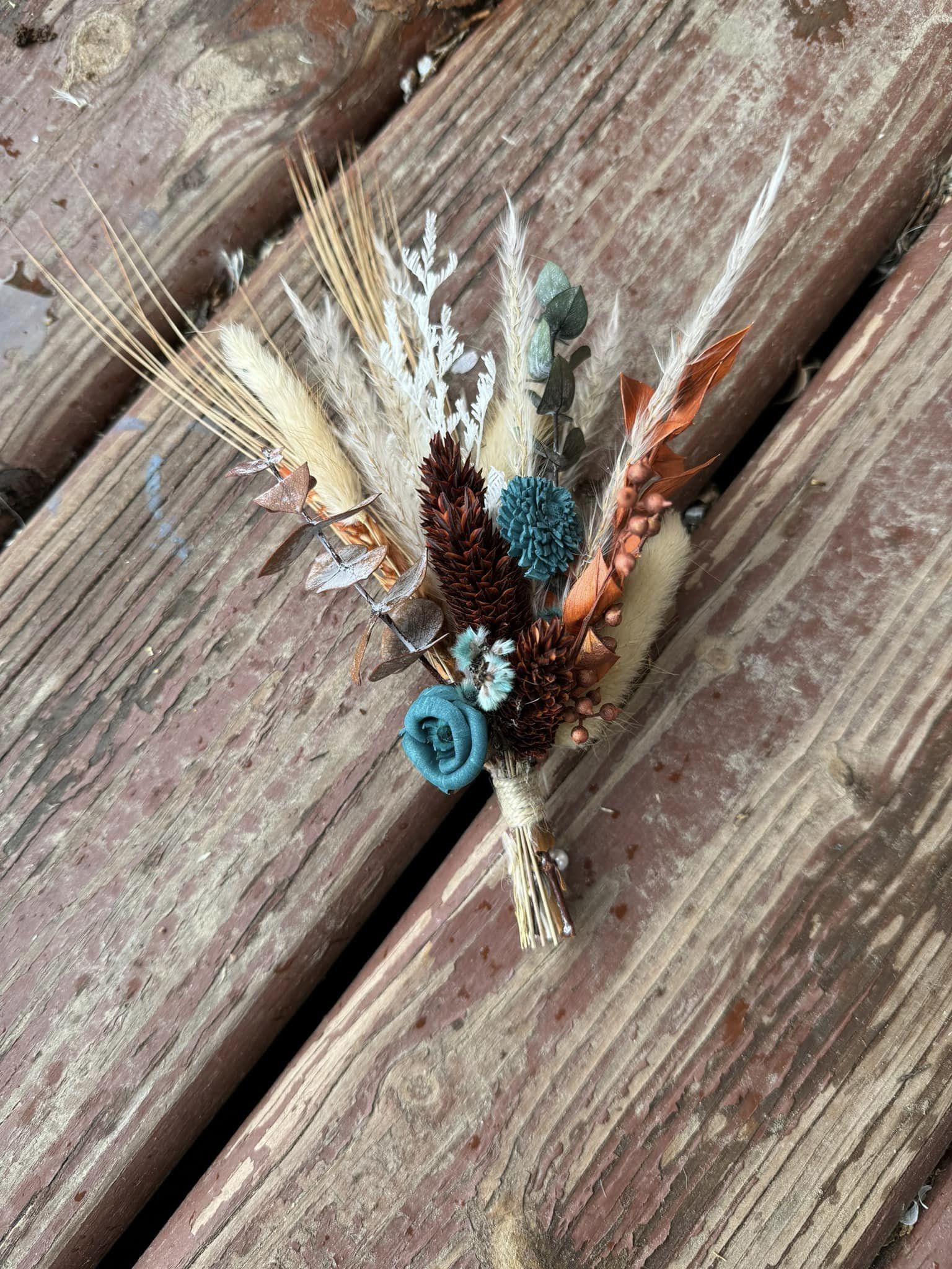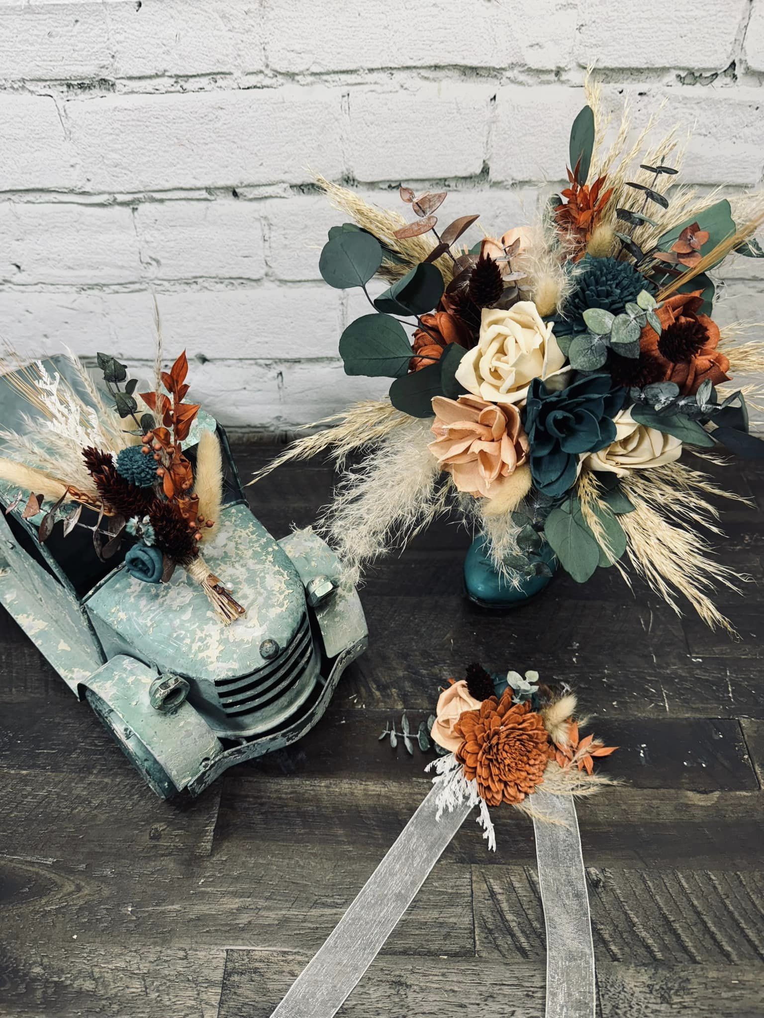 Heart Of Teal Collection:: You may have a heart of gold, but ours is filled with TEAL! This collection of hand dyed wood flowers is complimented but real preserved pampas, spiral & silver dollar eucalyptus, ruscus, and natural dried fillers. Go with your heart, and walk down the aisle with our Heart of Teal Collection!