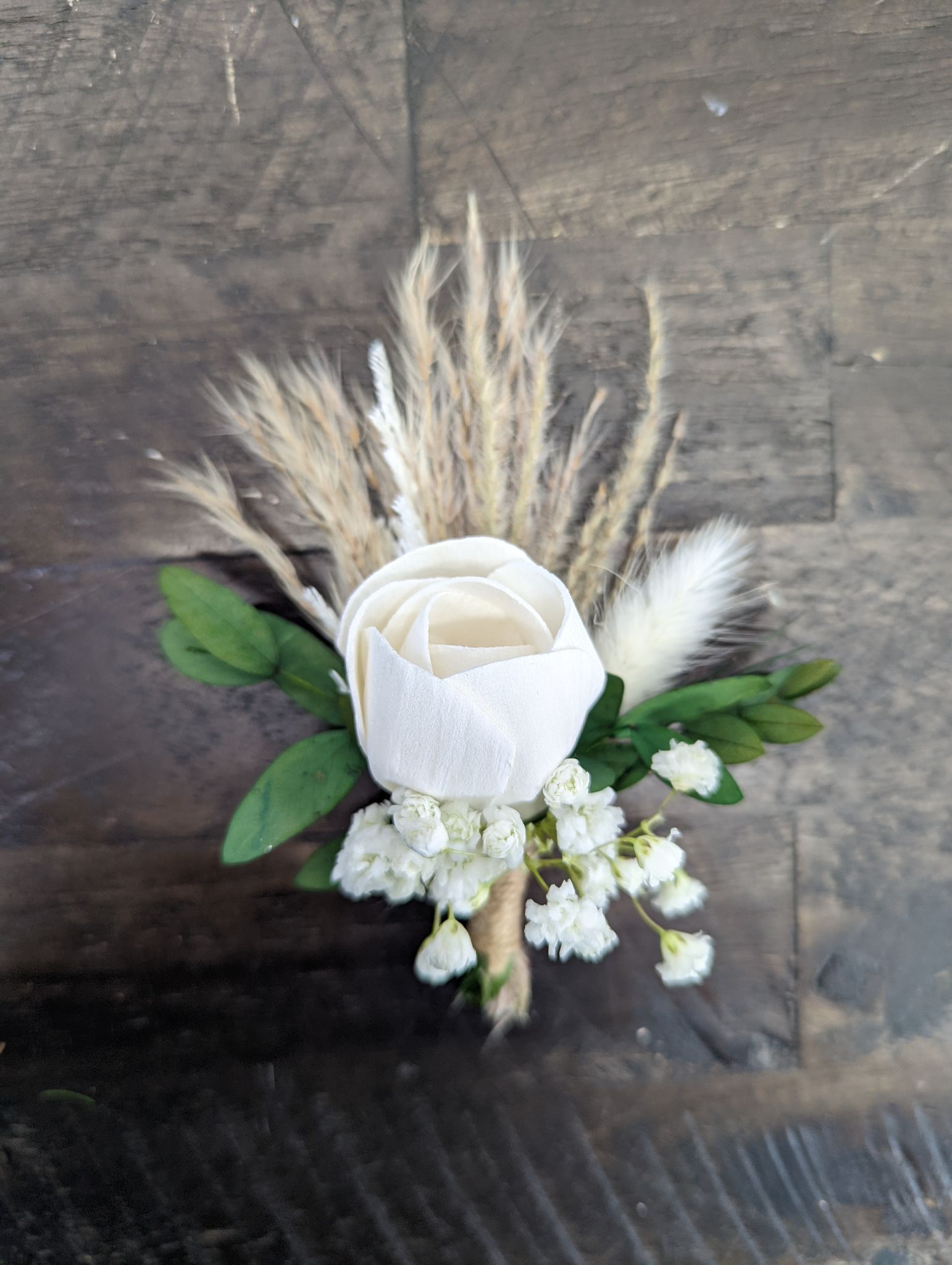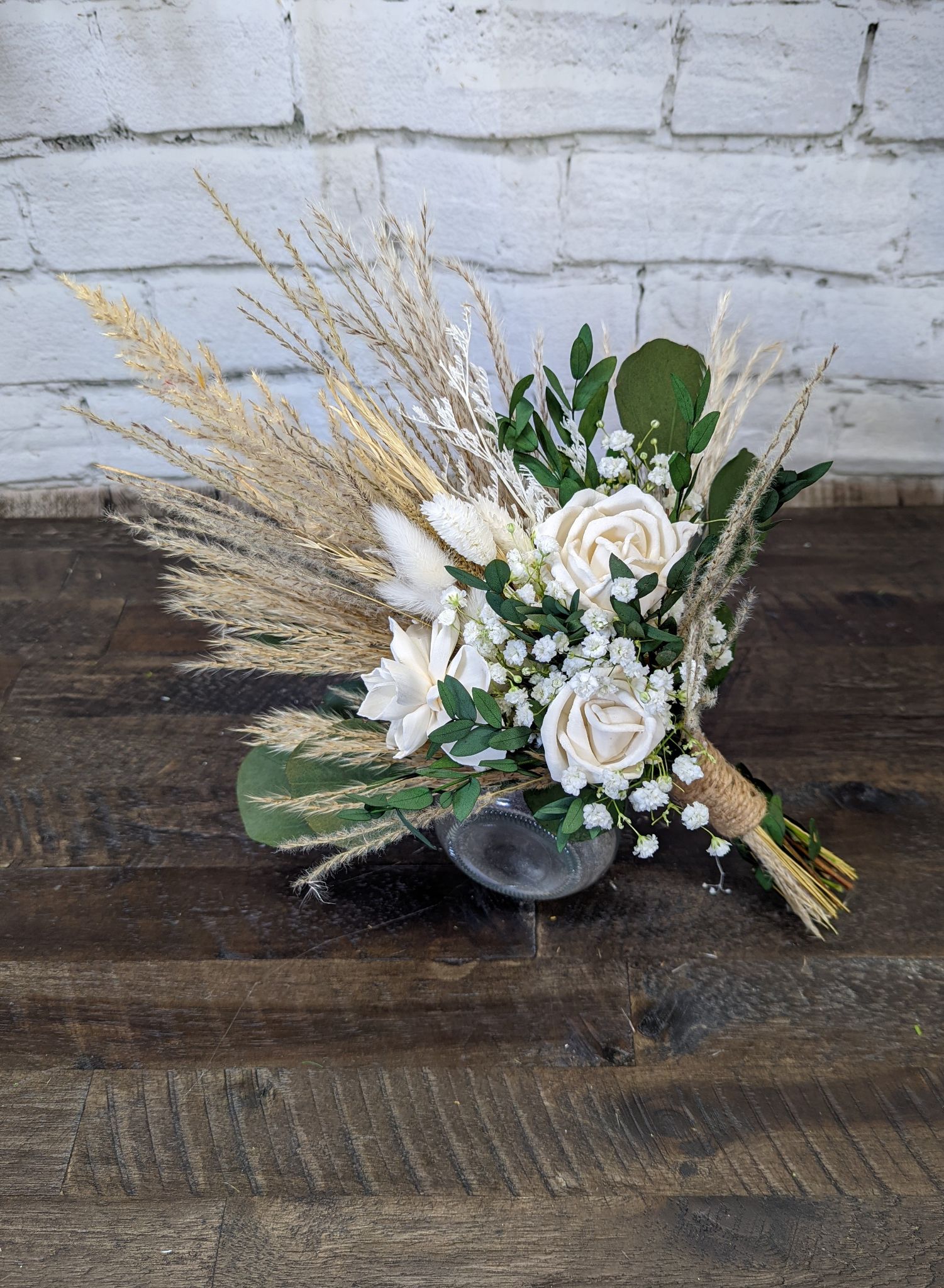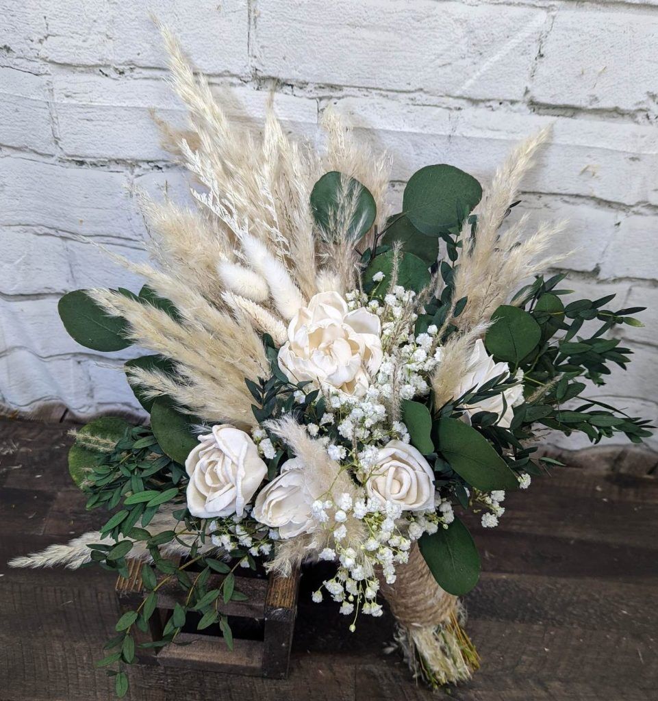Ivory Clouds Collection:: Soar through the skies on your wedding day with our new Ivory Clouds collection! A few beautiful wood flowers surrounded by real preserved pampas, babies breath, and a few types of eucalyptus. This set is sure to leave you, and your guests, on cloud 9!