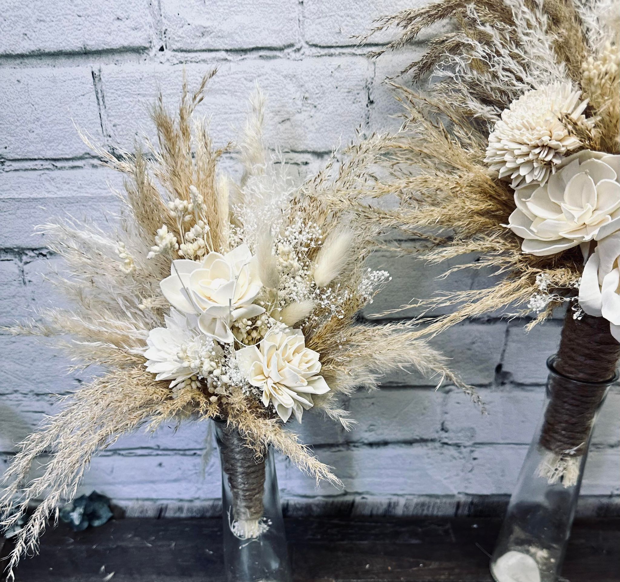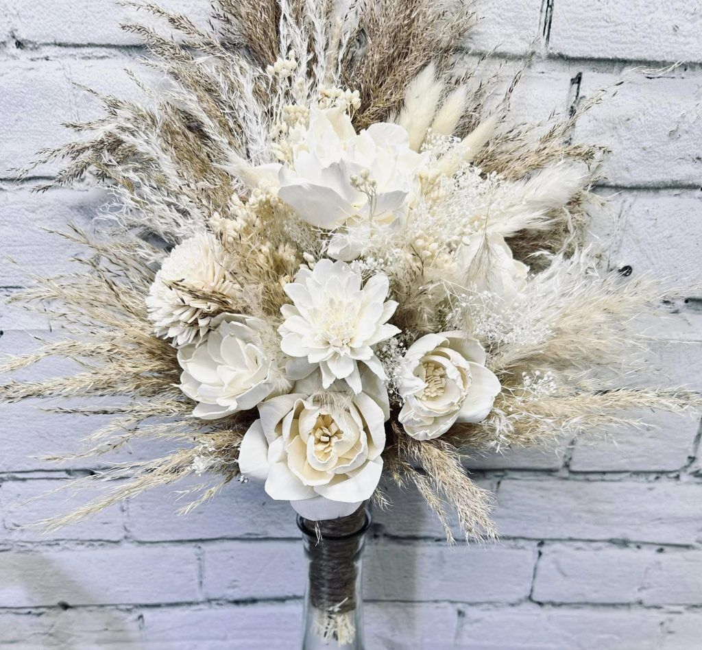 Ivory Night Collection:: What a breath-taking collection of pure beauty! This collection of wood flowers includes real preserved hydrangeas, pampas, babies breath, bunny tails, and natural dried fillers. Be a sight like no other, and walk down the aisle like an angel with our Ivory Night Collection.