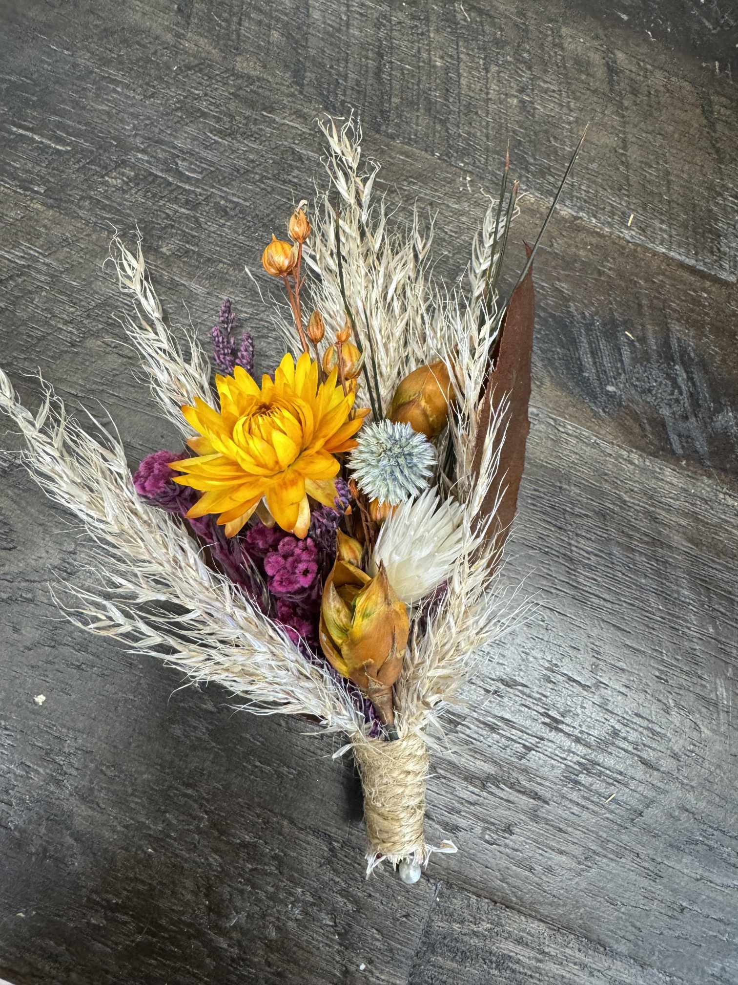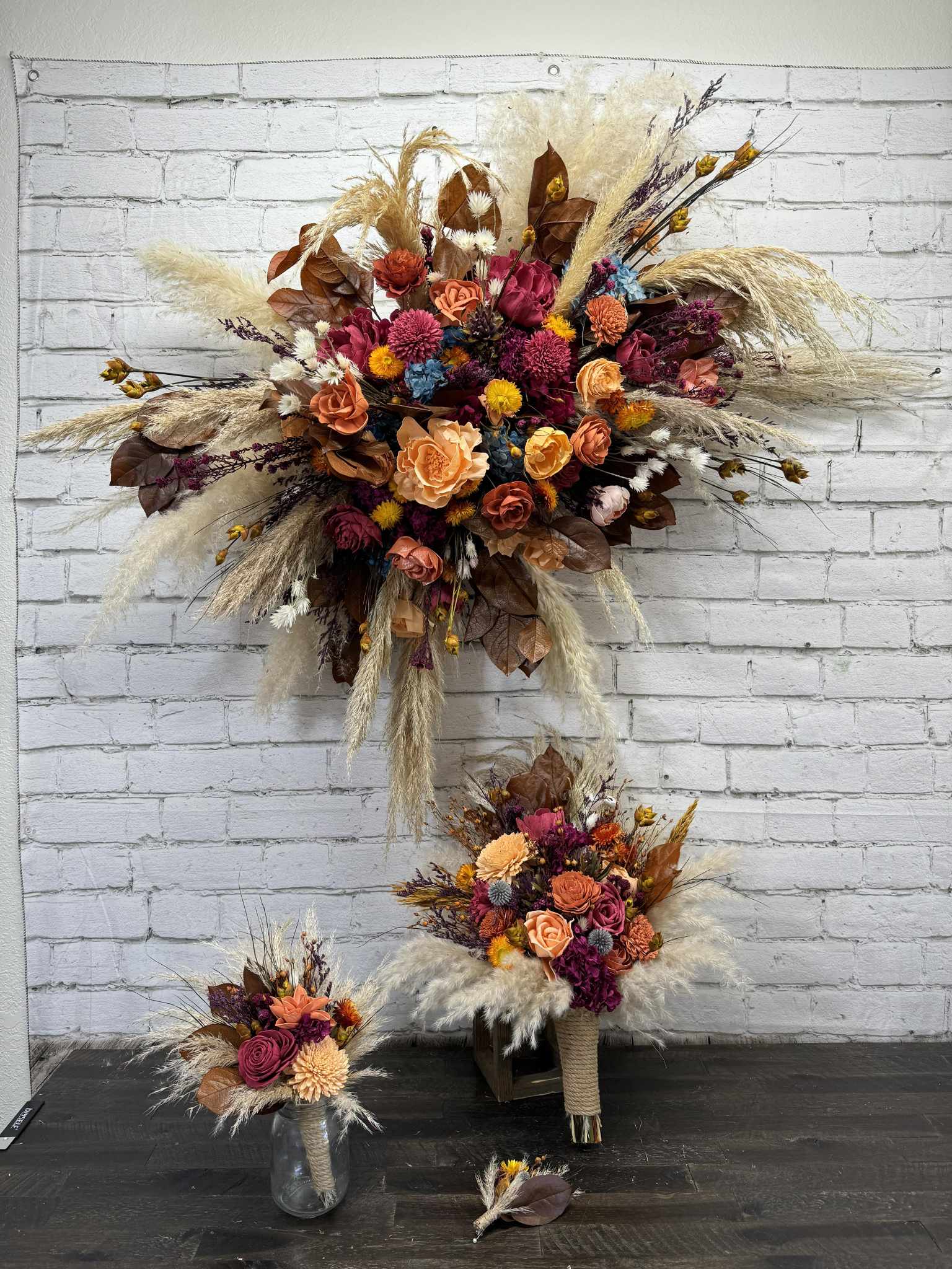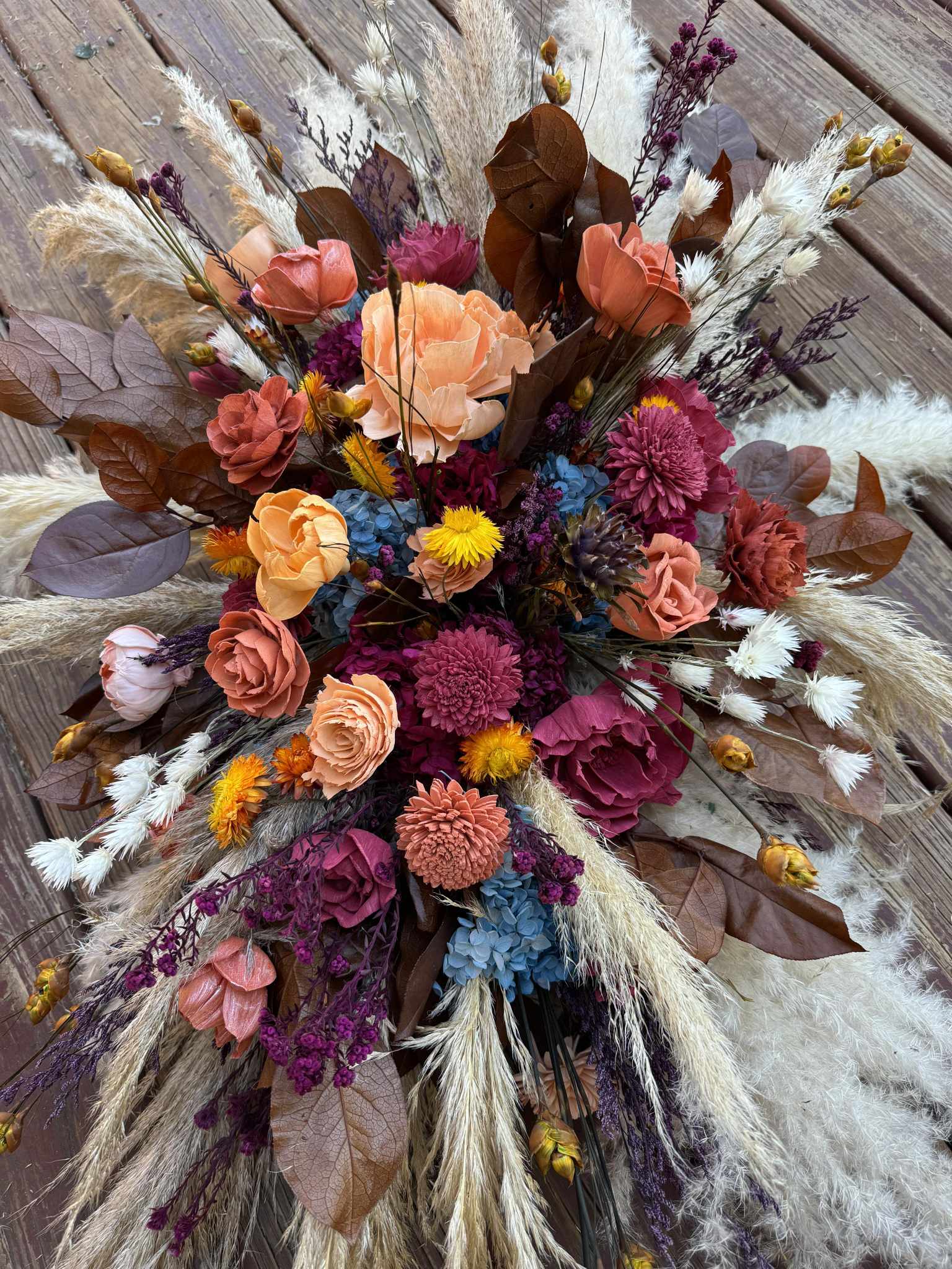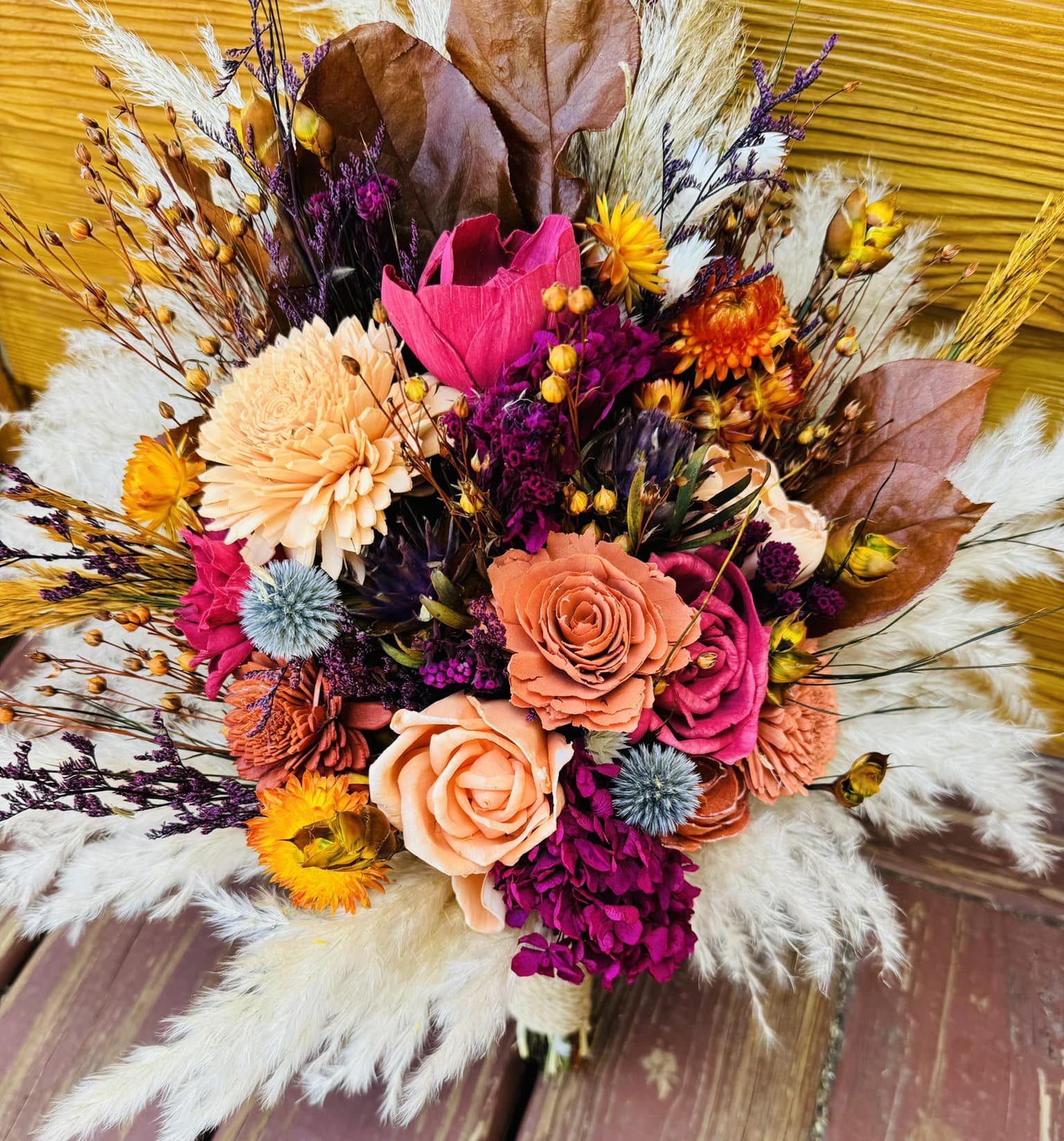 Love Pop Collection:: Stand out in the crowd! This set of hand dyed wood flowers is surrounded by real preserved pampas, salal, hydrangeas, and natural dried fillers. Look no further, our Love Pop Collection is the perfect mash-up of a sunrise and a sunset.