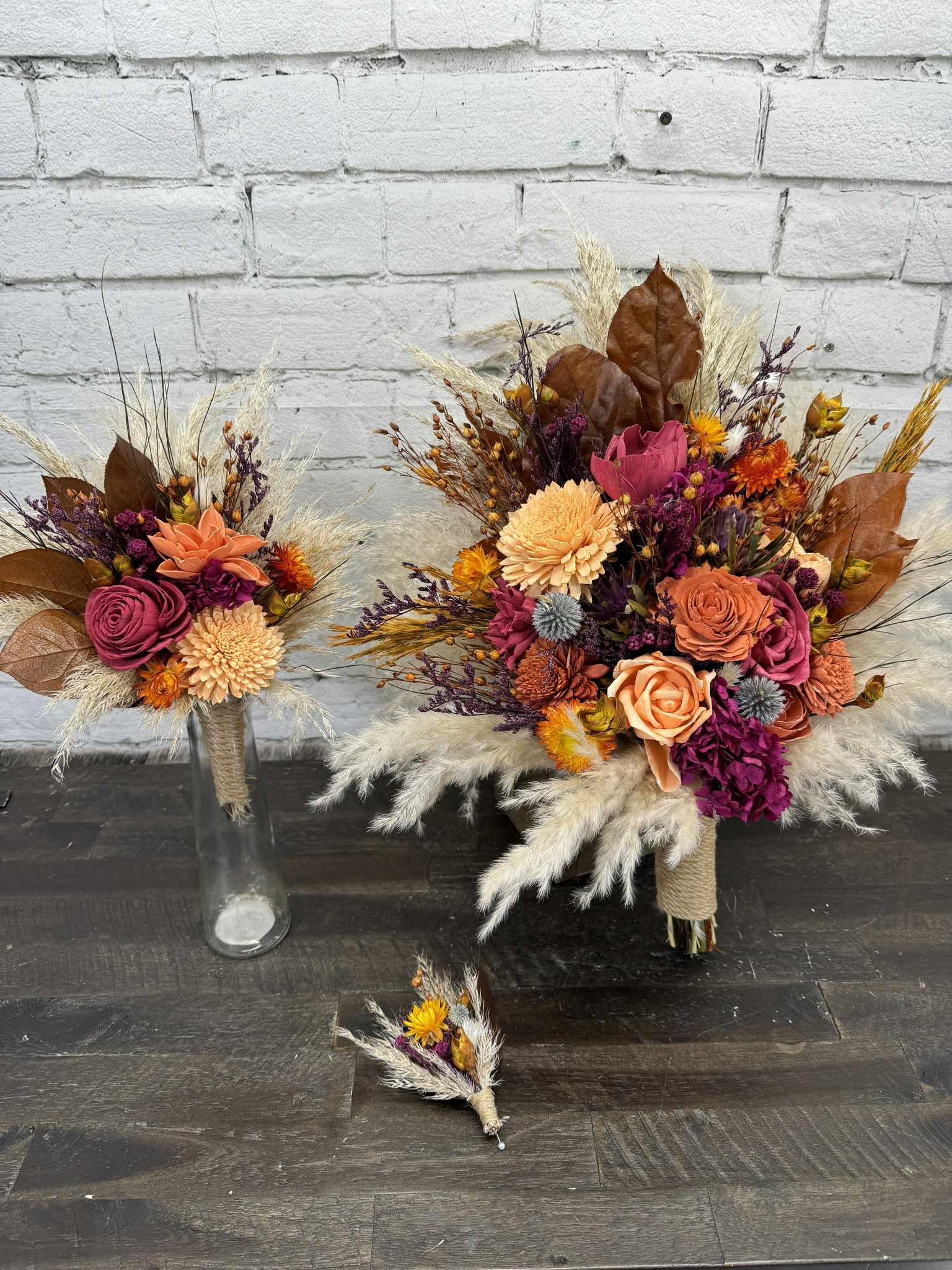 We strive to create every collection as close to the original as possible. These items are hand-crafted. Slight differences from the main photos will occur, as you are not purchasing the photographed items. Your collection is being made to order.. Flower design and fillers may vary due to availability of products.