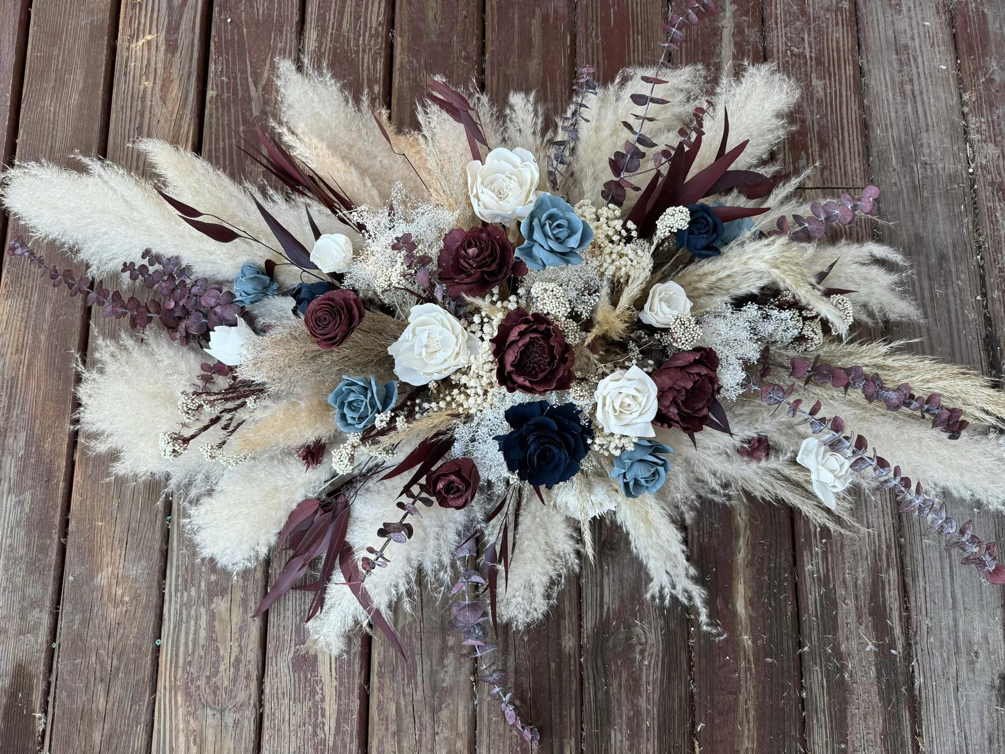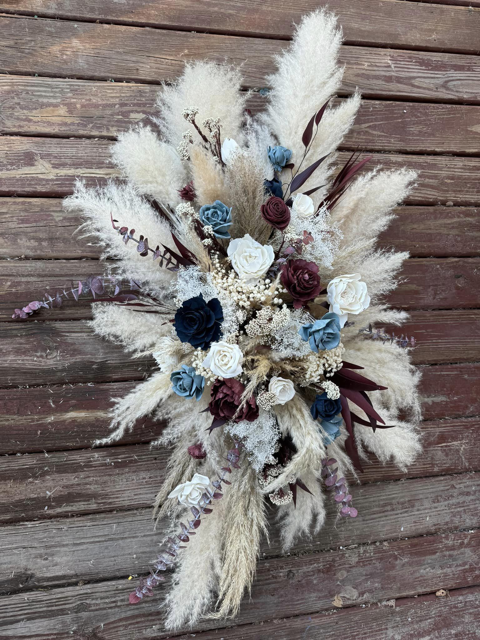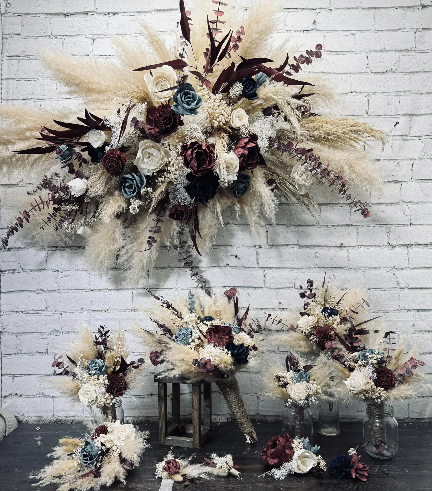 Maroon Skies Collection:: Who knew putting a warm color with a colder palette would be such a breath-taking creation! This variety of hand dyed wood flowers is finished with real preserved pampas, spiral & willow eucalyptus, bunny tails, babies' breath, and natural dried fillers. Take all your guests on a warm fly through the clouds with our Maroon Skies Collection!