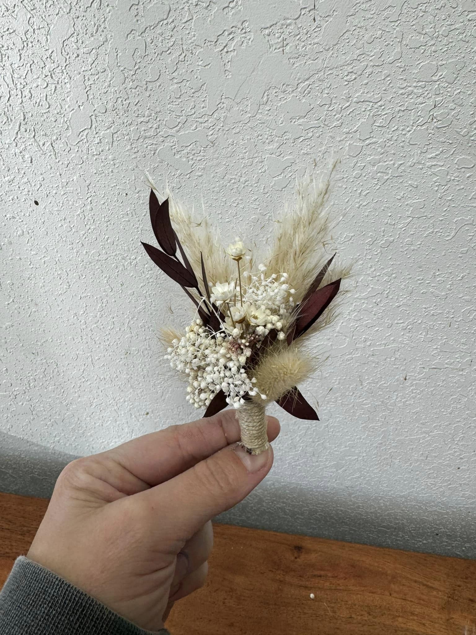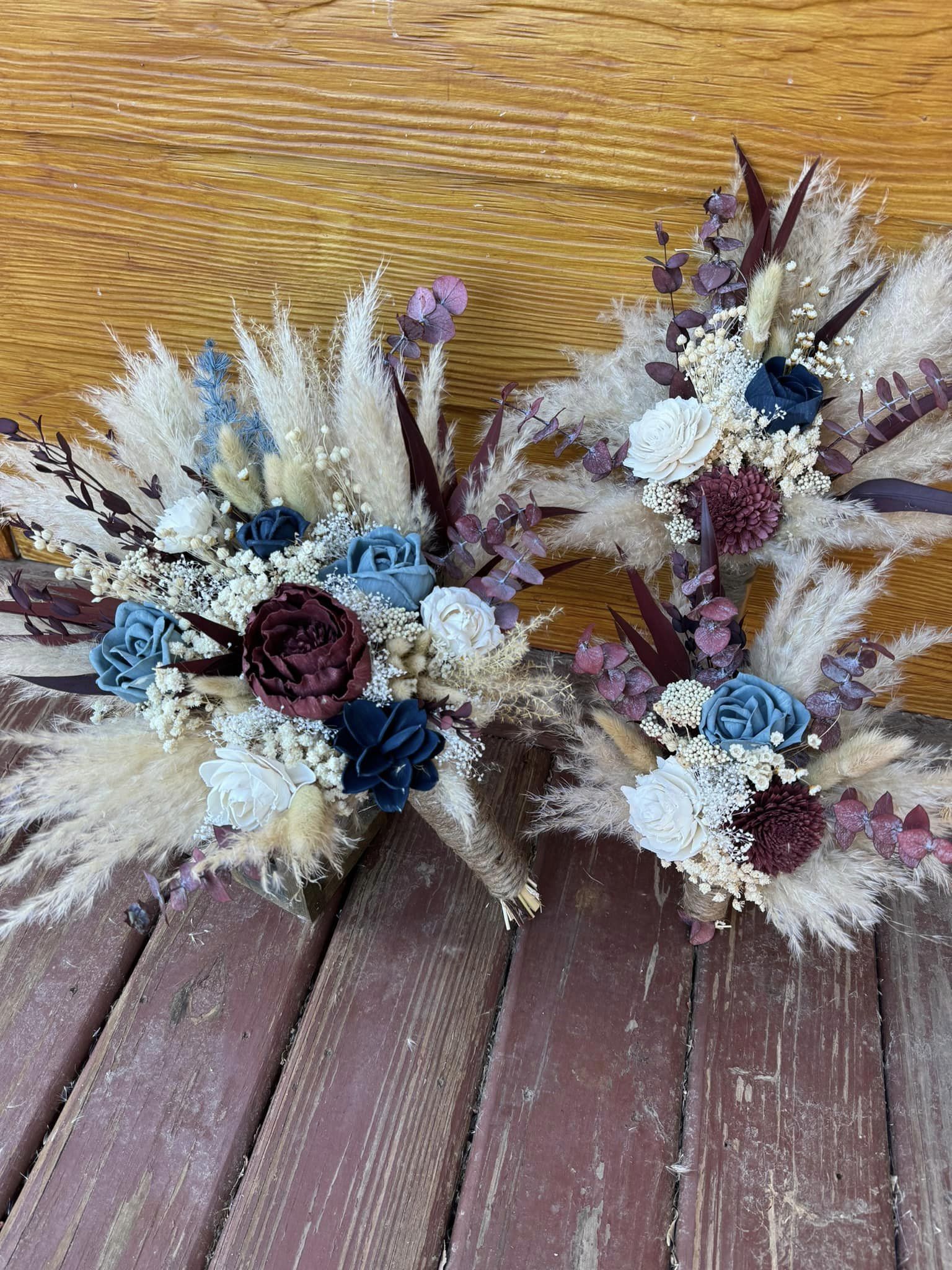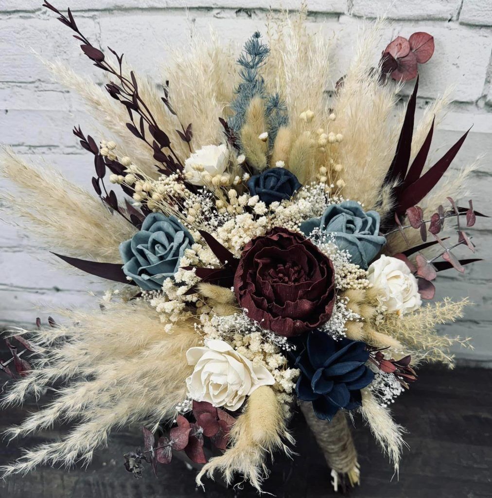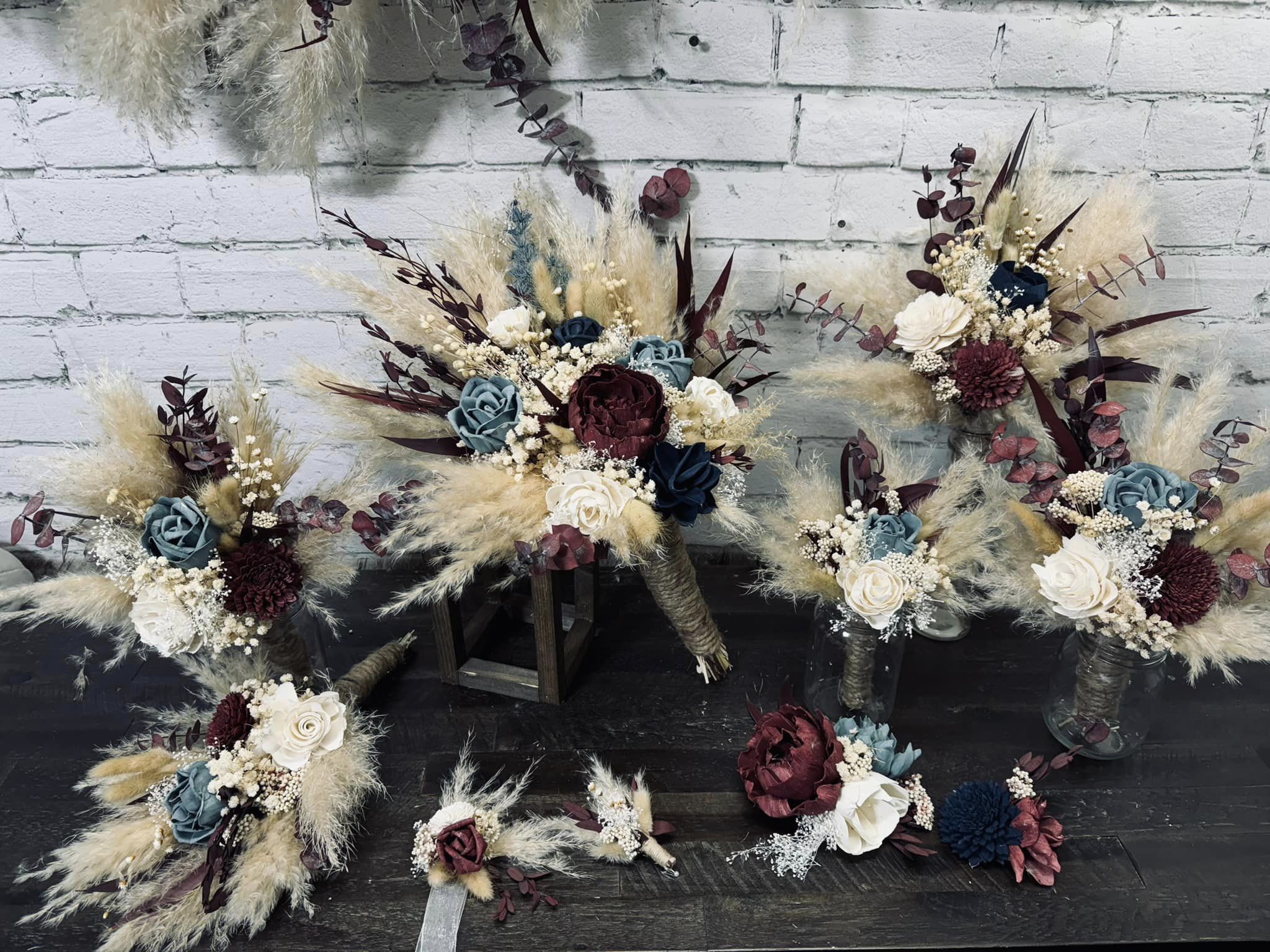 Maroon Skies Collection:: Who knew putting a warm color with a colder palette would be such a breath-taking creation! This variety of hand dyed wood flowers is finished with real preserved pampas, spiral & willow eucalyptus, bunny tails, babies' breath, and natural dried fillers. Take all your guests on a warm fly through the clouds with our Maroon Skies Collection!