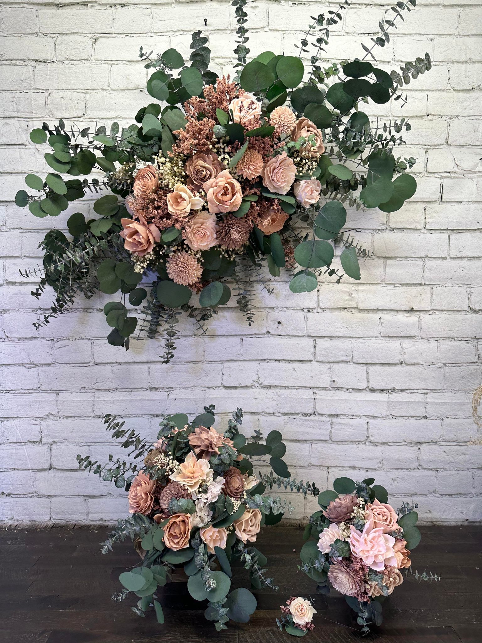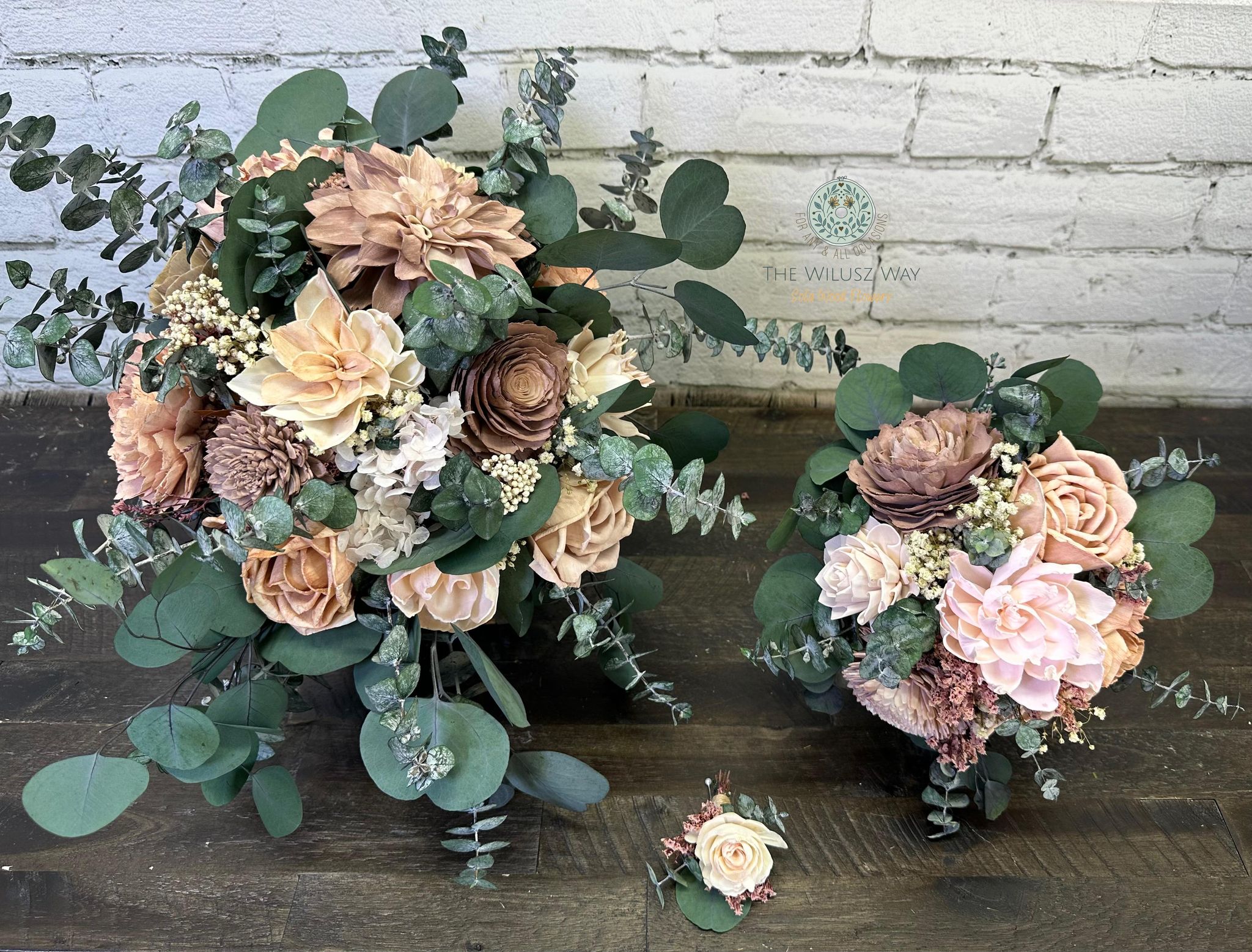 We strive to create every collection as close to the original as possible. These items are hand-crafted. Slight differences from the main photos will occur, as you are not purchasing the photographed items. Your collection is being made to order.. Flower design and fillers may vary due to availability of products.