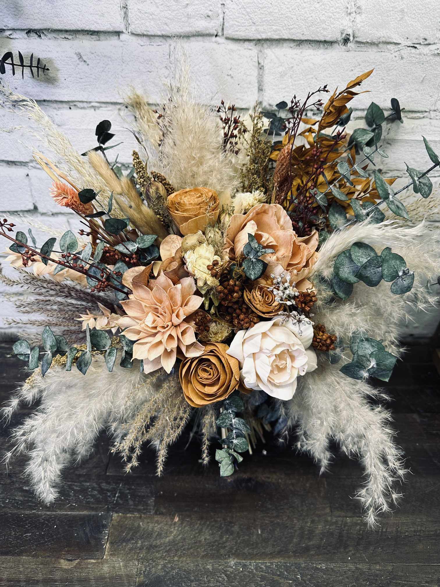 Mellow Yellow Collection:: A walk in the park on a sunny day, captured, in this fantastically warm collection. Hand dyed wood flowers finished with real preserved pampas, spiral eucalyptus, bunny tails, ruscus, and natural dried fillers. Rain or shine, our "Mellow Yellow" Collection is sure to brighten the light and warm everyone's heart on your special day.