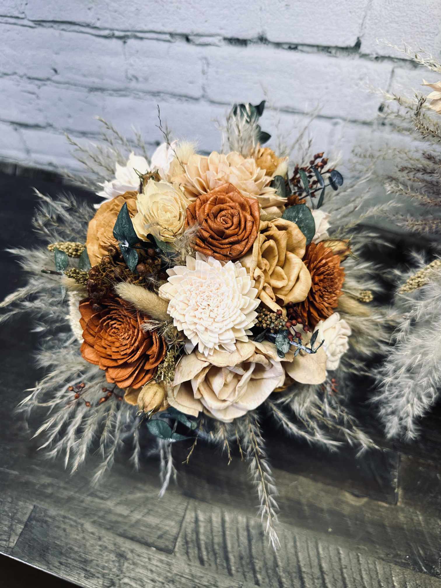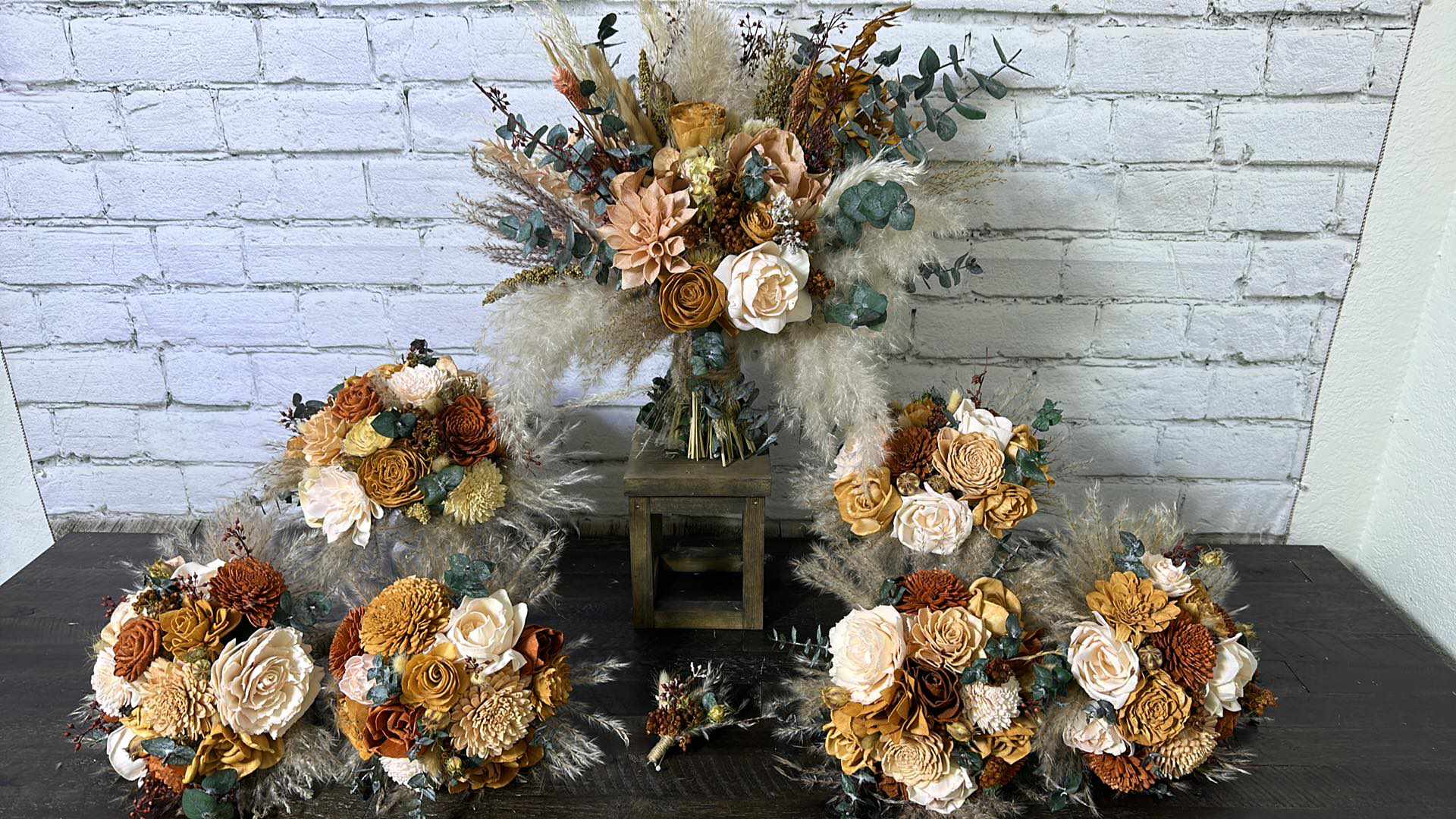We strive to create every collection as close to the original as possible. These items are hand-crafted. Slight differences from the main photos will occur, as you are not purchasing the photographed items. Your collection is being made to order.. Flower design and fillers may vary due to availability of products.