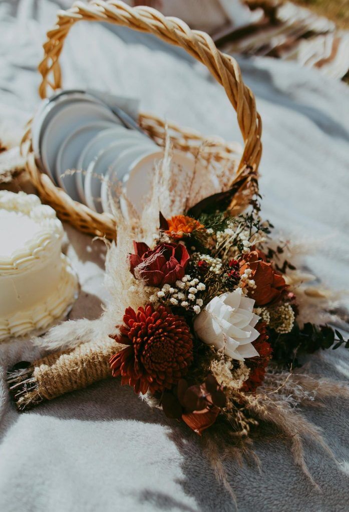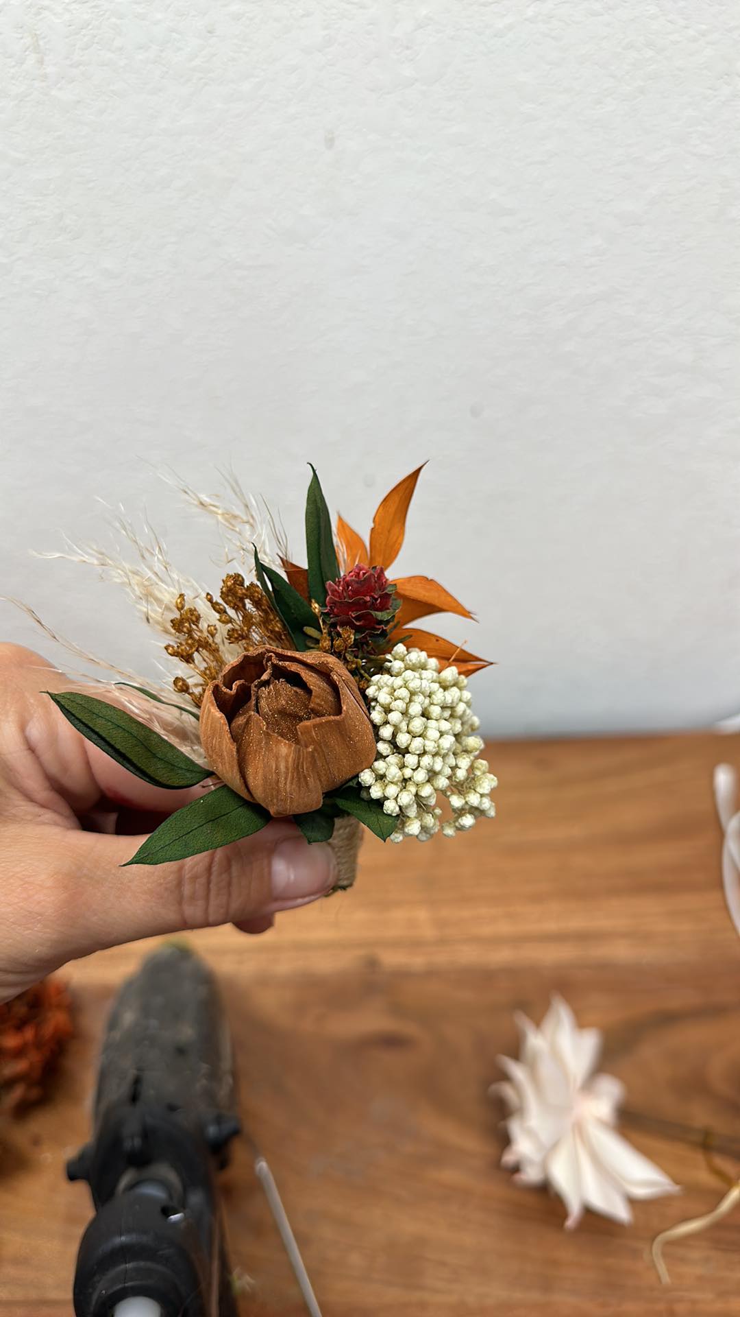Mountain Enchanment Collection:: This boho set is the perfect earthy mix! Tones of burnt orange, rustic red, ivory & all the earthy natural pops. Our hand-dyed wood flowers are surrounded by real preserved pampas, spiral and willow eucalyptus, bunny tails, babies' breath, and natural dried fillers. Mountain Enchantment will compliment your special day no matter where or what time of year!