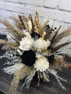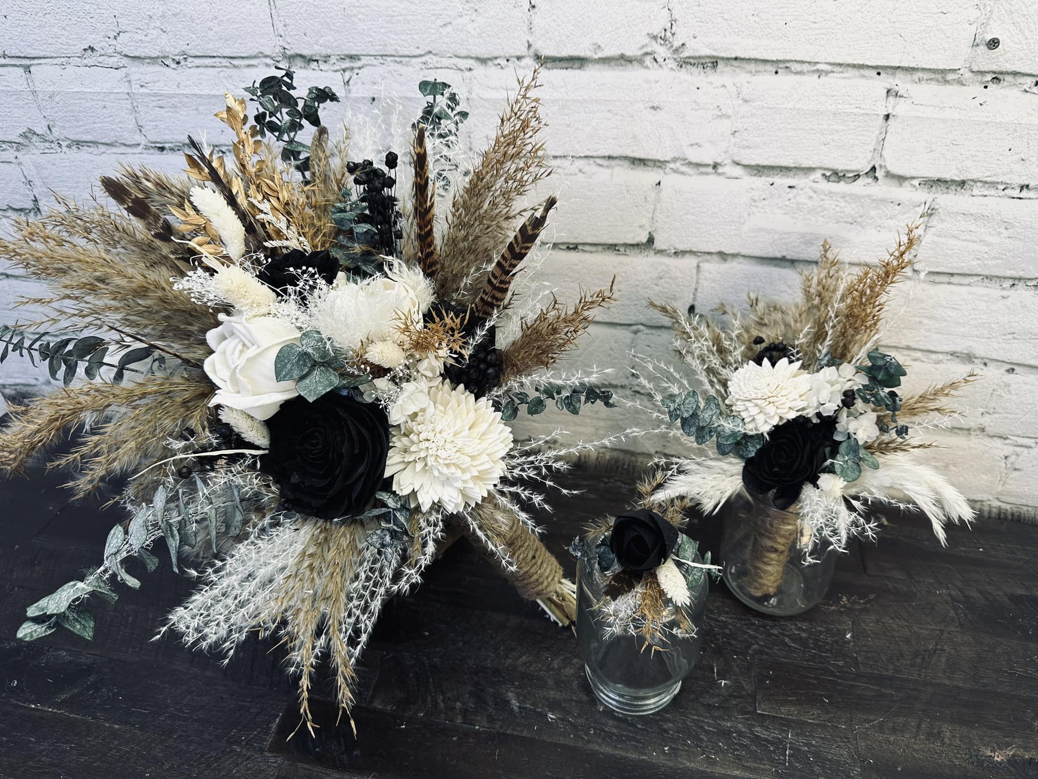 Natural Beauty Collection:: This set has such natural beauty! The soft mix of ivory & natural tones with just a touch of black & pheasant feathers give this collection a natural look. It's highlighted with all real preserved pampas, spiral eucalyptus, and fillers! Our Natural Beauty collection brings that romantic boho feel to your special day.