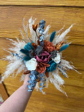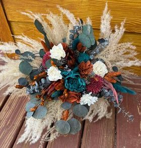 Night's With You Collection:: All the memories of a budding romance helped inspire the design of this warm set! An array of hand dyed wood flowers are complemented by all real preserved pampas, bunny tails, natural dried fillers and spiral, willow, and silver dollar eucalyptus. Walk down the aisle with confidence, and our newest collection "Night's With You"!