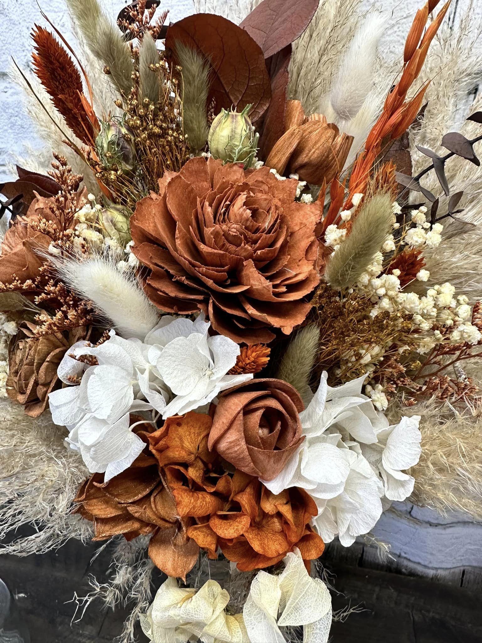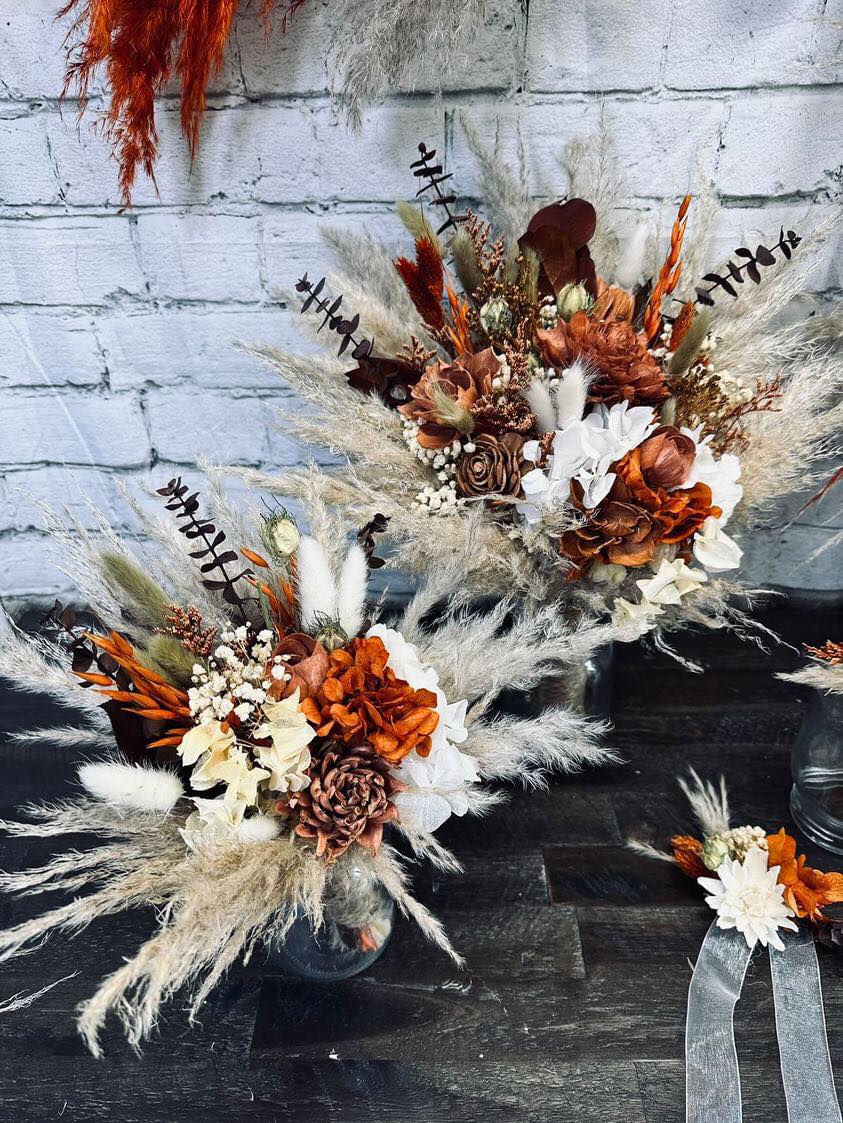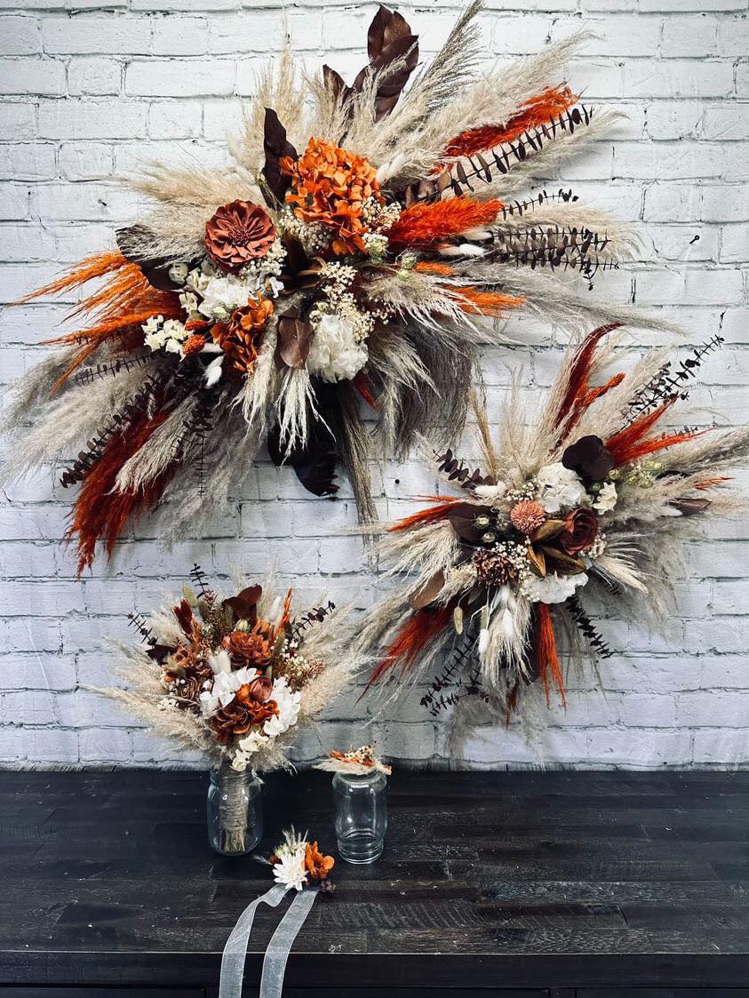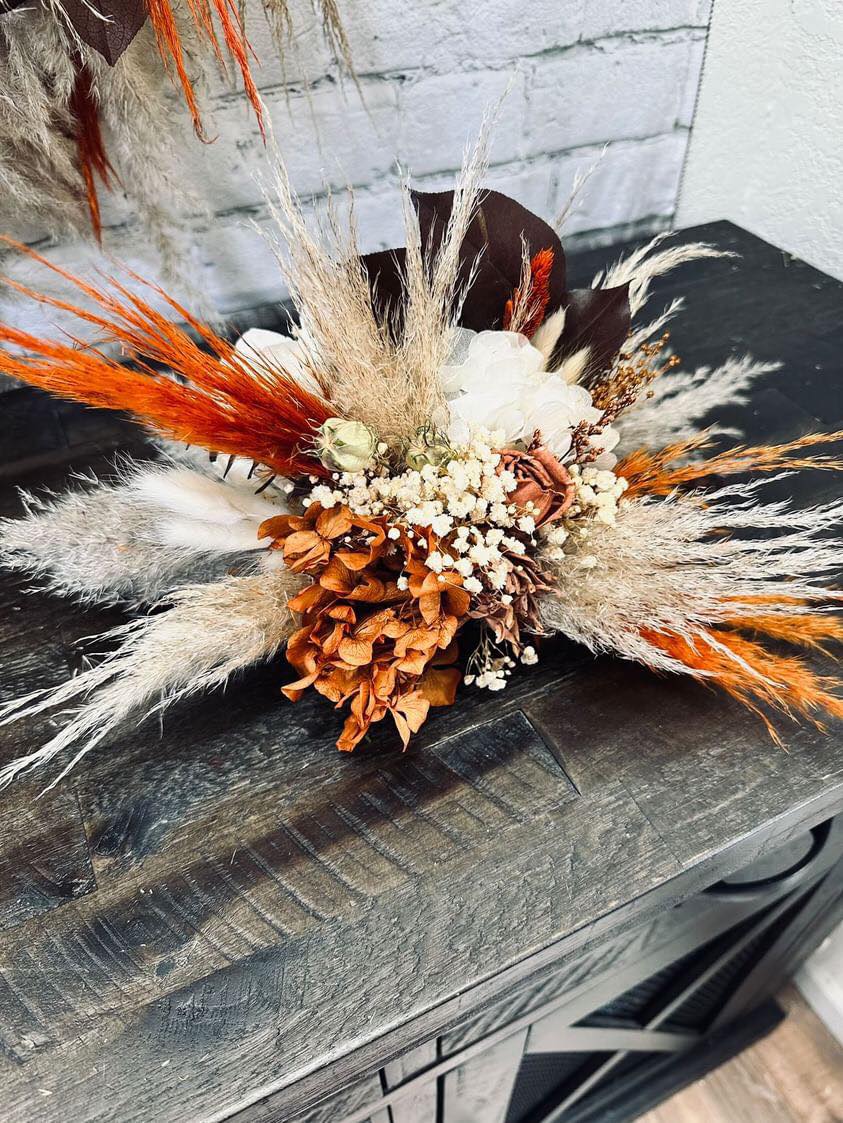 October Harvest Collection:: We just can't get enough of rustic boho! This gorgeous orange color theme of wood flowers is filled with real preserved pampas, bunny tails, spiral eucalyptus, wheat, babies breath, hydrangeas, salal, and natural dried fillers. Warm up your special day with with Our October Harvest Collection!
