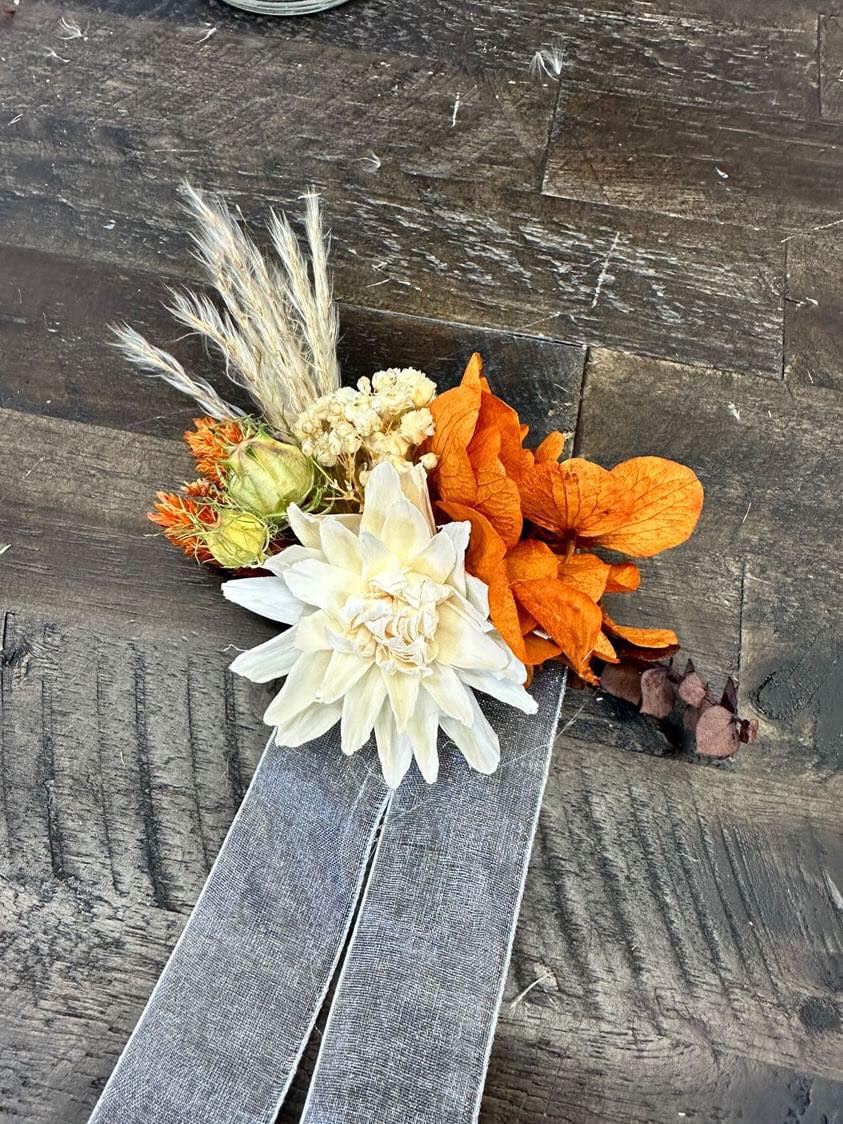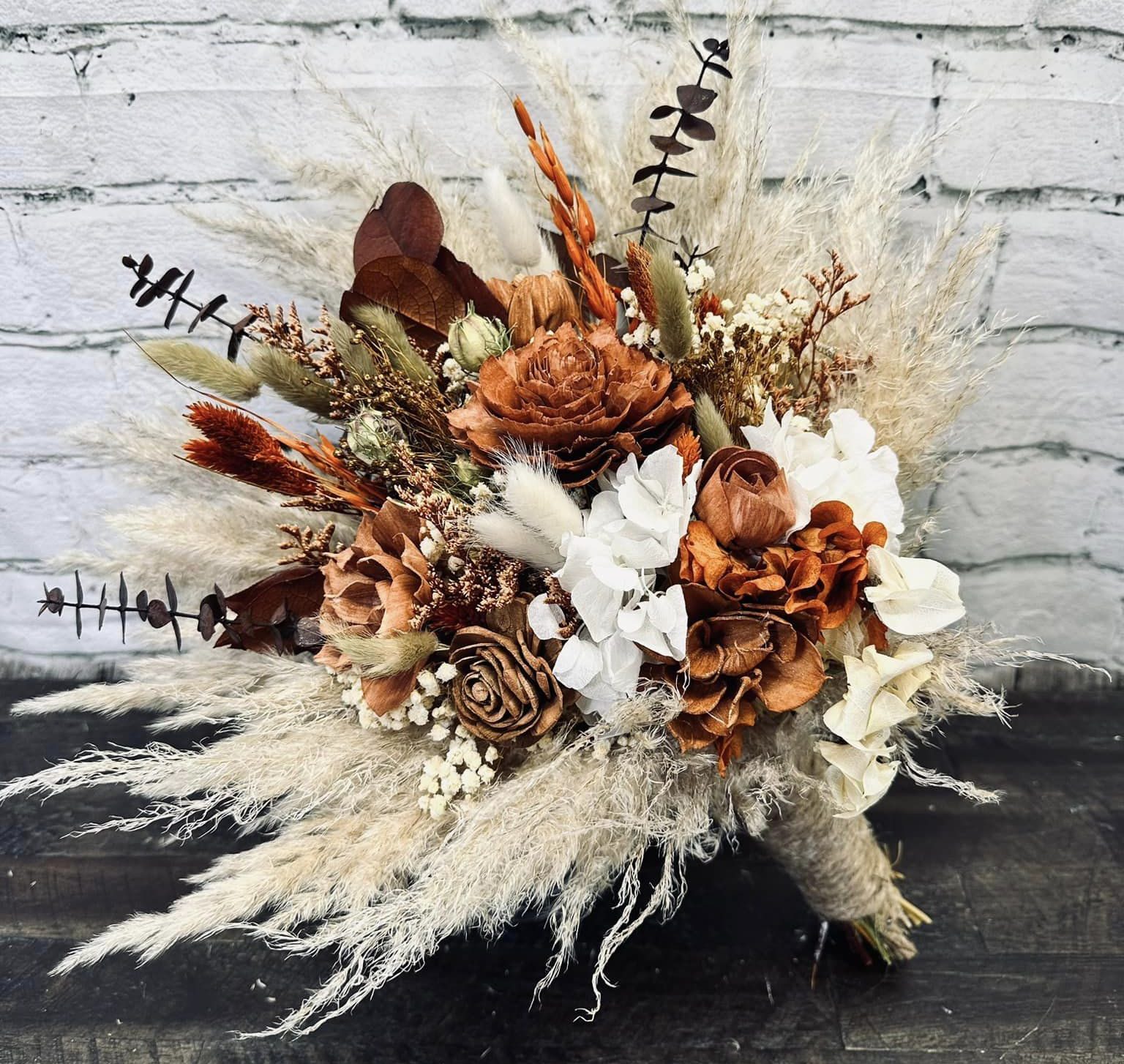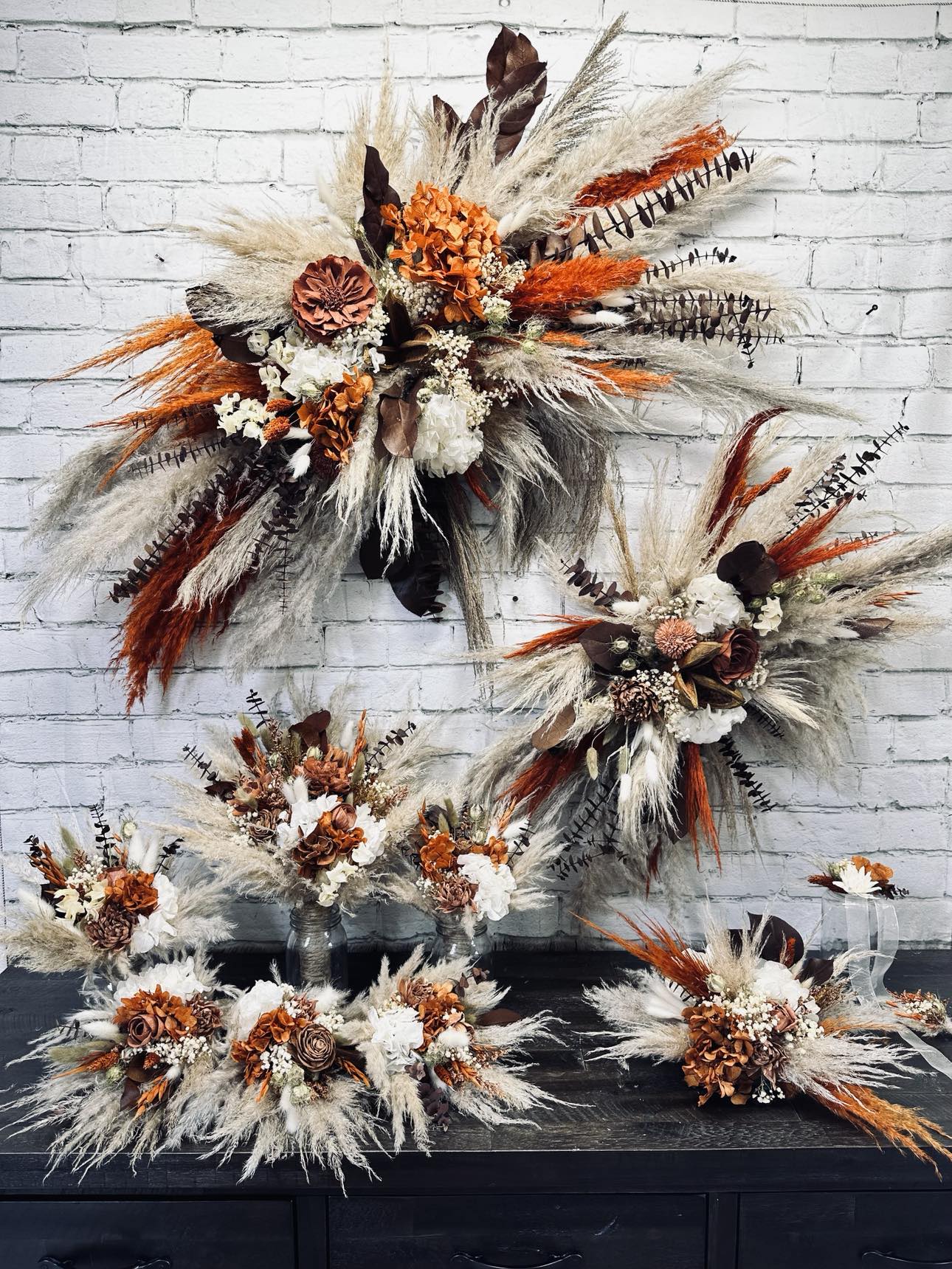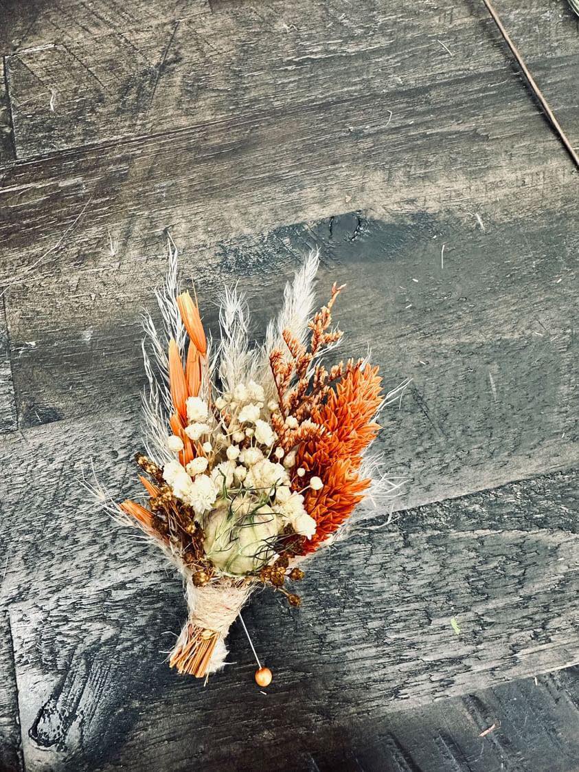 October Harvest Collection:: We just can't get enough of rustic boho! This gorgeous orange color theme of wood flowers is filled with real preserved pampas, bunny tails, spiral eucalyptus, wheat, babies breath, hydrangeas, salal, and natural dried fillers. Warm up your special day with with Our October Harvest Collection!