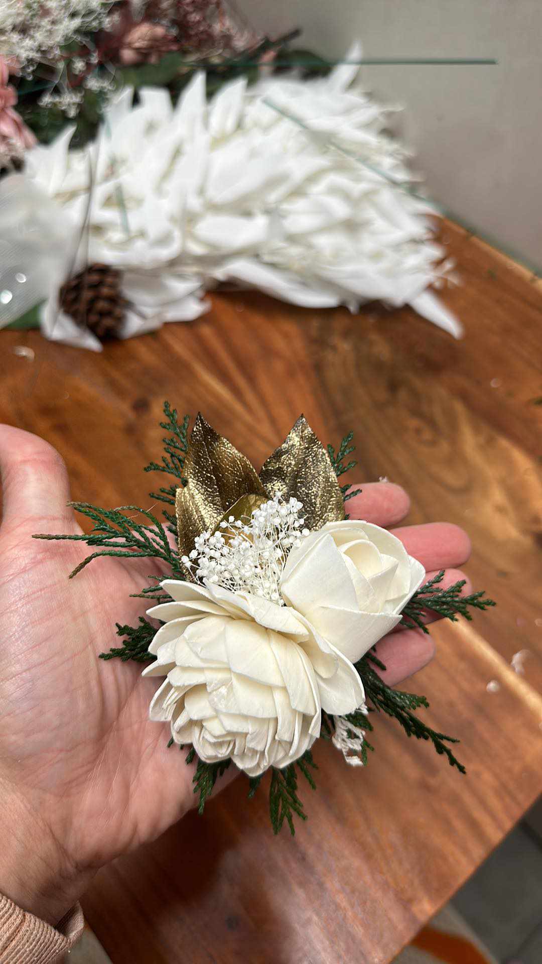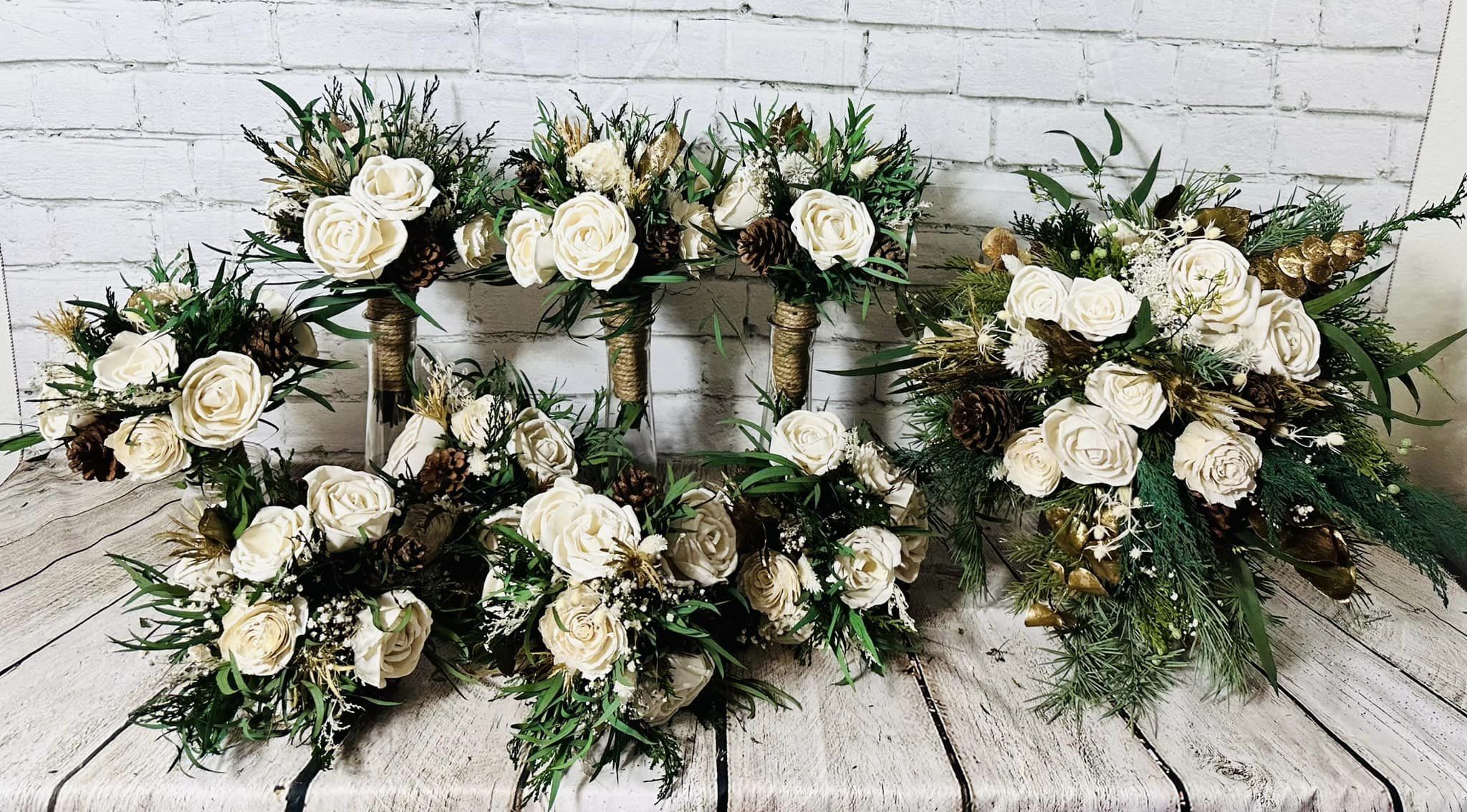 Pine Dreams Collection:: Make all your winter wedding dreams come true. This set features a handful of wood flowers completed with real preserved eucalyptus, pine cones, and winter greenery. Complete your winter wonderland wedding with our Pine Dreams Collection!