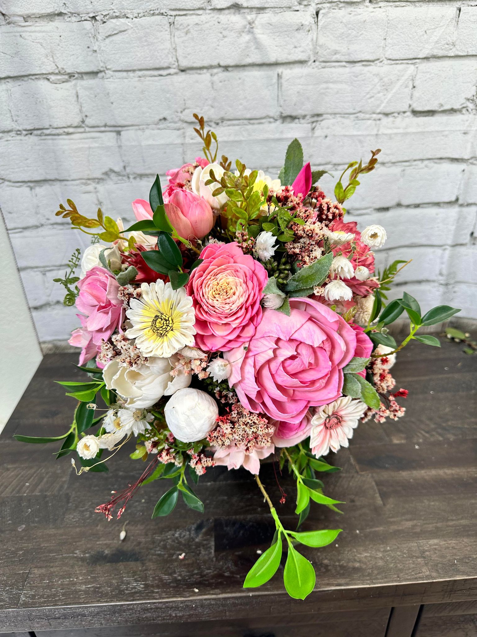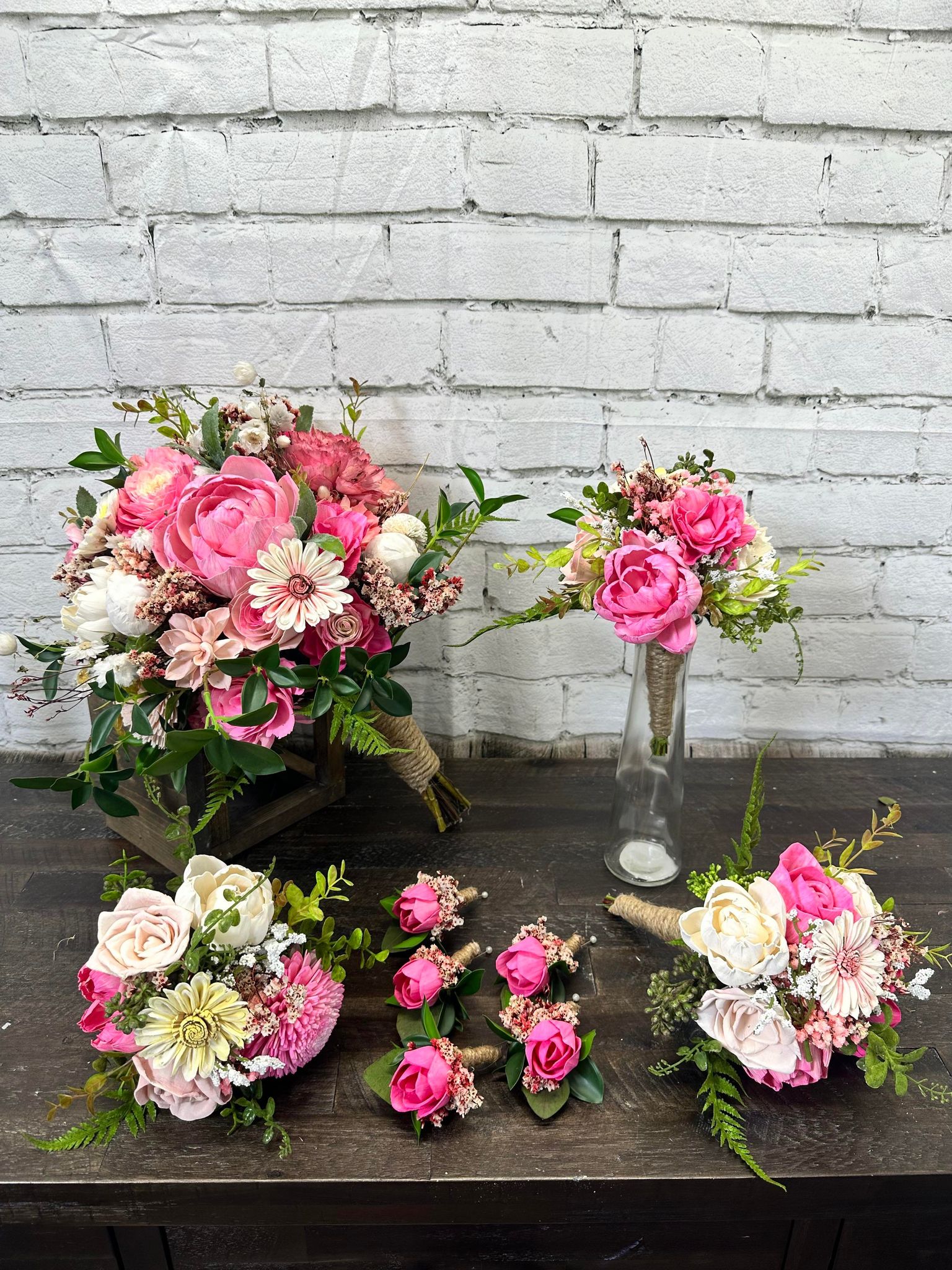 Pink Petals Collection:: You won't miss a beat with this spring line up! Bursting with a variety of bright and pastel pinks,"Pink Petals" will elevate your wedding day look to a new level. Highlighted with spring daisies, finished with greenery to complete a fresh bouquet for your new beginning.