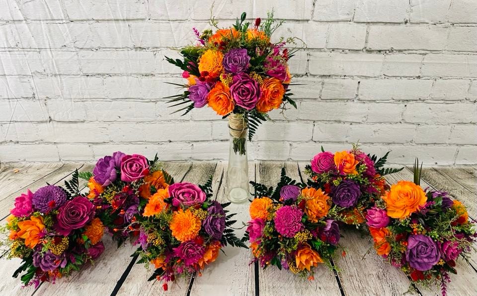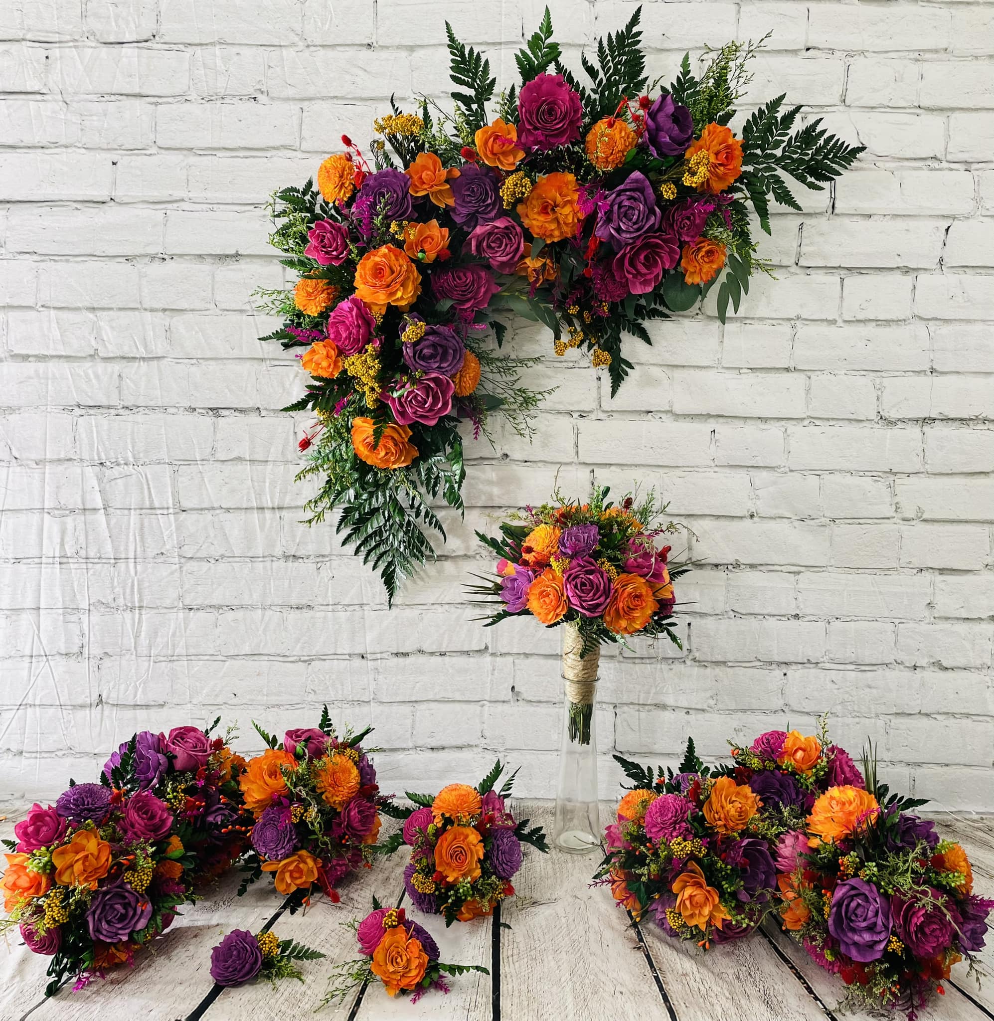 We strive to create every collection as close to the original as possible. These items are hand-crafted. Slight differences from the main photos will occur, as you are not purchasing the photographed items. Your collection is being made to order.. Flower design and fillers may vary due to availability of products.