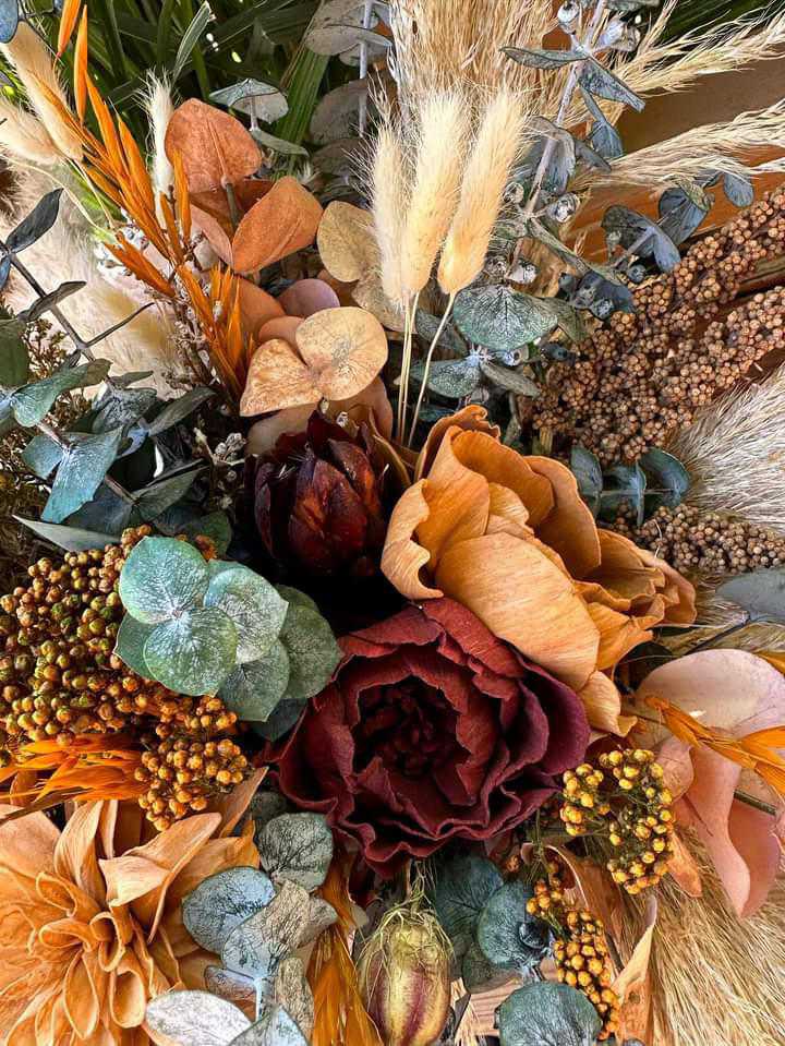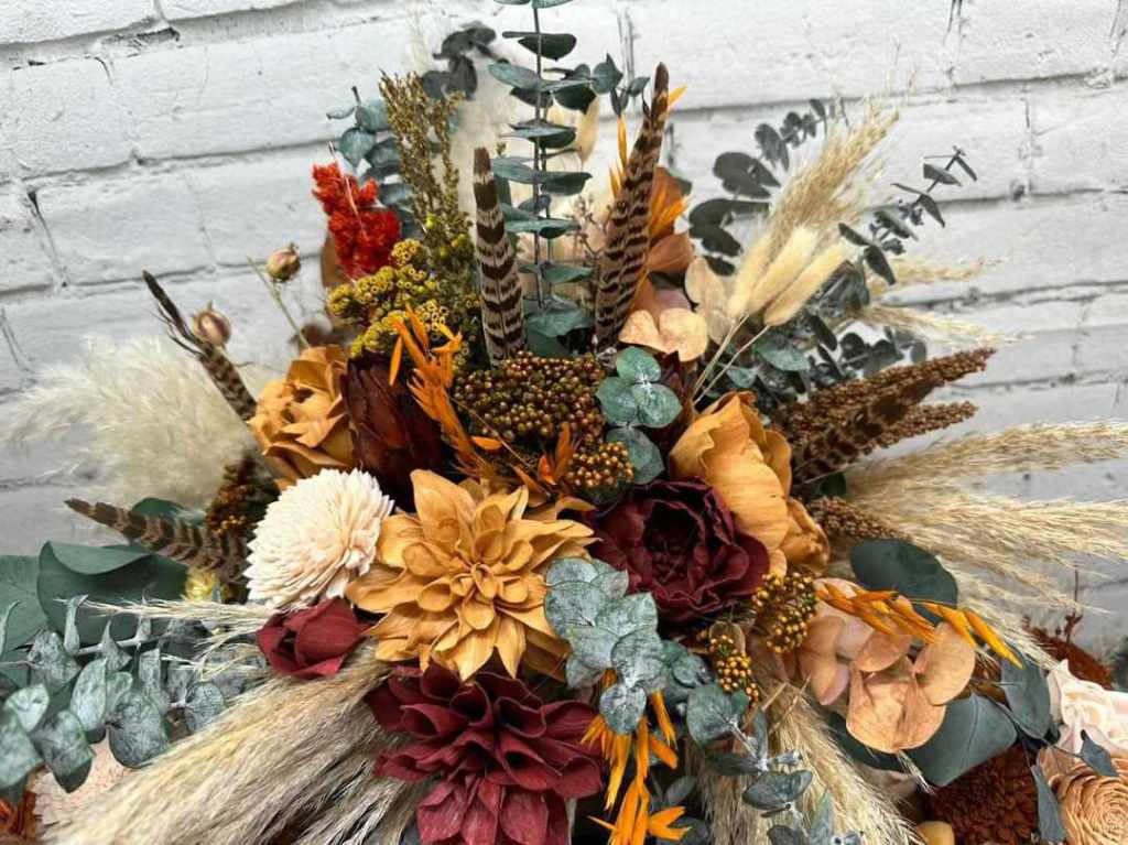 Repens Blume Collection:: Overflowing warm colors, mixed with rustic boho, gives us such a romantic fun vibe! This set of hand dyed wood flowers feature a repen flower and Pheasant feathers; they are finished with all real preserved pampas, spiral & silver dollar eucalyptus, bunny tails, and natural dried fillers. With our "Repens Blume" Collection, your entire style will be tied together, while you tie the knot!