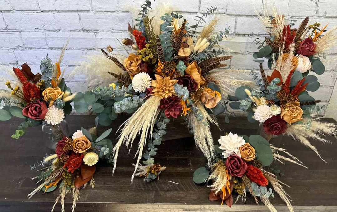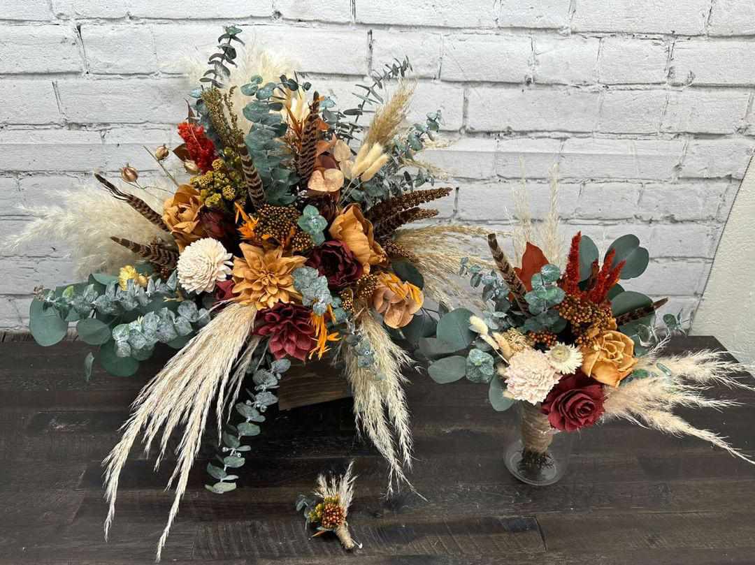 We strive to create every collection as close to the original as possible. These items are hand-crafted. Slight differences from the main photos will occur, as you are not purchasing the photographed items. Your collection is being made to order.. Flower design and fillers may vary due to availability of products.