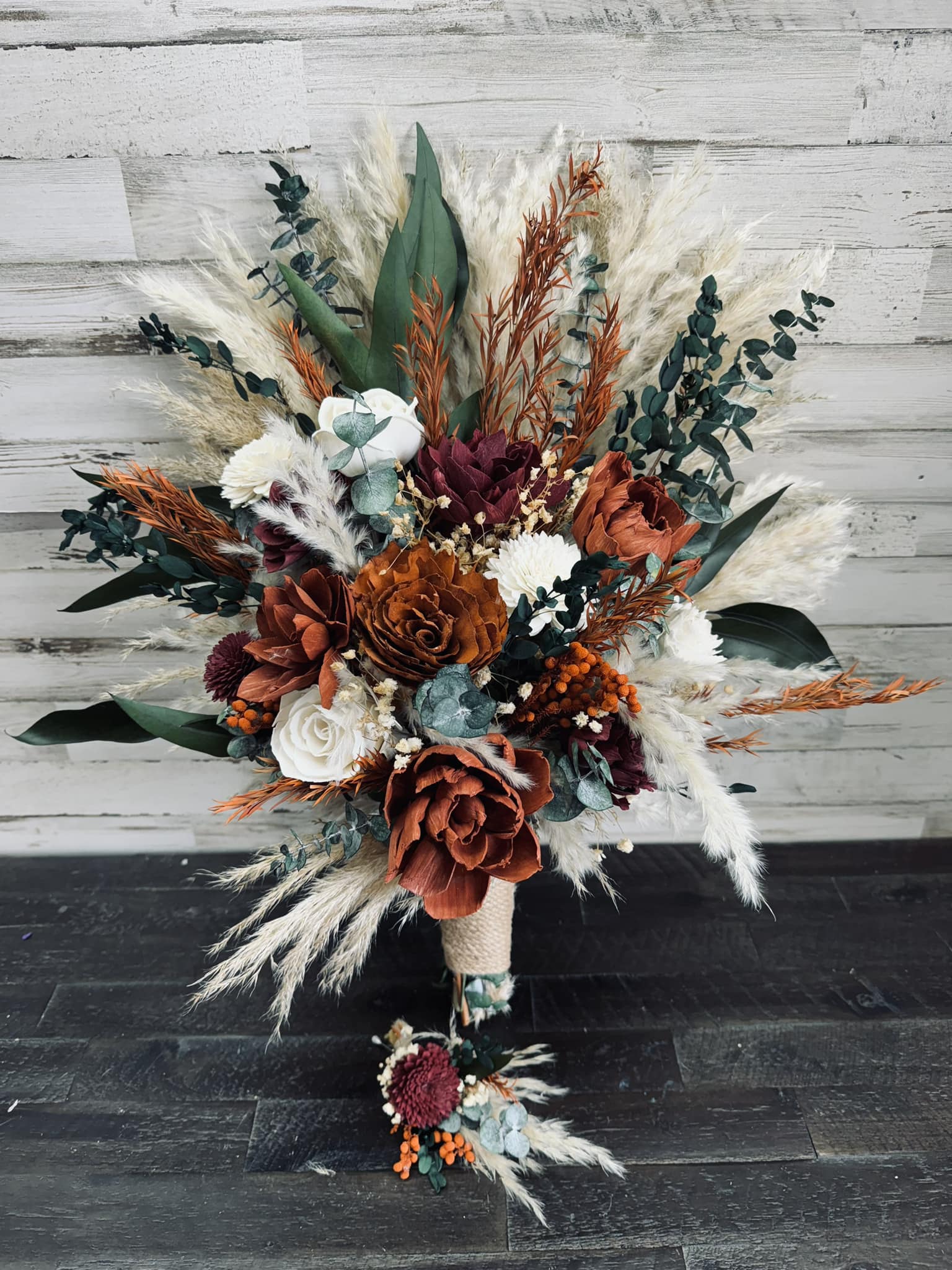Rumors Collection:: Warmth and love radiate from this wonderfully designed bouquet. A collection of hand dyed wood flowers are surrounded by real preserved pampas, several types of eucalyptus, babies' breath, and other natural dried fillers. Elevate your wedding day style with our Rumors Collection, it will have your guests buzzing for years !