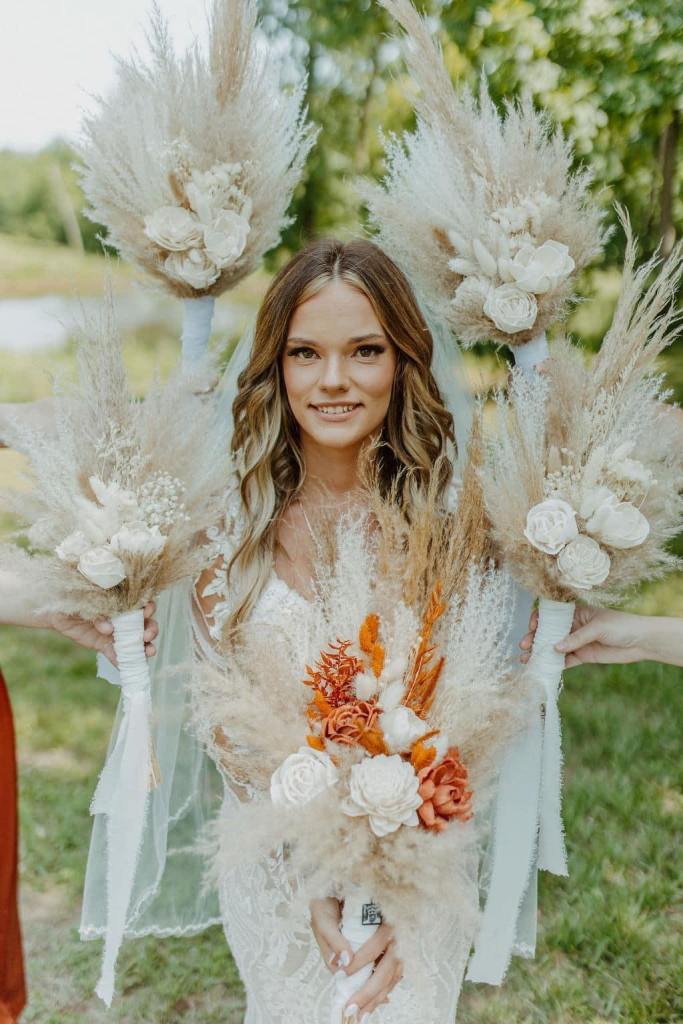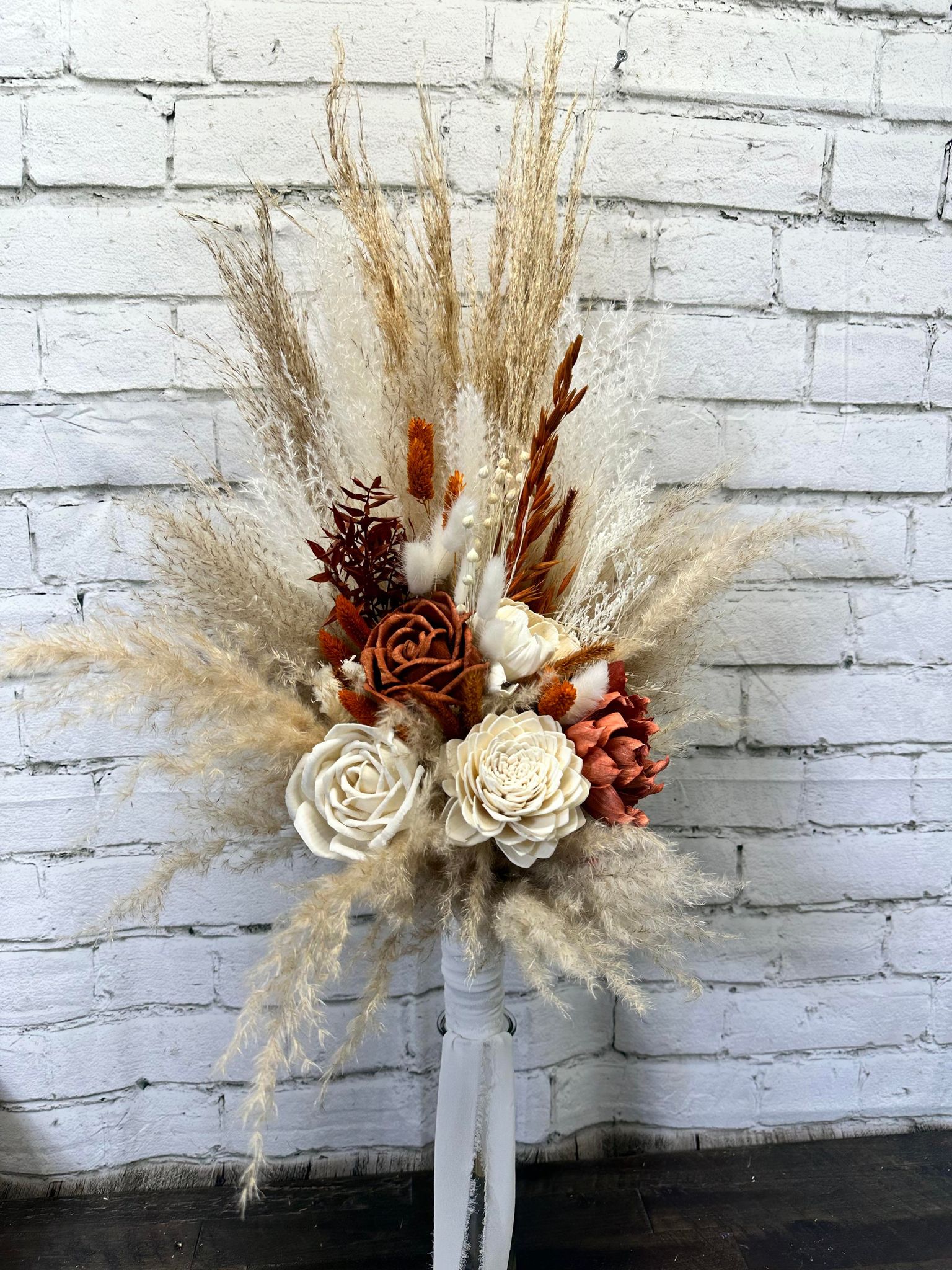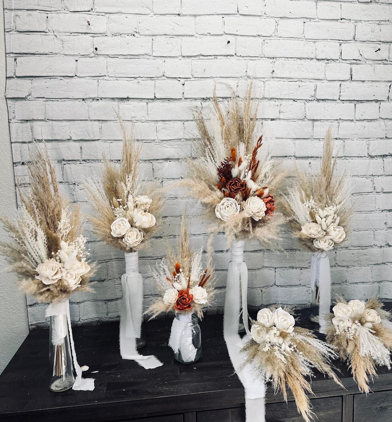 Rustic Towers Collection:: The towering pampas in this bouquet take boho to a new level! With burnt orange highlights, real preserved pampas, babies' breath, bunny tails, ruscus, and natural dried fillers your wedding will POP with warmth!