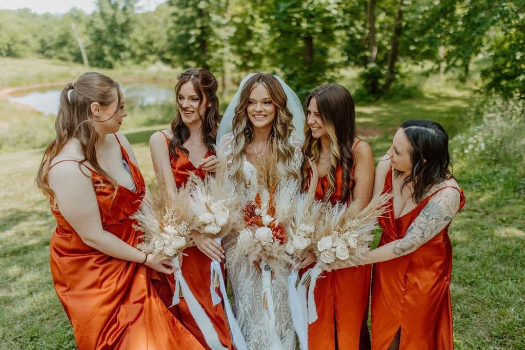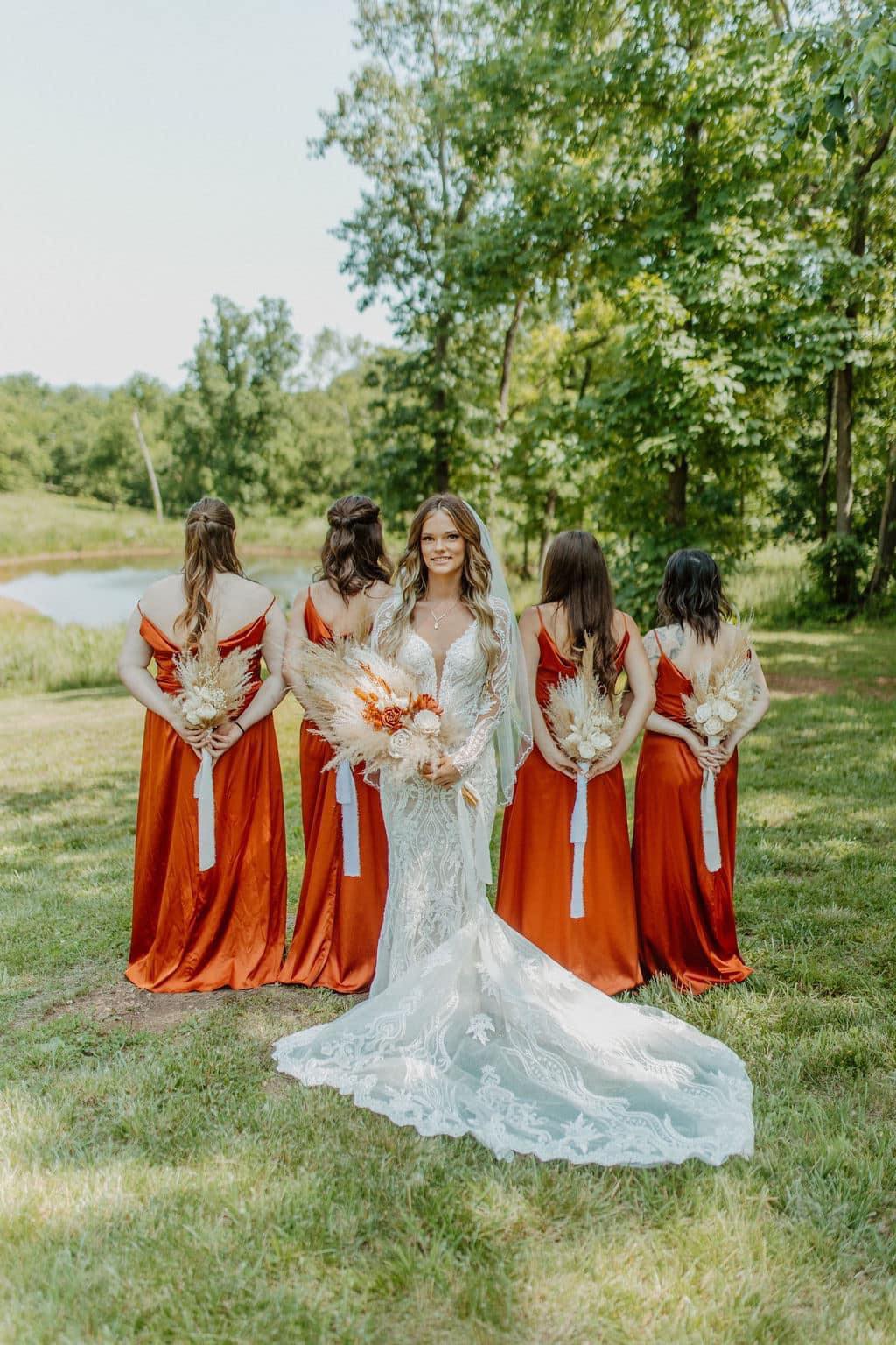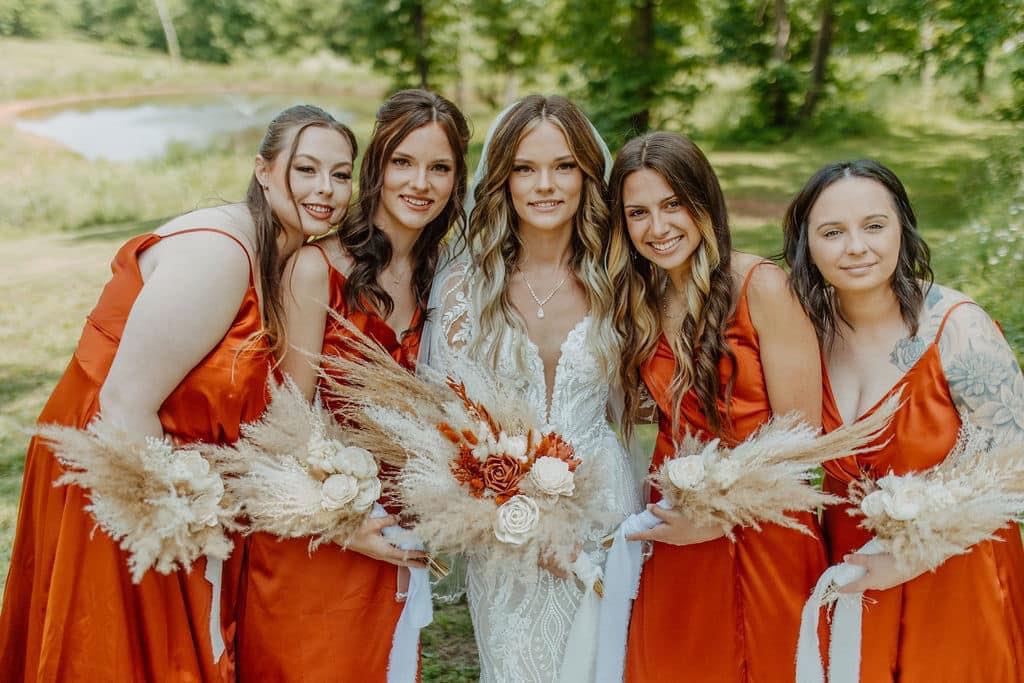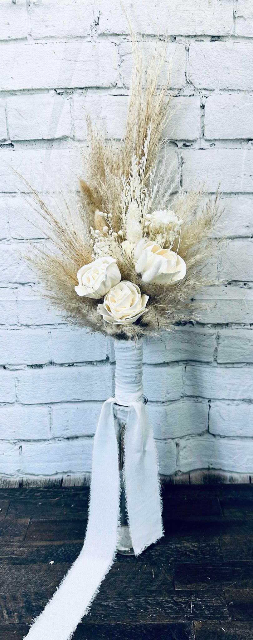 Rustic Towers Collection:: The towering pampas in this bouquet take boho to a new level! With burnt orange highlights, real preserved pampas, babies' breath, bunny tails, ruscus, and natural dried fillers your wedding will POP with warmth!
